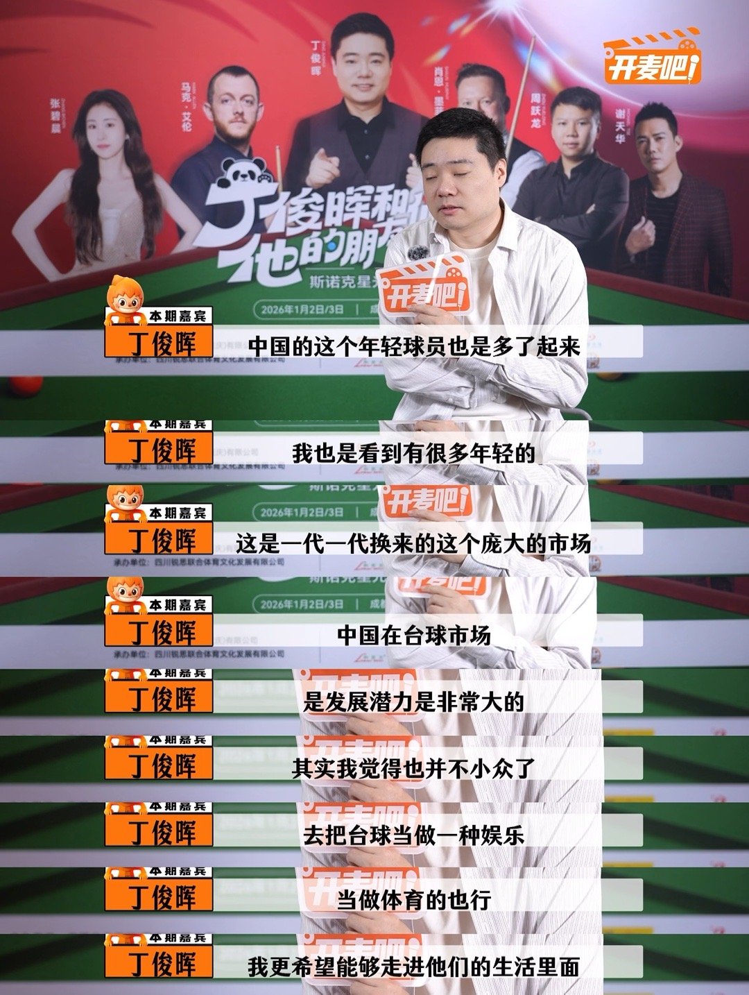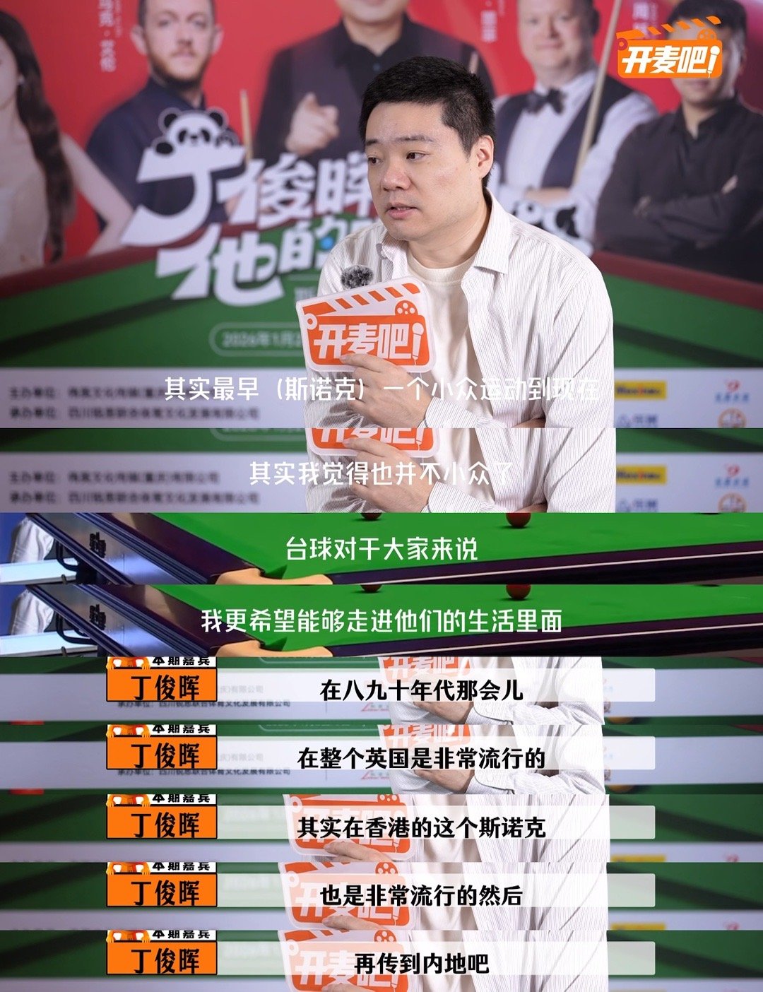 丁俊晖说斯诺克不再小众丁俊晖建议年轻选手专注事业 丁俊晖谈及斯诺克发展时直言这项运动已不再小众,从英港流行到内地普及,年轻球员辈出也撑起了庞大市场。他希望台球能走进大众生活,同时也寄语年轻选手,专注事业才能推动这项运动持续发展,期待斯诺克迎来更多新可能!