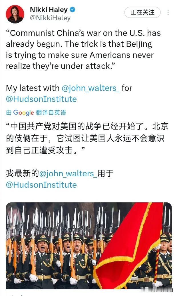 荒唐至极!12月18日,美国前驻联合国大使妮基·黑利发文:“中国共产党对美国的战争已经开始了。北京的伎俩在于,它试图让美国人永远不会意识到自己正遭受攻击。” 说白了,这就是赤裸裸的抹黑中国,只说中国在攻击美国,却没说出从哪里攻击,张口就来的行为,简直滑天下之大稽。 52岁的妮基·黑利不是第一次发表对华极端言论,她的政治生涯里,靠强硬言辞博眼球早已是惯用手段。她曾是特朗普政府时期的驻联合国代表,2023年2月宣布参加2024年美国总统竞选,成为共和党中第一个挑战特朗普的候选人。 尽管2024年3月她因初选失利退出竞选,但始终没放弃维持政治热度。退出前她就曾高调宣称,一旦当选就要让中国成为“历史上的灰烬”,这番言论当时就引发国际社会哗然,也遭到中方强烈谴责。 退出大选后,她依然没收敛,还公开支持台湾加入联合国和世界卫生组织,完全无视一个中国原则,企图分裂中国领土。明眼人都能看出来,她的每一次对华发难,都带着强烈的政治算计。 美国政界向来有“遇事甩锅中国”的传统,尤其是共和党政客,总把中国当“假想敌”讨好选民。之前美国多所高校爆发支持巴勒斯坦的抗议活动,就有政客造谣是中国在背后资助;芬太尼泛滥、疫情防控不力等国内问题,也被他们一次次扣到中国头上。 黑利显然深谙这套操作,她知道对华强硬能吸引保守派选民关注,哪怕言论毫无事实依据,也能收获想要的政治效果。CNN记者曾直白承认,美国媒体就是要刻意抹黑中国,让中国在国际舞台上看起来像“坏蛋”,黑利的言论不过是这种抹黑战略的延续。 可事实根本站不住脚。就在她发文前不久,中美刚敲定2800亿大豆贸易大单,中国未来三年每年会进口超2500万吨美国大豆,解决了美国农民的滞销难题。美国政府也明确表示,暂停对华实施所有新的高科技出口管制,还在考虑放宽芯片出口许可。 这些实打实的合作都说明,中美之间根本不存在所谓“战争”,反而在经贸、农业等多个领域有着深度绑定的共同利益。美国农业部数据显示,2024年美国大豆出口一半都销往中国,失去中国市场对美国农业来说是不可承受之痛。 黑利口中的“中国攻击美国”,从头到尾没有任何具体证据支撑。她只敢喊空洞的口号,却不敢正视中美互利共赢的基本事实,更不敢提及自己为了政治私利,不惜破坏两国关系的真实用心。 国际社会都清楚,中国一直坚持走和平发展道路,始终致力于通过对话协商解决国际争端。而黑利的极端言论,不仅违背事实,还可能加剧两国紧张局势,给全球稳定带来风险。 各位读者你们怎么看?欢迎在评论区讨论。