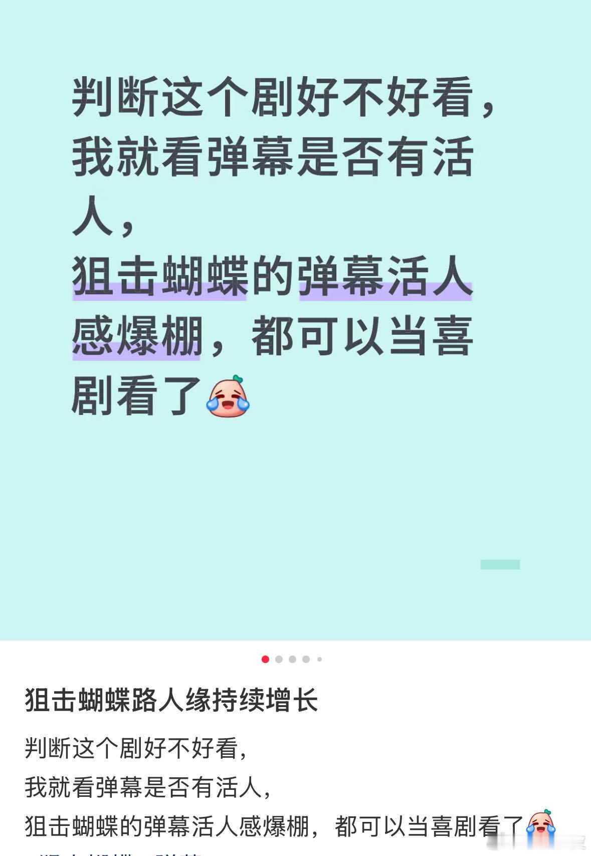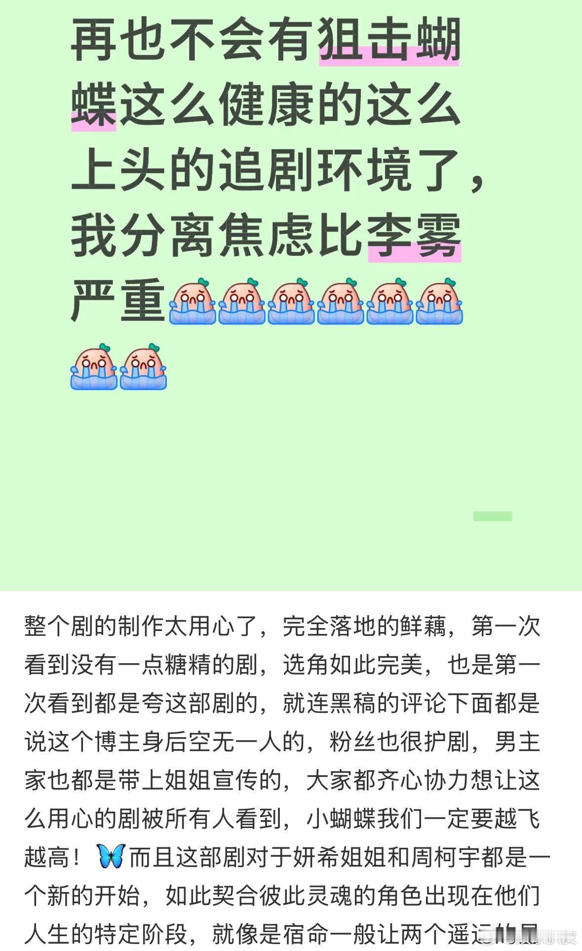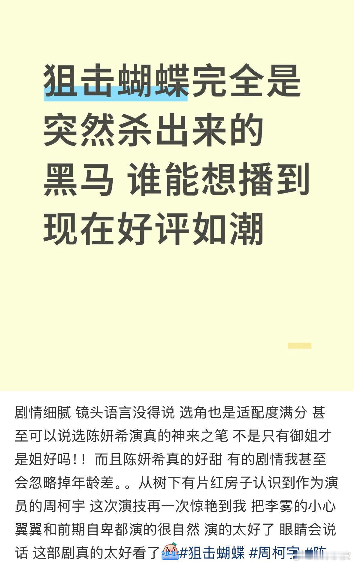 狙击蝴蝶豆瓣开分低了 今年唯一一部不用开二倍速看完的现偶!绝对值得7分以上!看看下沉市场路人的口碑和热度就知道了,们小蝴蝶从人设、CP感、女本位叙事到生活流细节塑造都肉眼可见的用心,我要立刻去豆瓣打五星!