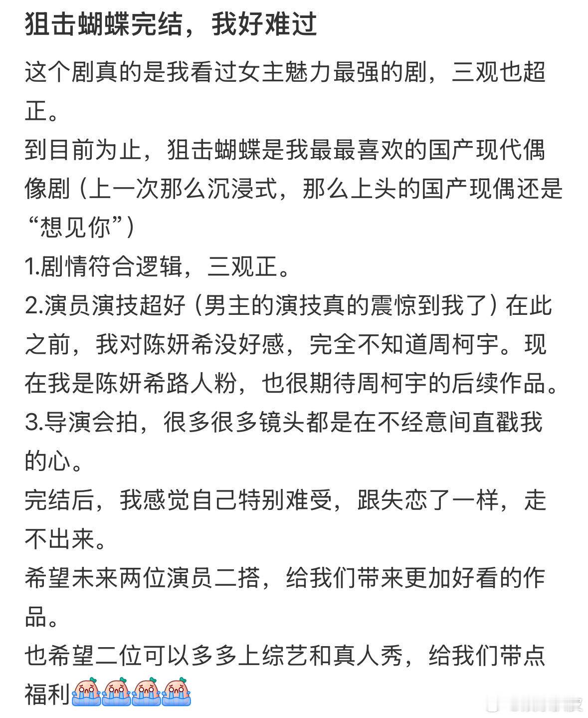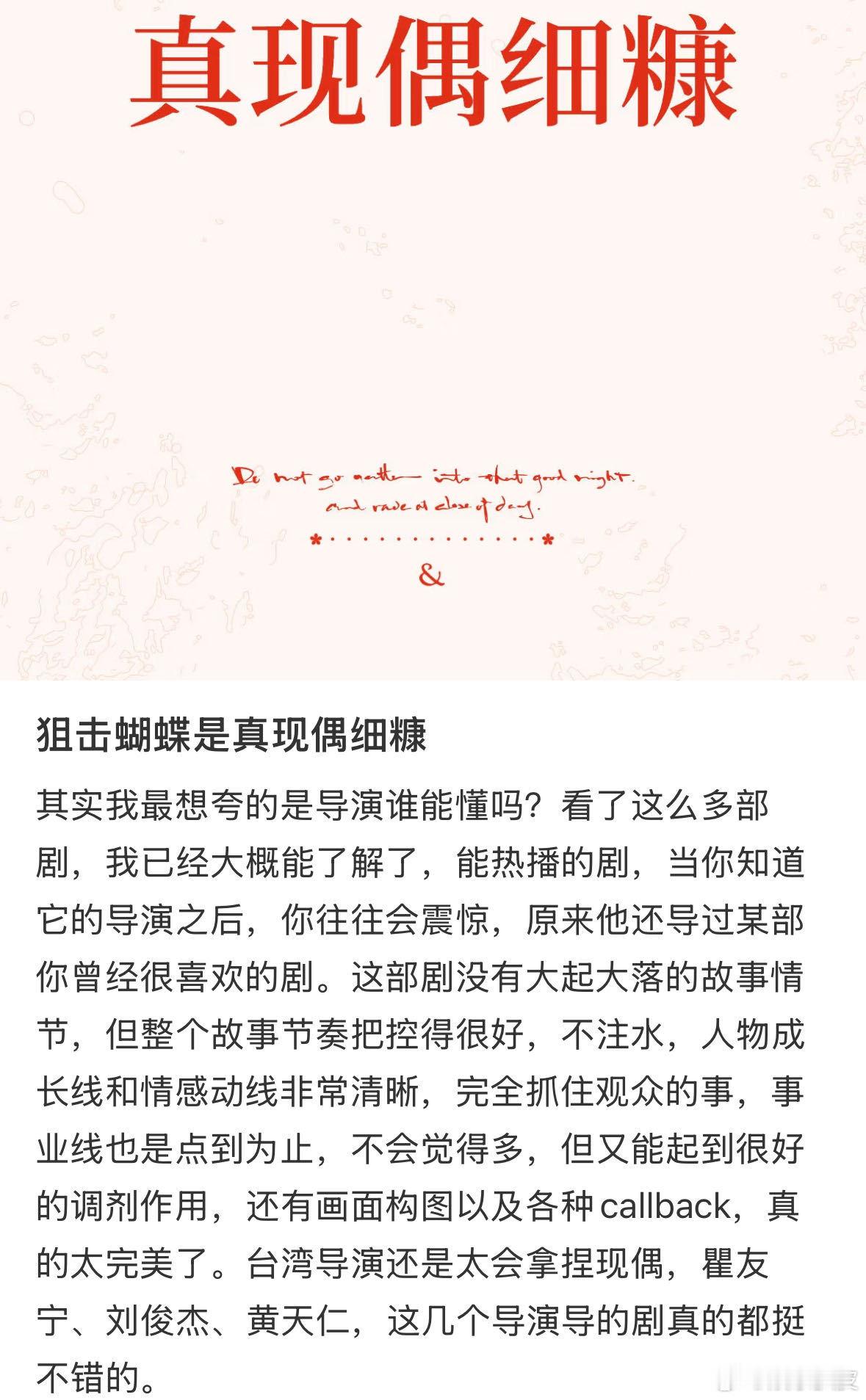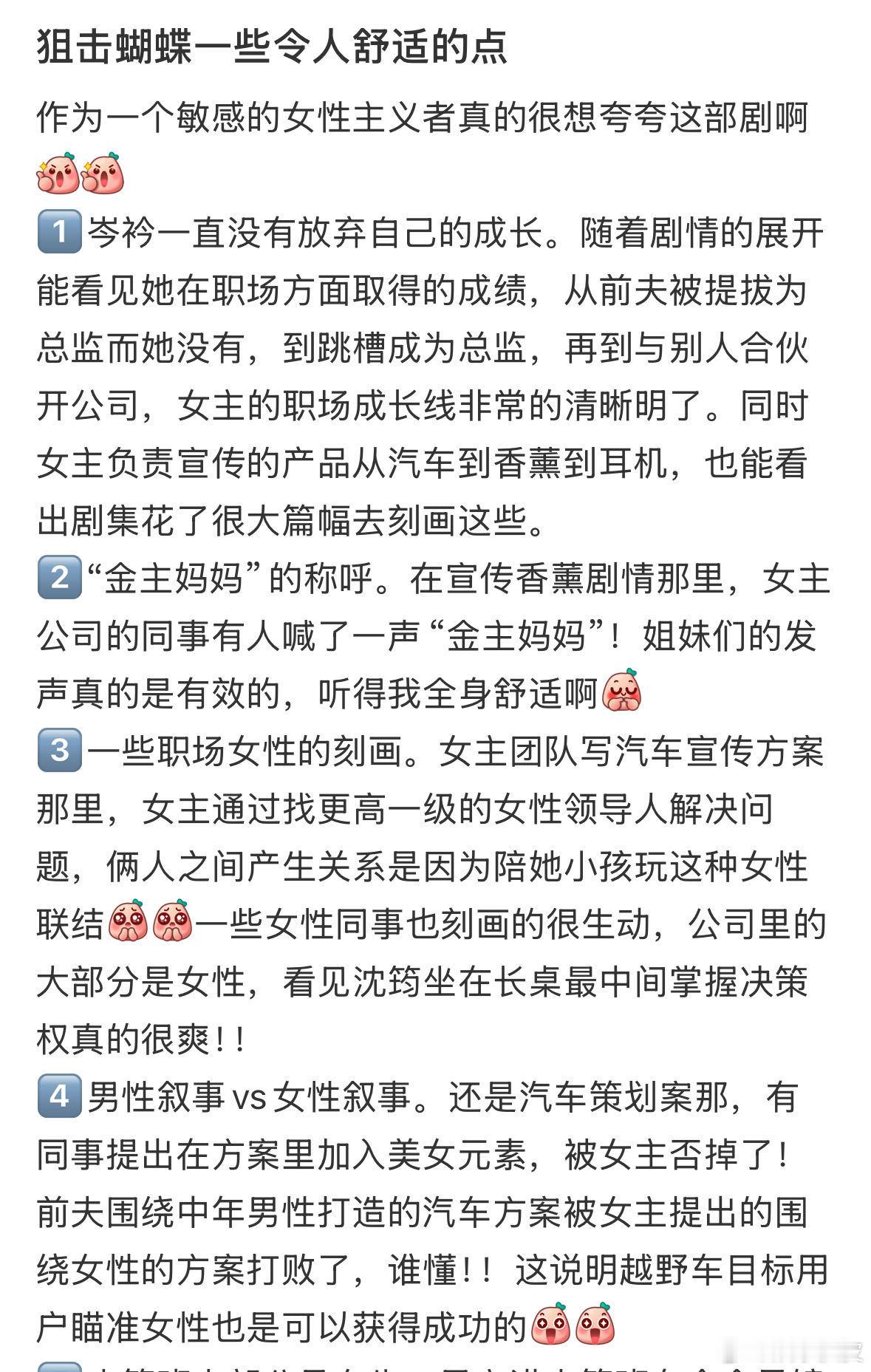 狙击蝴蝶豆瓣开分低了 今年唯一一部不用开二倍速看完的现偶!绝对值得7分以上!看看下沉市场路人的口碑和热度就知道了,们小蝴蝶从人设、CP感、女本位叙事到生活流细节塑造都肉眼可见的用心,我要立刻去豆瓣打五星!