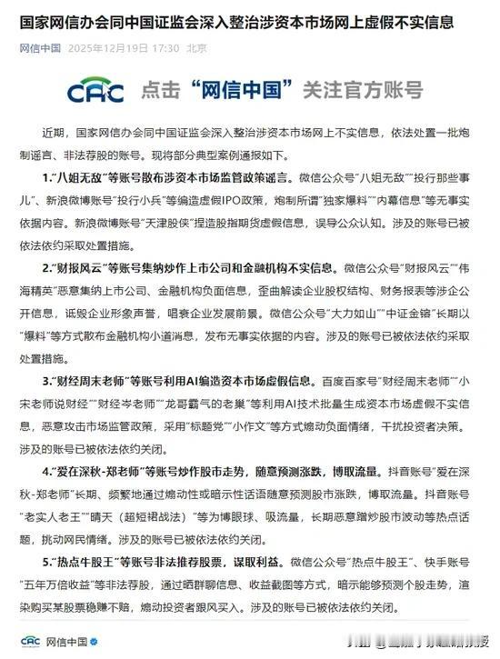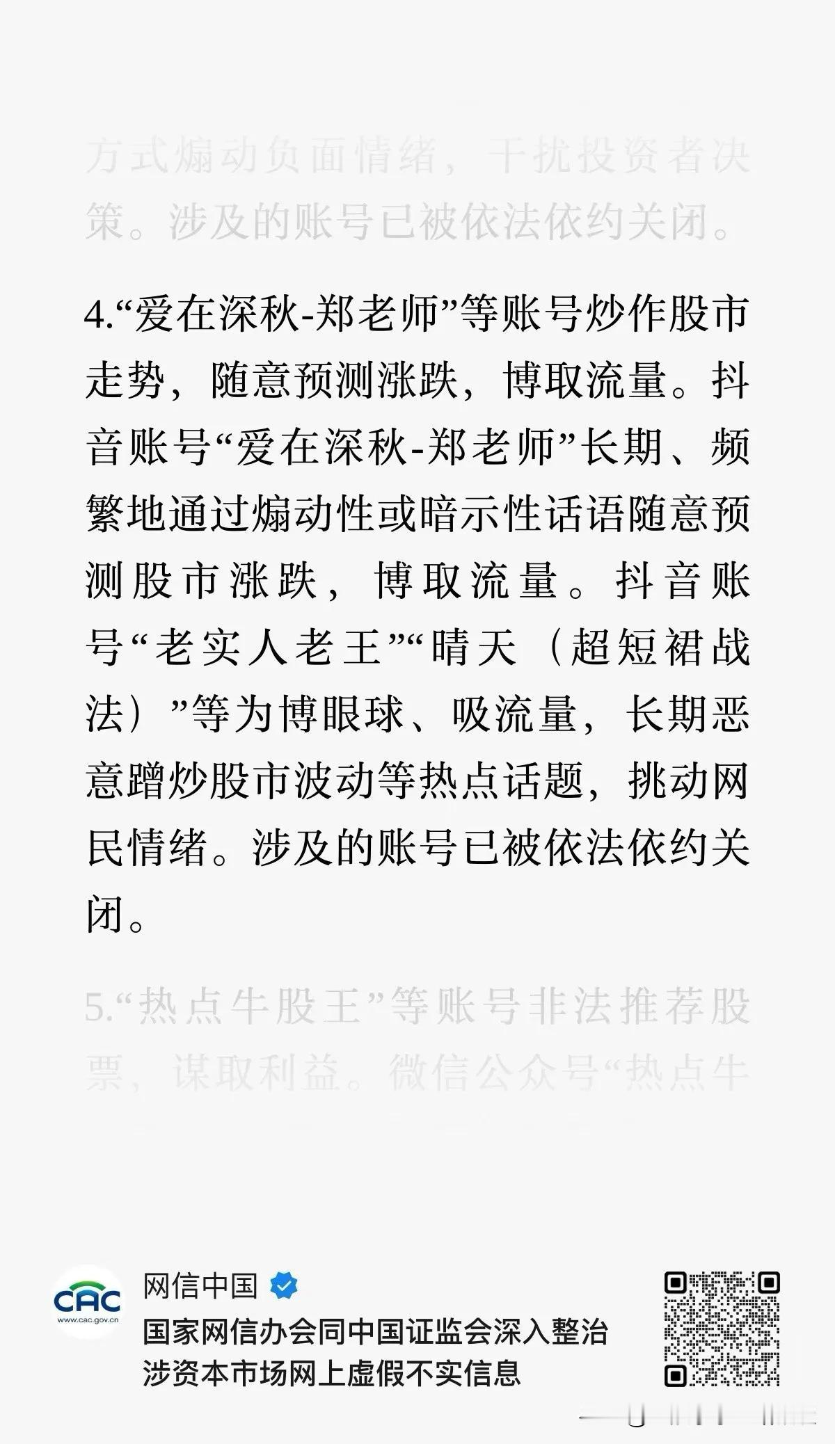 股市和楼市的不合规自媒体账号近期批量处置,释放了什么信号? 近期,北京,深圳,上海政府纷纷出手治理唱衰楼市,散布虚假信息的自媒体账号,今天,网信办和证监会也出手了,处置一批传播资本市场虚假信息,扰乱资本市场秩序的“股市黑嘴”的自媒体账号。包括人气很旺的“上海爷叔”,把他定性为“博眼球,吸流量,长期蹭炒股市波动等热点话题挑动网民情绪”。 股市和楼市都是我国经济的基本盘,容不得“黑嘴”煽风点火、虚假信息搅局。此次,国家先后出手整治自媒体账号,正是给市场舆论“降噪”、为预期“稳锚”。 只有清朗的网络环境才能让真实信号传递,既护楼市平稳发展,也保资本市场有序运行,最终目的还是为了守护老百姓的钱袋子,不要让错误信息干扰老百姓的正确判断。