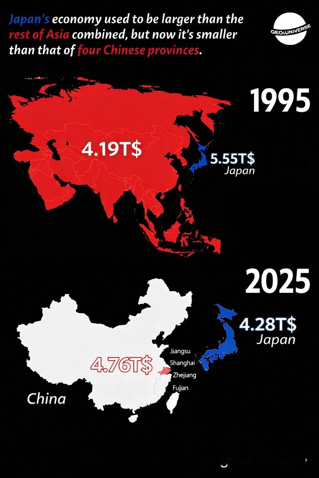 日本经济规模从几乎超越美国成为世界最大经济体,下降到甚至小于中国四个省份。