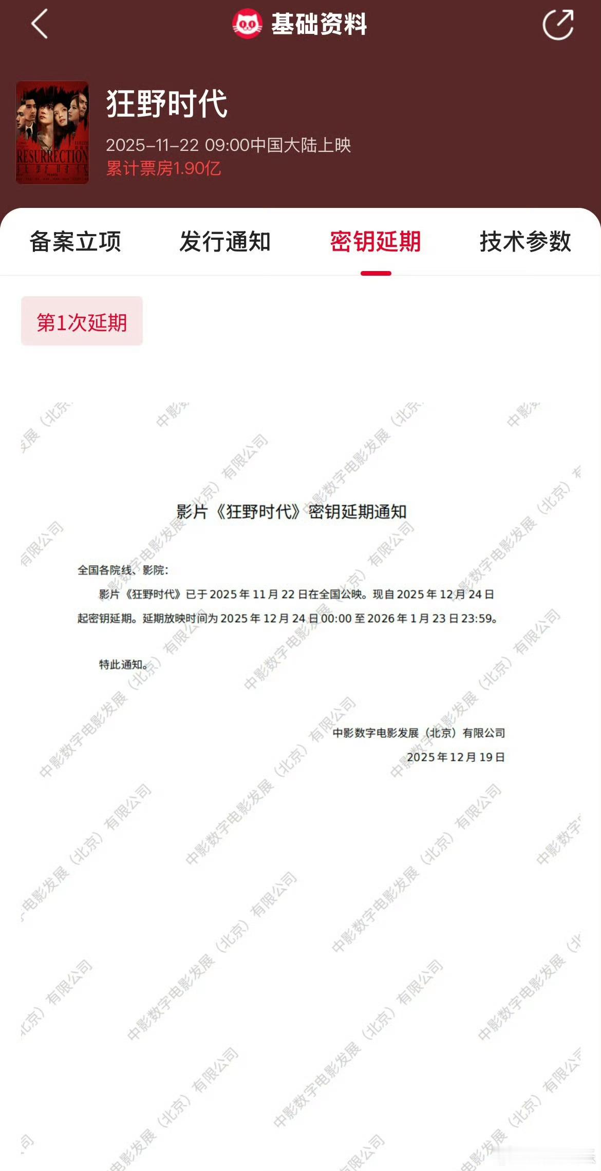 狂野时代延长上映至1月23日 据猫眼专业版数据,易烊千玺、舒淇领衔主演电影《狂野时代》密钥延期,延长上映至2026年1月23日,截至当前累计票房已超1.90亿。狂野时代密钥延期
