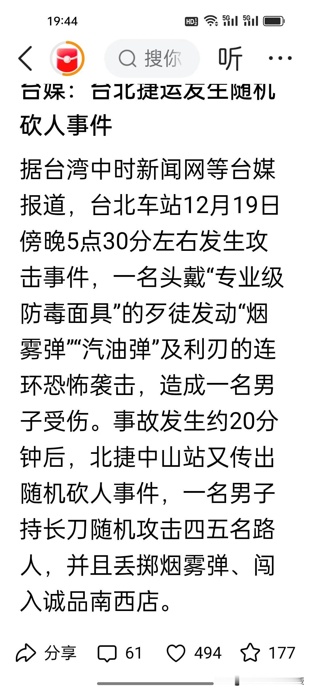 刚刚,台北捷运接连爆两起恶性伤人案件,巧合背后藏隐忧! 今天下午五点半,台北车站遭人用烟雾弹、汽油弹袭击伤人,才过20分钟,中山站又有人持刀随机砍人,还闯了诚品店! 接连出事的时间也太巧了,都是在下班高峰期,很难不怀疑是蓄谋已久的团伙连环作案! 之前日本被曝光也有这样的年轻人持器械在街上随机伤人事件,这类恶性治安事件的发生,绝非偶然。不知道这些人犯罪的动机是什么? 不过,民进党当局长期漠视民生与社会治安治理,施政不得人心,导致社会矛盾不断激化,最终让普通民众承受安全风险。希望相关方尽快彻查案件,尤其是捷运等交通运输枢纽的安检必须要加强,更要反思这背后的社会治理漏洞,“得民心”太重要!