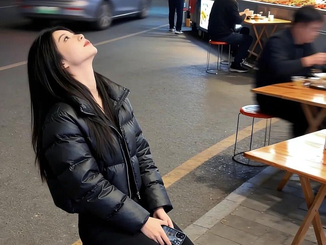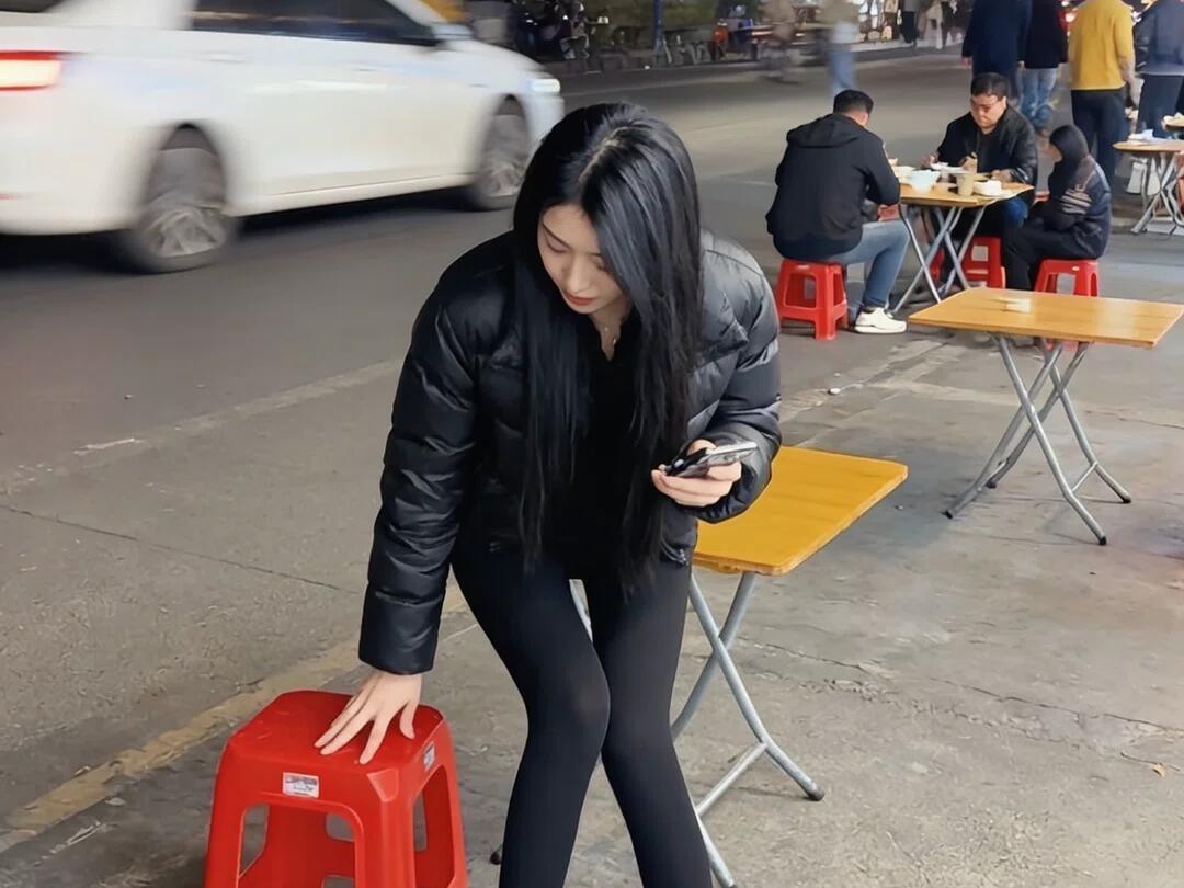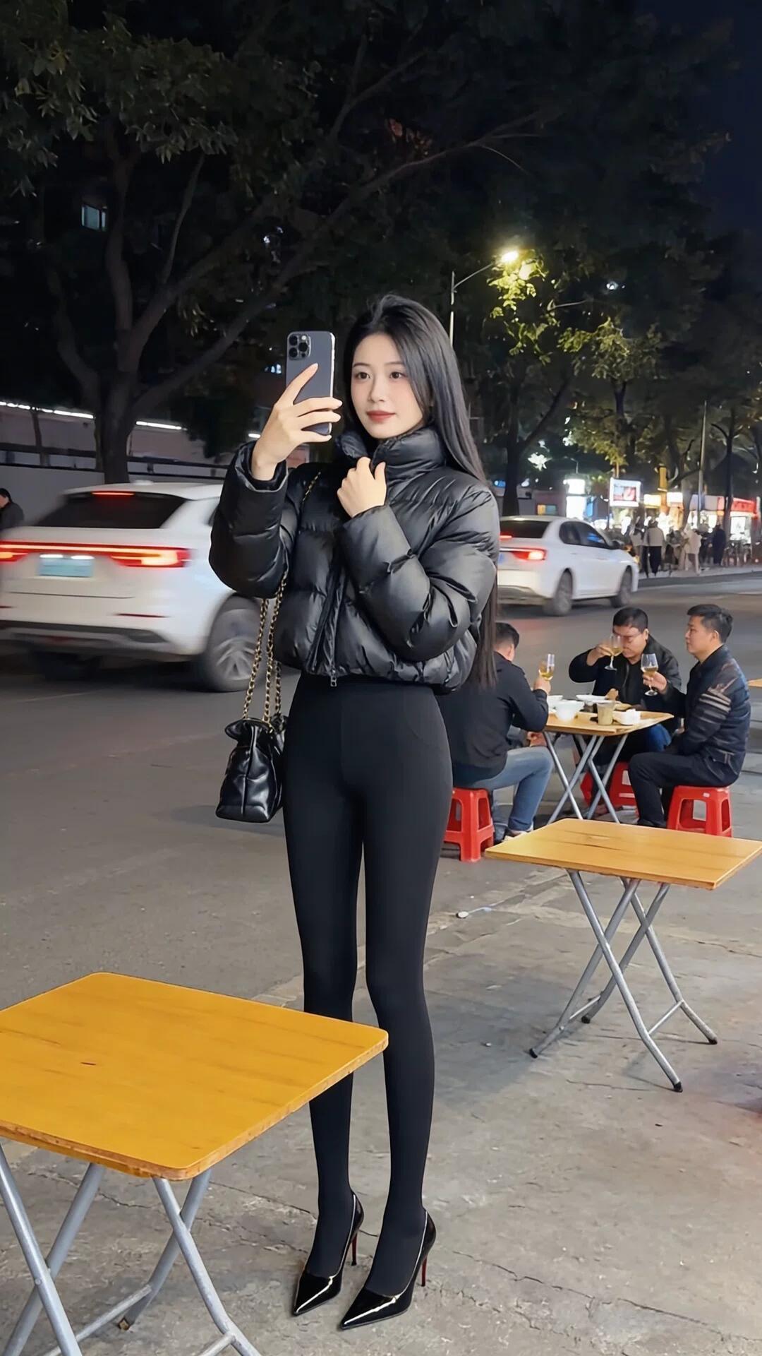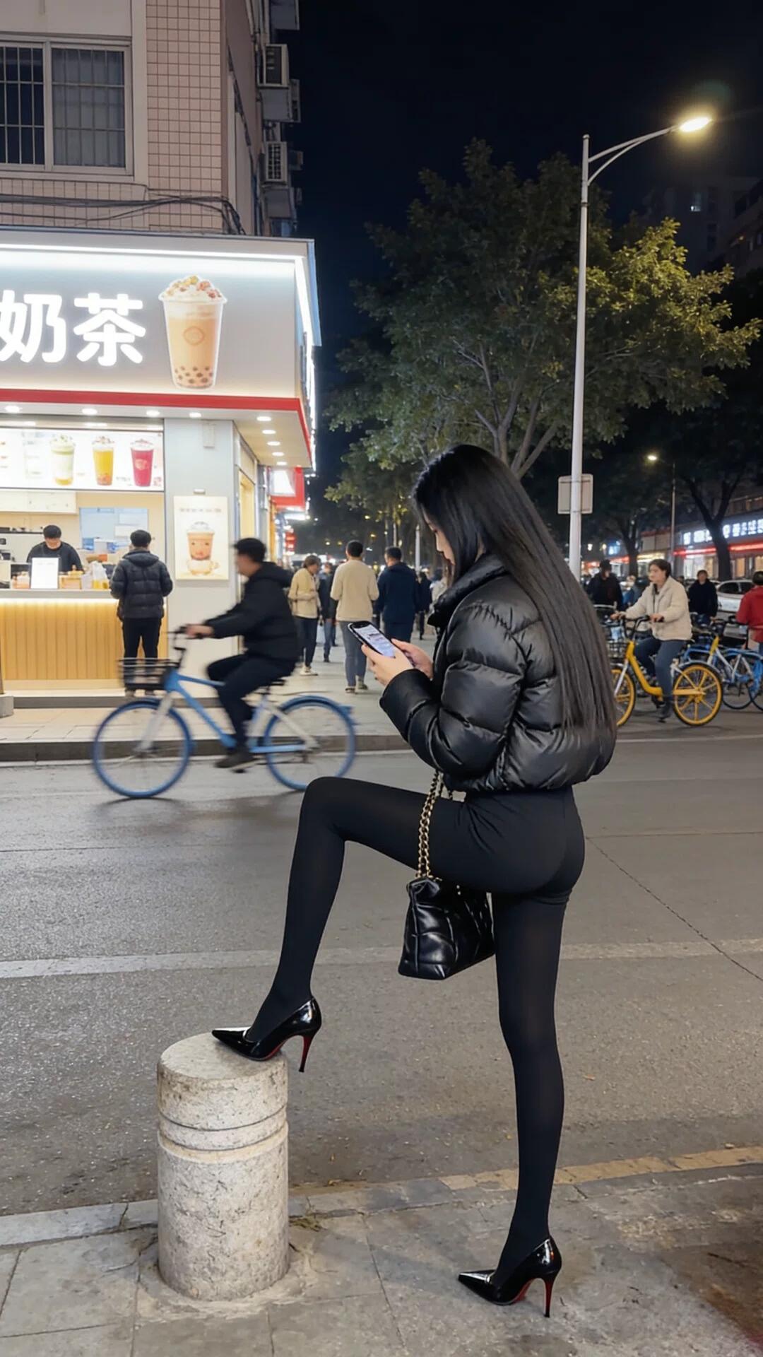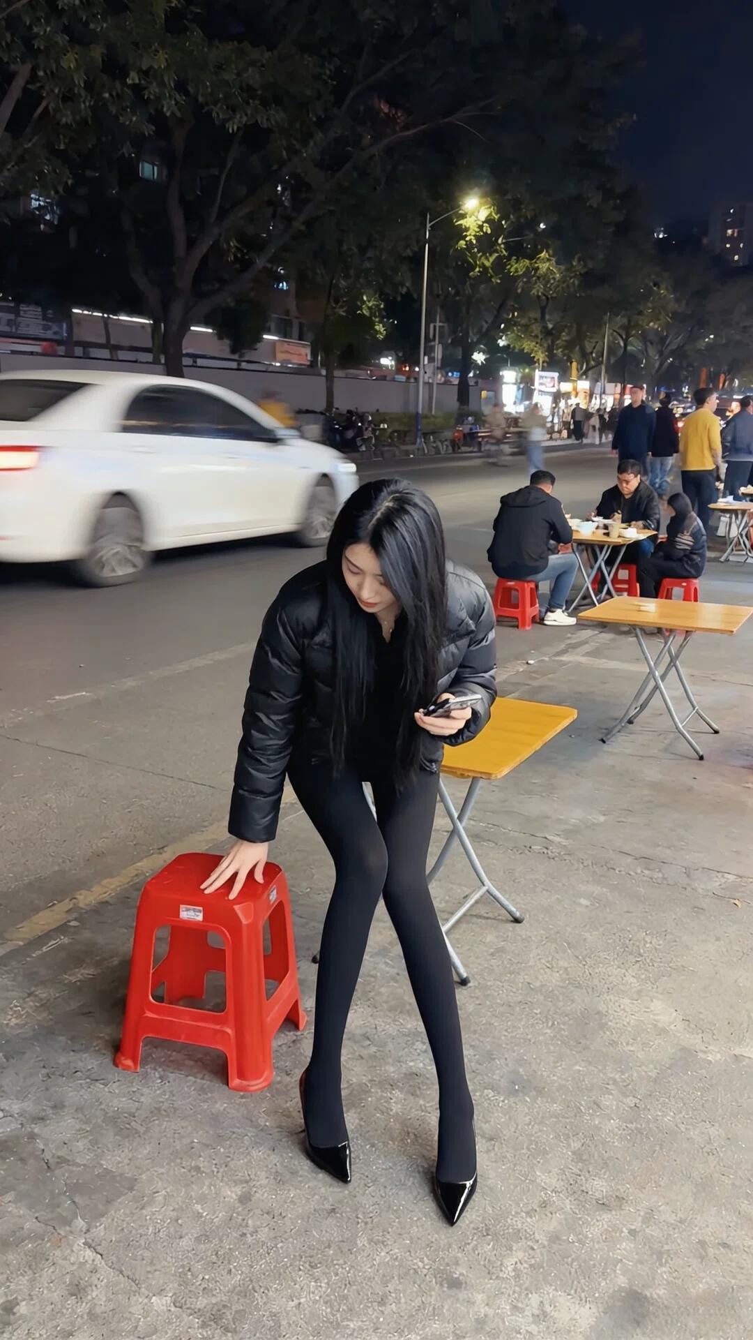 沁园春·夜街偶见 华灯初上,长街沸攘,夜色如绸。看路侧摊前,红凳木桌,人声熙攘,车影悠游。奶茶灯明,食摊香漫,市井烟火惹眼眸。佳人立,着玄衣短袄,纤影如柳。 轻抬玉手凝眸,举手机、自拍留清柔。或坐石墩闲倚,仰首望星;或扶红凳微倾,步履娇柔。踏柱凝思,触屏低顾,一袭黑丝衬细趺。红尘里,把寻常巷陌,化作风流。