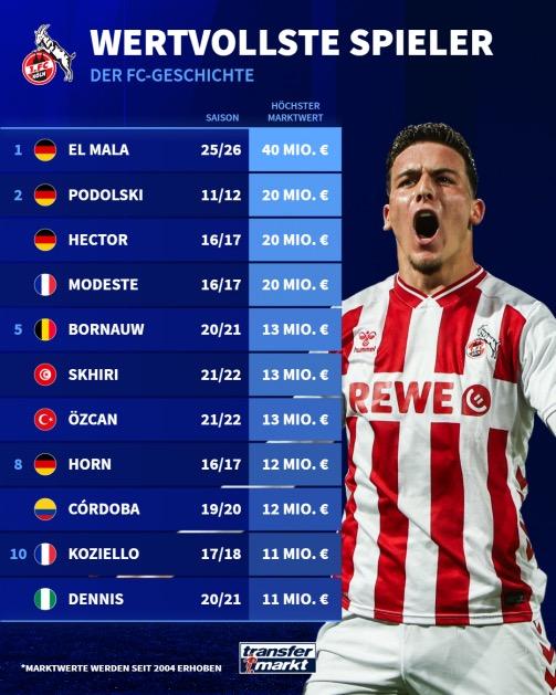 19岁小将埃尔马拉身价暴涨2200万后达到4000万欧,超越波多尔斯基、赫克托和莫德斯特等名将,成为科隆队史身价最高球员。