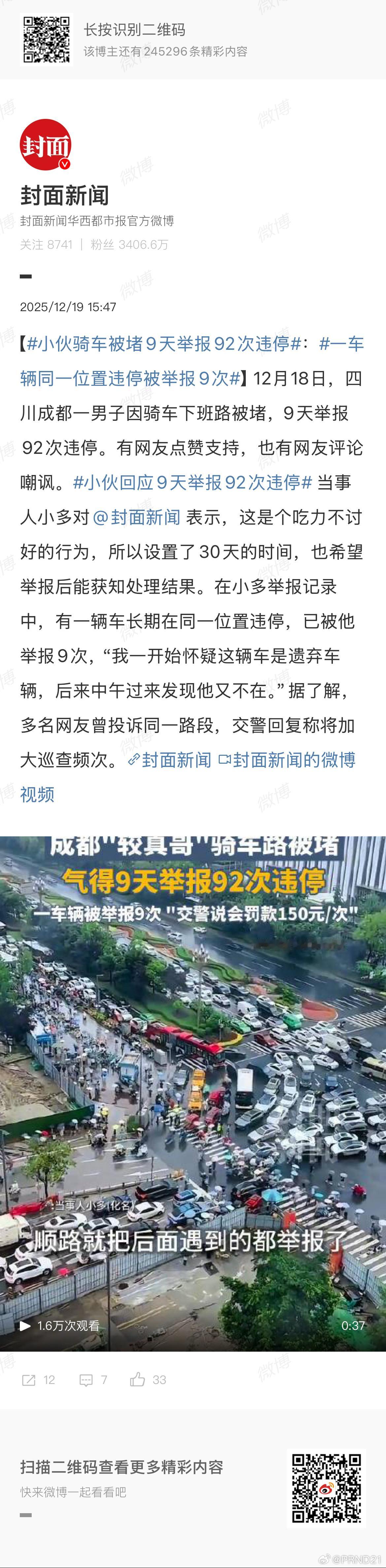小伙骑车被堵9天举报92次违停 违章停车被举报理所应当,为什么会有人嘲讽,估计它就是那个违章停车的“大聪明”吧?我也时不时就举报违章停车,北京这个举报机制是没有奖金一说的,但违章者受到惩罚,路因此少了一些阻碍,我觉得这个收益非常好,我很开心……