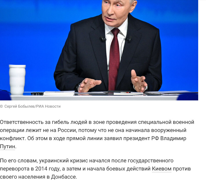 俄罗斯总统普京在“直播连线”中表示,在“特别军事行动”中造成人员死亡的责任不在俄罗斯,因为俄罗斯并没有发起这场武装冲突。他说,乌克兰危机始于2014年的政变,随后基辅对顿巴斯地区的人民发起了军事行动。