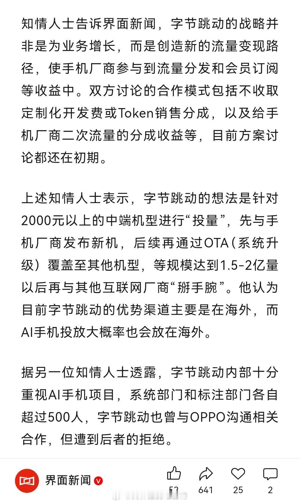 字节跳动和vivo合作确认了?也是件好事儿,vivo确实很看好AI,之前投入不少做AI。我之前说不看好vivo搞AI,看来他们确实也没做的很好,与字节联合也是好事儿,最省钱的方式尝试下可能性。我依然不看好豆包手机这种模式,但是尝试一下总是好的,万一真找到了好的方案呢,对吧,同样我也不认为海外有啥优势,隐私数据这块欧盟管的最严。