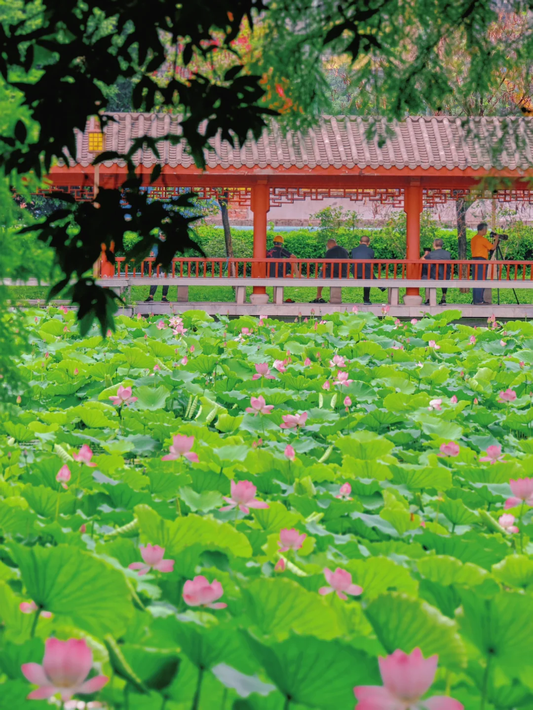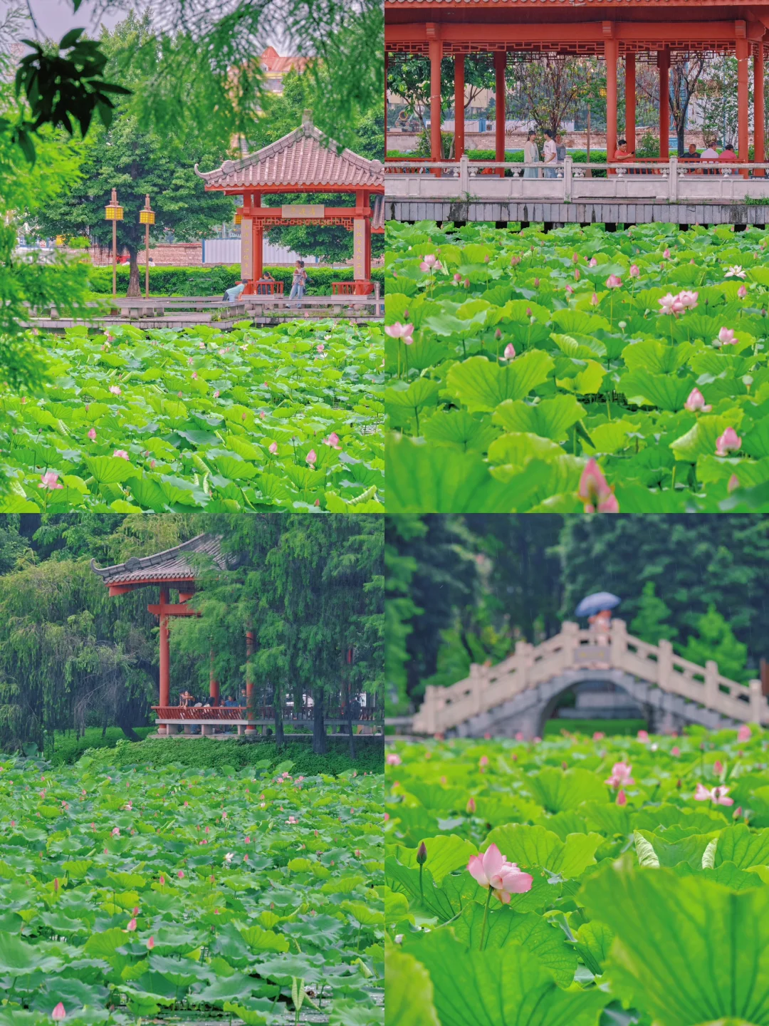 踏入公园,首先映入眼帘的便是那一大片碧波荡漾的荷塘🪷🪷微风吹过,荷叶如同海浪翻滚。远处的红色凉亭和石拱桥为这场景增添了一丝韵味