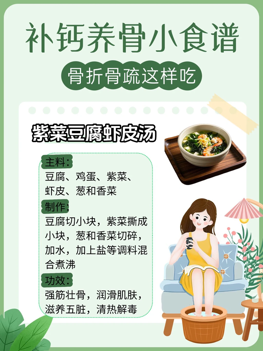 👉🏻家人们,骨折或者骨密度低的朋友一定要重视日常饮食!这几款汤,简单易做,补钙养骨超给力👍🏻 🥣紫菜豆腐虾皮汤:紫菜提鲜,豆腐嫩滑,虾皮更是“钙库”,煮一锅,暖身又补钙✊🏻 🥣乌豆排骨汤:乌豆补肾,排骨富含蛋白质,小火慢炖,营养全在汤里🔆 🥣猪骨黄豆汤:猪骨熬出奶白汤汁,黄豆满满植物蛋白,香浓好喝,强骨又健体‼️ 日常多喝这些汤,给骨骼“加油”,快快收藏做起来吧💯