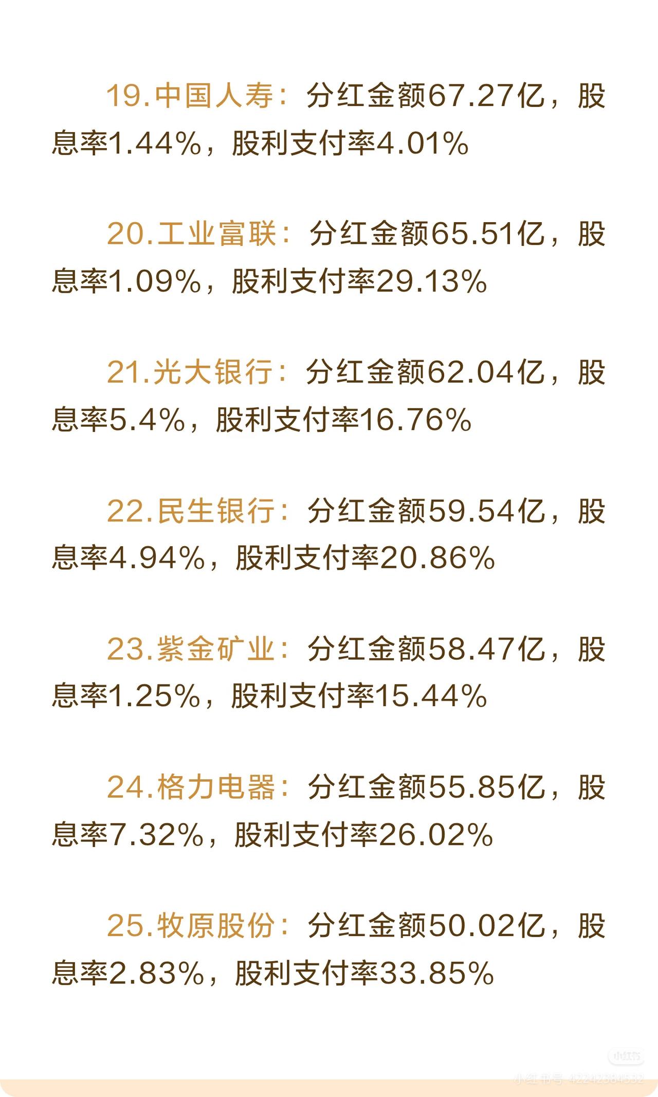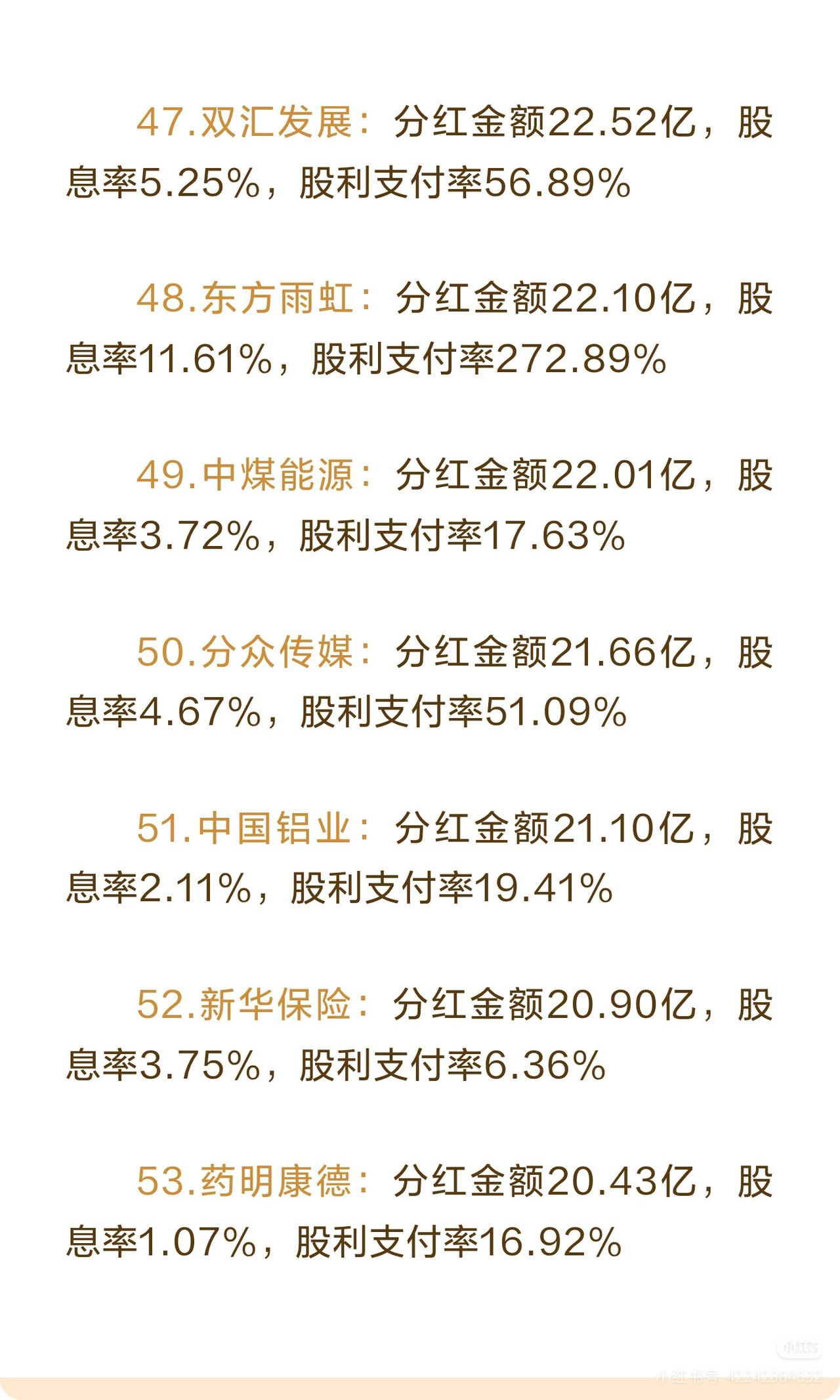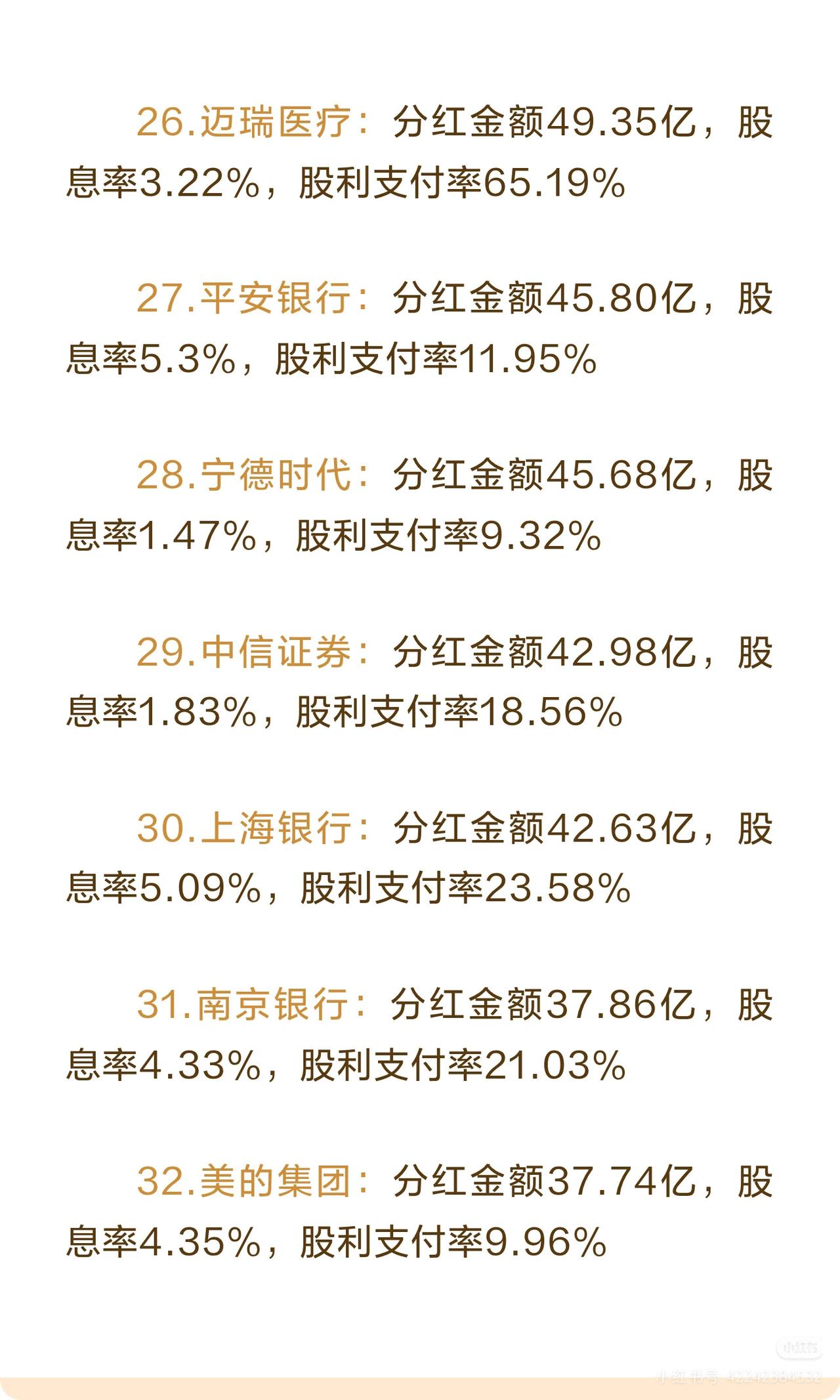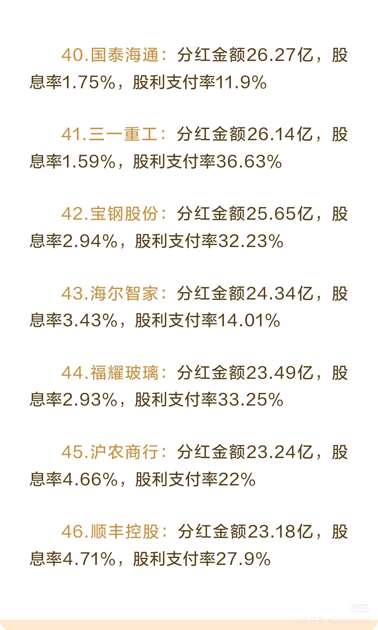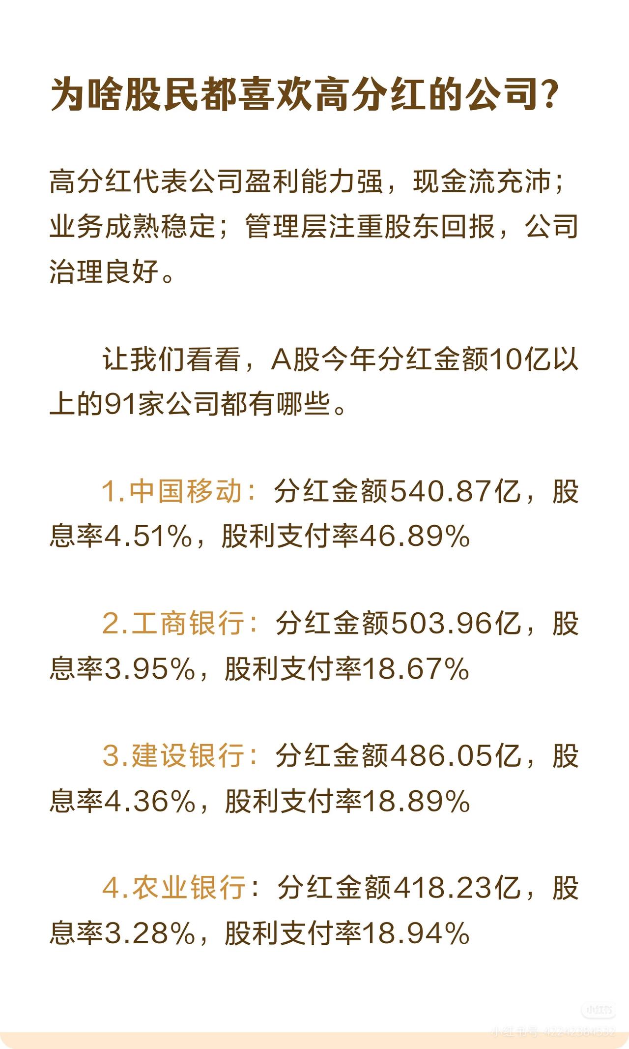 “真豪!A股分红最多的91公司 分红都在10亿以上” 前四名均为大型金融与通信央企,分红金额遥遥领先: - 中国移动,分红540.87亿元,股息率4.51%,股利支付率46.89%; - 工商银行,分红503.96亿元,股息率3.95%,股利支付率18.67%; - 建设银行,分红486.05亿元,股息率4.36%,股利支付率18.89%; - 农业银行,分红418.23亿元,股息率3.28%,股利支付率18.94%。 第5至11名包括石油、银行、能源、白酒等领域龙头: 中国石油402.65亿元(股息率4.92%、支付率31.89%),中国银行352.50亿元(股息率3.96%、支付率19.84%),中国海油316.61亿元(股息率4.58%、支付率31.05%),贵州茅台300.01亿元(股息率3.63%、支付率46.42%),中国神华194.71亿元(股息率5.63%、支付率49.86%),中国平安172.02亿元(股息率3.81%、支付率12.95%),中国电信165.81亿元(股息率3.88%、支付率53.88%)。 第12至18名涵盖多家银行、石化、酒类与航运龙头: 邮储银行147.72亿元(股息率4.04%、支付率19.29%),交通银行138.11亿元(股息率4.38%、支付率19.73%),兴业银行119.57亿元(股息率5.19%、支付率18.95%),中国石化106.62亿元(股息率4.93%、支付率35.56%),中信银行104.61亿元(股息率4.75%、支付率19.59%),五粮液100.07亿元(股息率5.08%、支付率46.52%),中远海控86.74亿元(股息率10.46%、支付率32.04%)。 第19至25名出现保险、制造、家电、养殖等板块: 中国人寿67.27亿元(股息率1.44%、支付率4.01%),工业富联65.51亿元(股息率1.09%、支付率29.13%),光大银行62.04亿元(股息率5.4%、支付率16.76%),民生银行59.54亿元(股息率4.94%、支付率20.86%),紫金矿业58.47亿元(股息率1.25%、支付率15.44%),格力电器55.85亿元(股息率7.32%、支付率26.02%),牧原股份50.02亿元(股息率2.83%、支付率33.85%)。 第26至32名涉及医疗、新能源、证券、银行与家电: 迈瑞医疗49.35亿元(股息率3.22%、支付率65.19%),平安银行45.80亿元(股息率5.3%、支付率11.95%),宁德时代45.68亿元(股息率1.47%、支付率9.32%),中信证券42.98亿元(股息率1.83%、支付率18.56%),上海银行42.63亿元(股息率5.09%、支付率23.58%),南京银行37.86亿元(股息率4.33%、支付率21.03%),美的集团37.74亿元(股息率4.35%、支付率9.96%)。 第33至39名覆盖安防、通信、保险、制造、食品饮料与城商行: 海康威视36.66亿元(股息率2.45%、支付率39.34%),中国联通34.77亿元(股息率3.09%、支付率39.63%),中国人保33.17亿元(股息率2.06%、支付率7.08%),中国中车31.57亿元(股息率3.1%、支付率31.68%),潍柴动力31.01亿元(股息率4.12%、支付率34.94%),伊利股份30.36亿元(股息率4.21%、支付率29.12%),杭州银行27.55亿元(股息率3.84%、支付率17.34%)。 第40至46名包括券商、制造、钢铁、家电、玻璃、银行与物流: 国泰海通26.27亿元(股息率1.75%、支付率11.9%),三一重工26.14亿元(股息率1.59%、支付率36.63%),宝钢股份25.65亿元(股息率2.94%、支付率32.23%),海尔智家24.34亿元(股息率3.43%、支付率14.01%),福耀玻璃23.49亿元(股息率2.93%、支付率33.25%),沪农商行23.24亿元(股息率4.66%、支付率22%),顺丰控股23.18亿元(股息率4.71%、支付率27.9%)。 第47至53名涉及食品、建材、能源、传媒、有色、保险与医药: 双汇发展22.52亿元(股息率5.25%、支付率56.89%),东方雨虹22.10亿元(股息率11.61%、支付率272.89%),中煤能源22.01亿元(股息率3.72%、支付率17.63%),分众传媒21.66亿元(股息率4.67%、支付率51.09%),中国铝业21.10亿元(股息率2.11%、支付率19.41%),新华保险20.90亿元(股息率3.75%、支付率6.36%),药明康德20.43亿元(股息率1.07%、支付率16.92%)。