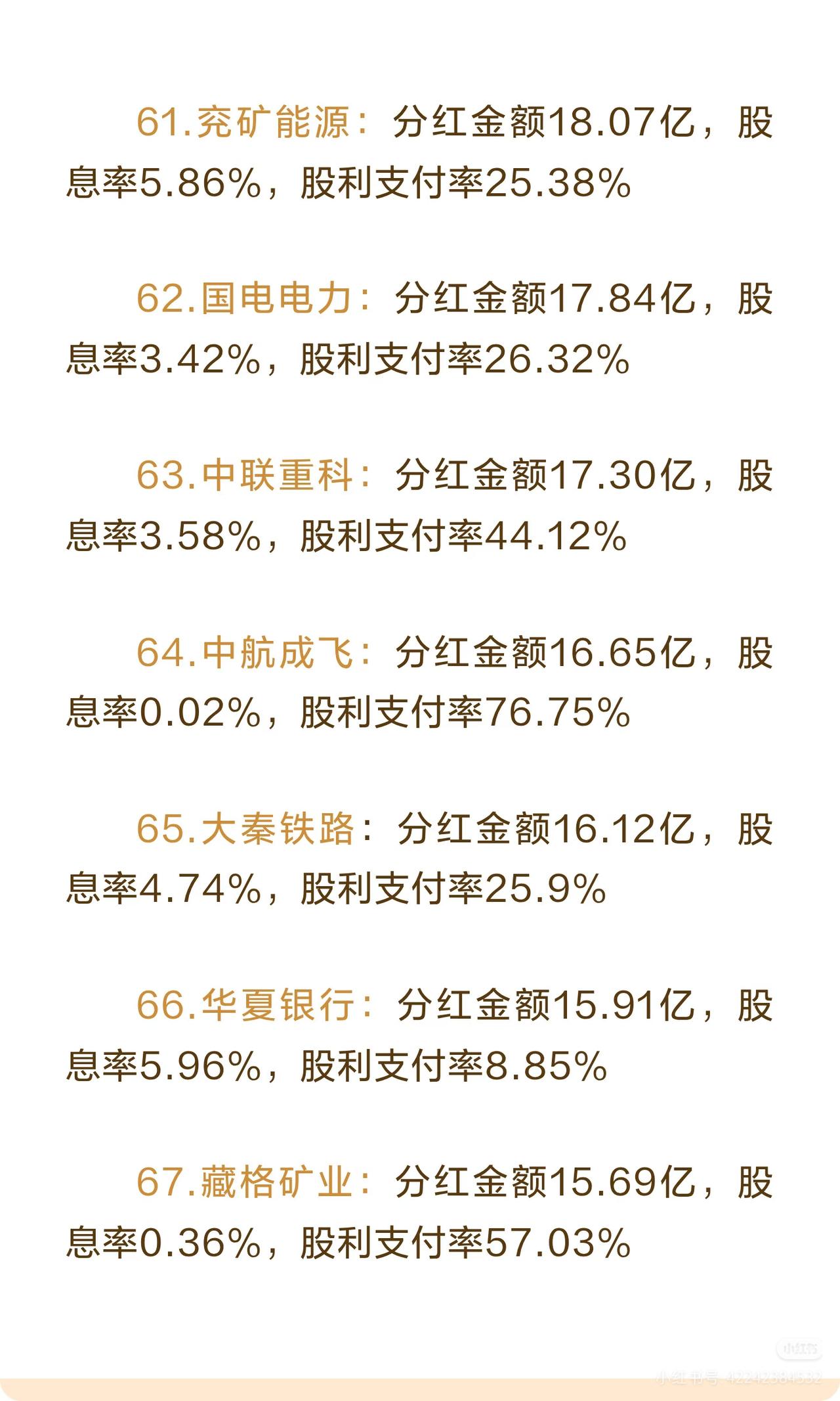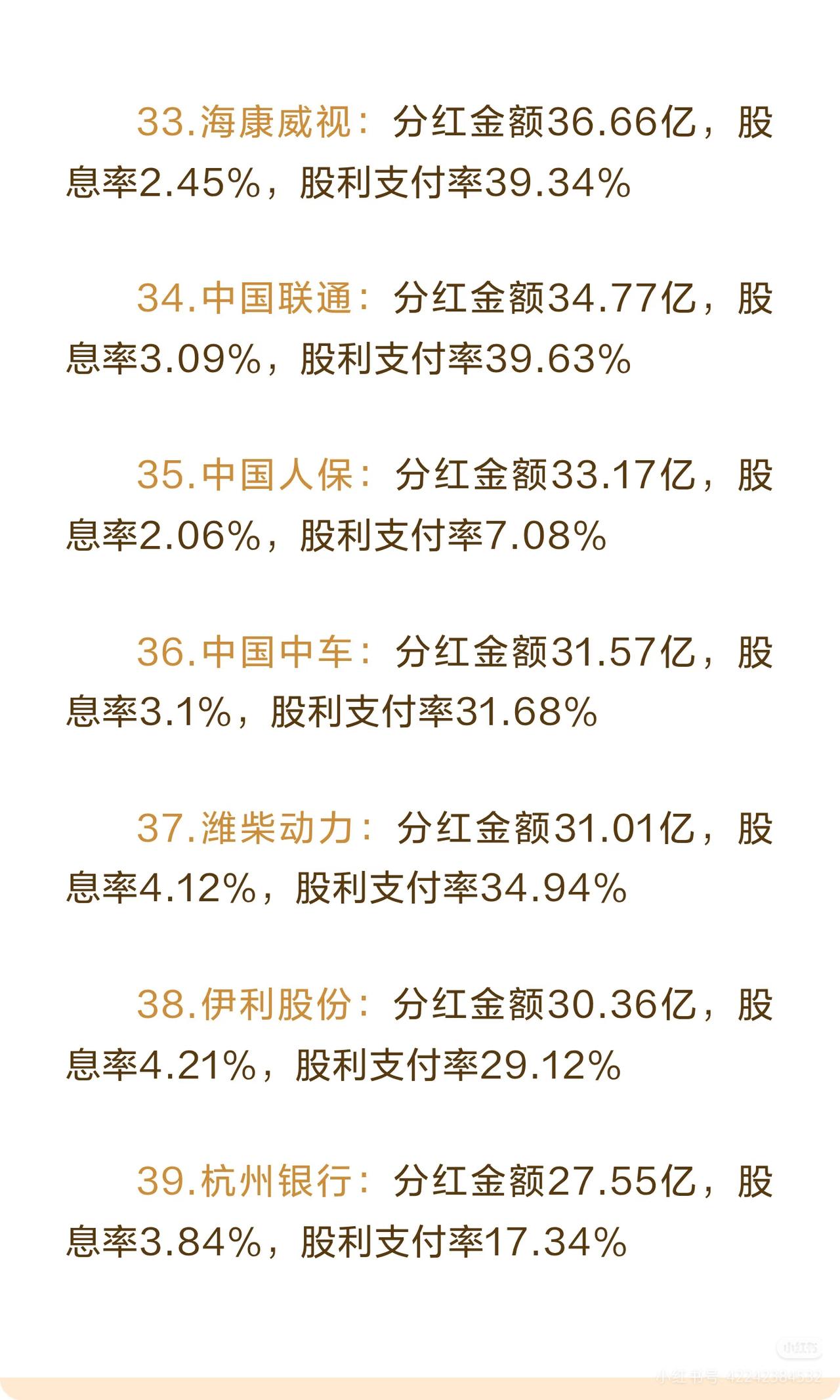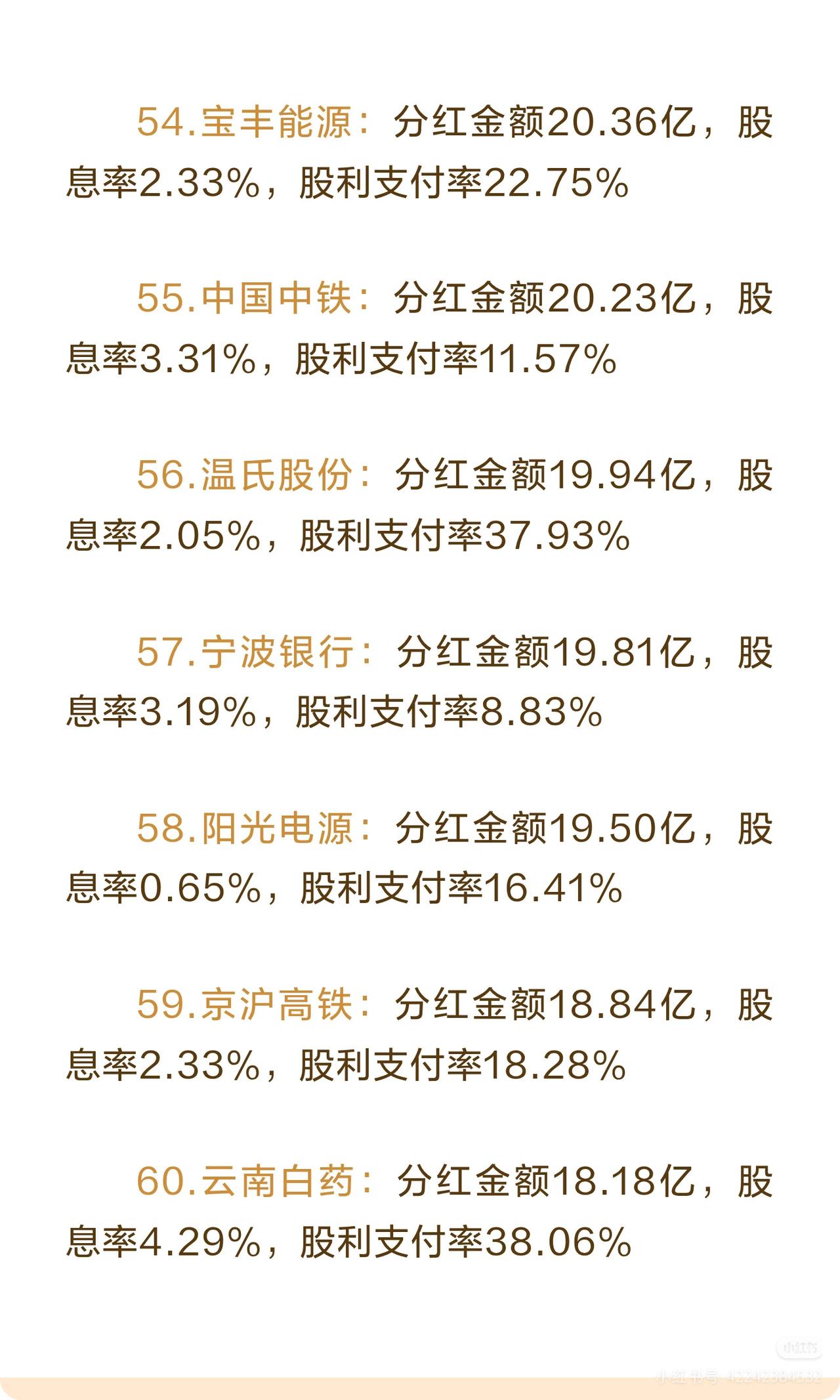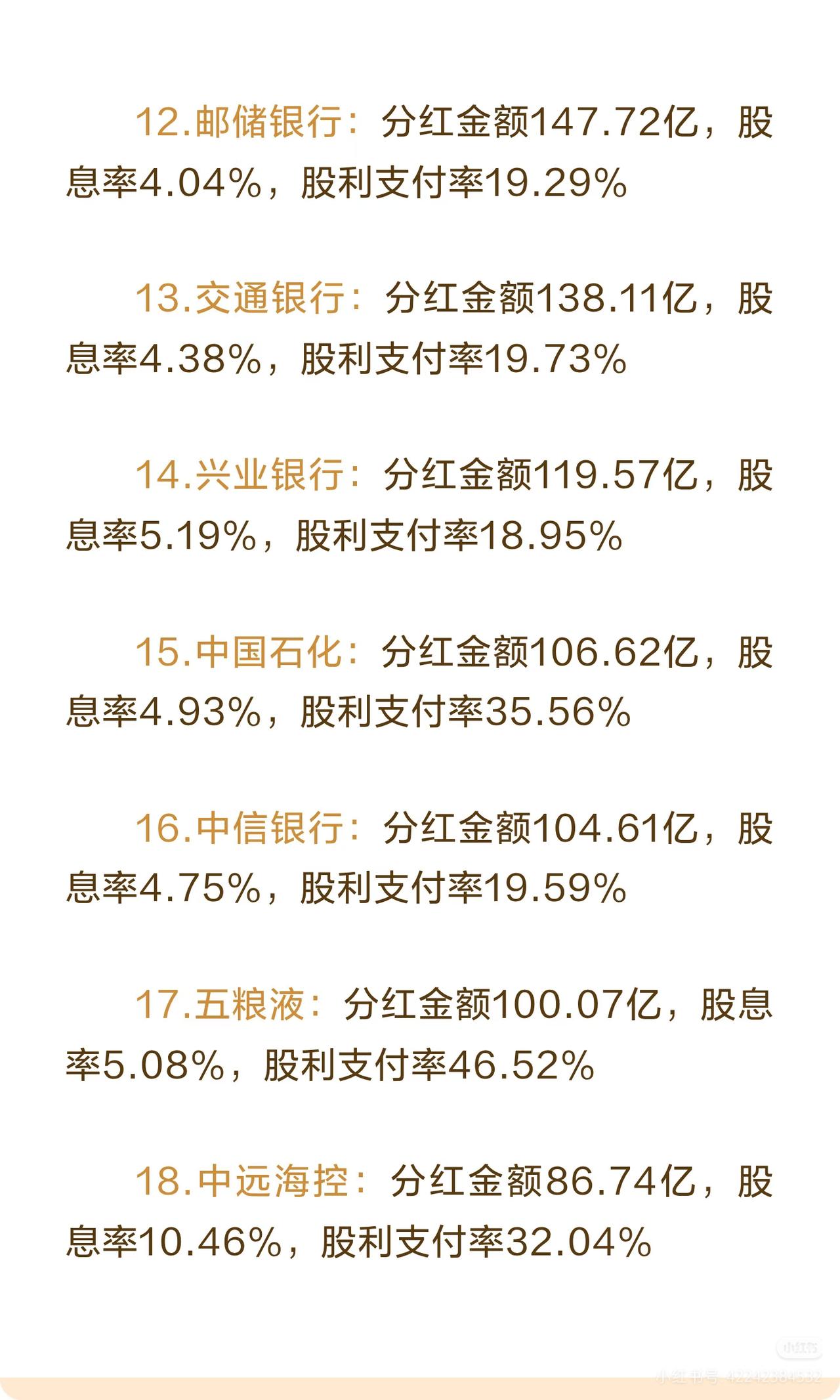 “真豪!A股分红最多的91公司 分红都在10亿以上” 前四名均为大型金融与通信央企,分红金额遥遥领先: - 中国移动,分红540.87亿元,股息率4.51%,股利支付率46.89%; - 工商银行,分红503.96亿元,股息率3.95%,股利支付率18.67%; - 建设银行,分红486.05亿元,股息率4.36%,股利支付率18.89%; - 农业银行,分红418.23亿元,股息率3.28%,股利支付率18.94%。 第5至11名包括石油、银行、能源、白酒等领域龙头: 中国石油402.65亿元(股息率4.92%、支付率31.89%),中国银行352.50亿元(股息率3.96%、支付率19.84%),中国海油316.61亿元(股息率4.58%、支付率31.05%),贵州茅台300.01亿元(股息率3.63%、支付率46.42%),中国神华194.71亿元(股息率5.63%、支付率49.86%),中国平安172.02亿元(股息率3.81%、支付率12.95%),中国电信165.81亿元(股息率3.88%、支付率53.88%)。 第12至18名涵盖多家银行、石化、酒类与航运龙头: 邮储银行147.72亿元(股息率4.04%、支付率19.29%),交通银行138.11亿元(股息率4.38%、支付率19.73%),兴业银行119.57亿元(股息率5.19%、支付率18.95%),中国石化106.62亿元(股息率4.93%、支付率35.56%),中信银行104.61亿元(股息率4.75%、支付率19.59%),五粮液100.07亿元(股息率5.08%、支付率46.52%),中远海控86.74亿元(股息率10.46%、支付率32.04%)。 第19至25名出现保险、制造、家电、养殖等板块: 中国人寿67.27亿元(股息率1.44%、支付率4.01%),工业富联65.51亿元(股息率1.09%、支付率29.13%),光大银行62.04亿元(股息率5.4%、支付率16.76%),民生银行59.54亿元(股息率4.94%、支付率20.86%),紫金矿业58.47亿元(股息率1.25%、支付率15.44%),格力电器55.85亿元(股息率7.32%、支付率26.02%),牧原股份50.02亿元(股息率2.83%、支付率33.85%)。 第26至32名涉及医疗、新能源、证券、银行与家电: 迈瑞医疗49.35亿元(股息率3.22%、支付率65.19%),平安银行45.80亿元(股息率5.3%、支付率11.95%),宁德时代45.68亿元(股息率1.47%、支付率9.32%),中信证券42.98亿元(股息率1.83%、支付率18.56%),上海银行42.63亿元(股息率5.09%、支付率23.58%),南京银行37.86亿元(股息率4.33%、支付率21.03%),美的集团37.74亿元(股息率4.35%、支付率9.96%)。 第33至39名覆盖安防、通信、保险、制造、食品饮料与城商行: 海康威视36.66亿元(股息率2.45%、支付率39.34%),中国联通34.77亿元(股息率3.09%、支付率39.63%),中国人保33.17亿元(股息率2.06%、支付率7.08%),中国中车31.57亿元(股息率3.1%、支付率31.68%),潍柴动力31.01亿元(股息率4.12%、支付率34.94%),伊利股份30.36亿元(股息率4.21%、支付率29.12%),杭州银行27.55亿元(股息率3.84%、支付率17.34%)。 第40至46名包括券商、制造、钢铁、家电、玻璃、银行与物流: 国泰海通26.27亿元(股息率1.75%、支付率11.9%),三一重工26.14亿元(股息率1.59%、支付率36.63%),宝钢股份25.65亿元(股息率2.94%、支付率32.23%),海尔智家24.34亿元(股息率3.43%、支付率14.01%),福耀玻璃23.49亿元(股息率2.93%、支付率33.25%),沪农商行23.24亿元(股息率4.66%、支付率22%),顺丰控股23.18亿元(股息率4.71%、支付率27.9%)。 第47至53名涉及食品、建材、能源、传媒、有色、保险与医药: 双汇发展22.52亿元(股息率5.25%、支付率56.89%),东方雨虹22.10亿元(股息率11.61%、支付率272.89%),中煤能源22.01亿元(股息率3.72%、支付率17.63%),分众传媒21.66亿元(股息率4.67%、支付率51.09%),中国铝业21.10亿元(股息率2.11%、支付率19.41%),新华保险20.90亿元(股息率3.75%、支付率6.36%),药明康德20.43亿元(股息率1.07%、支付率16.92%)。