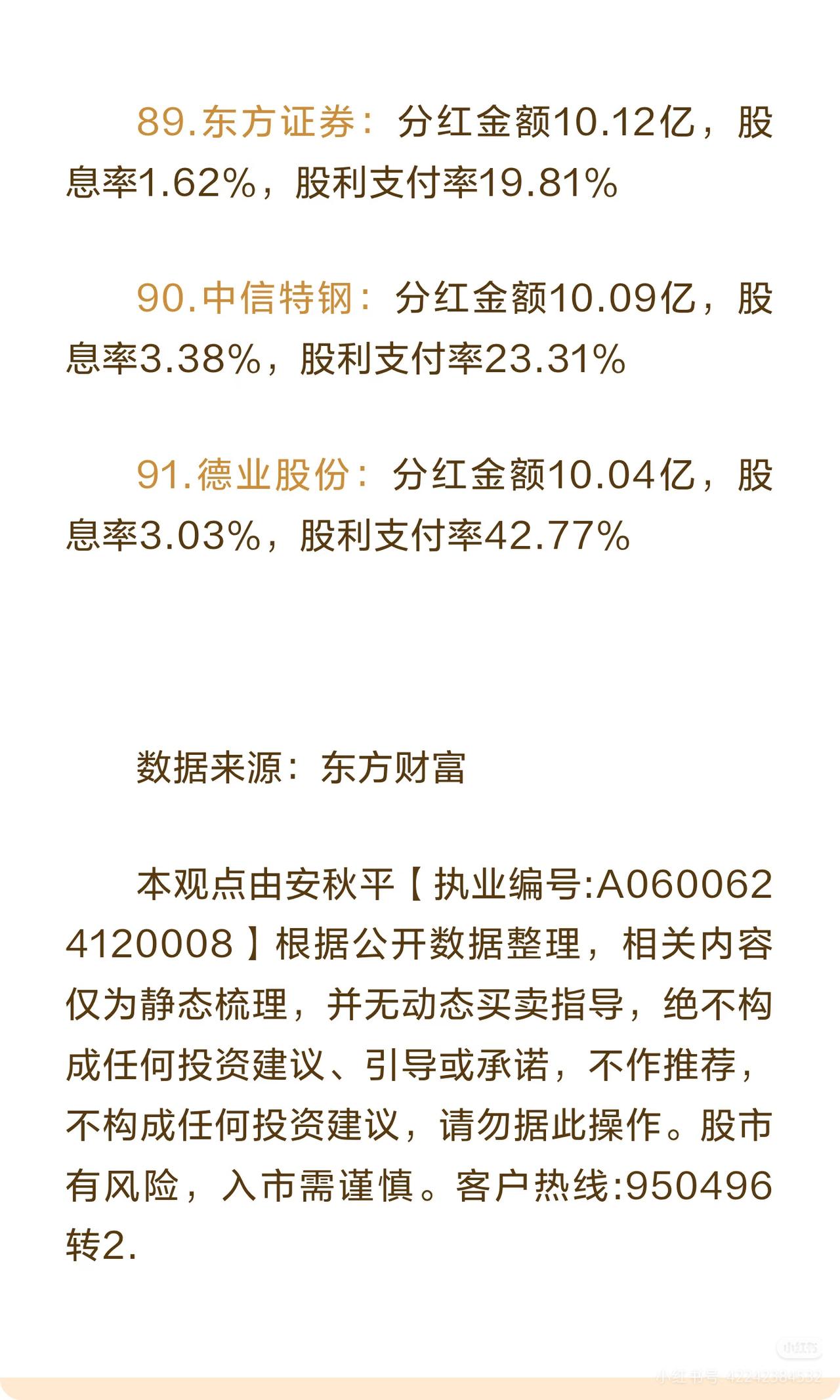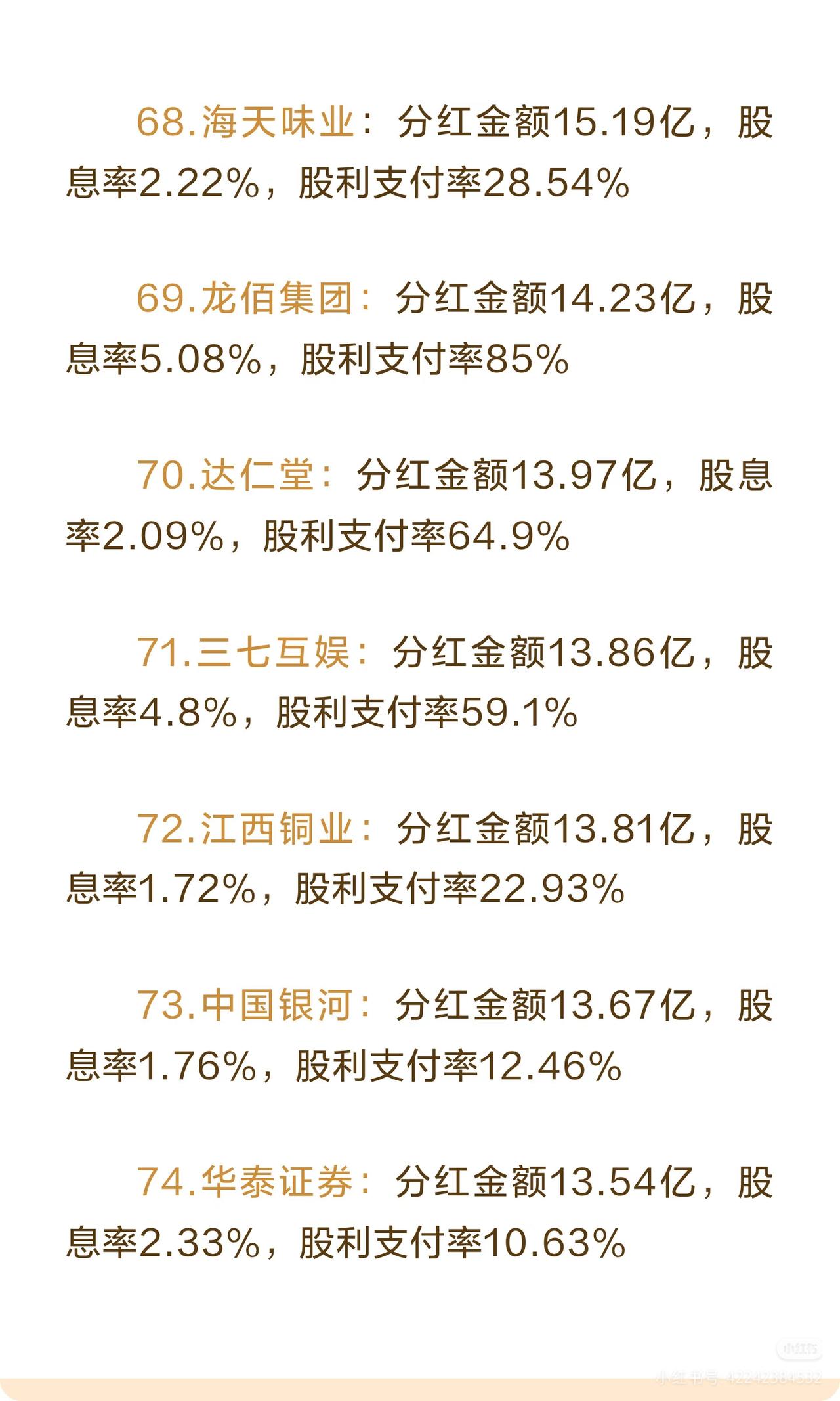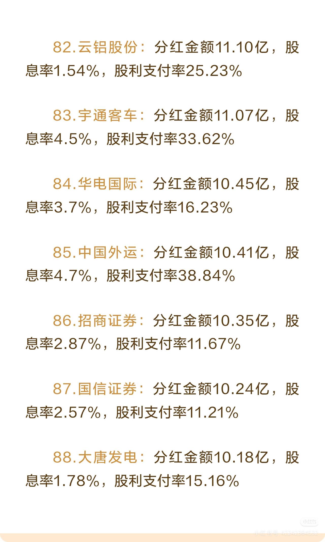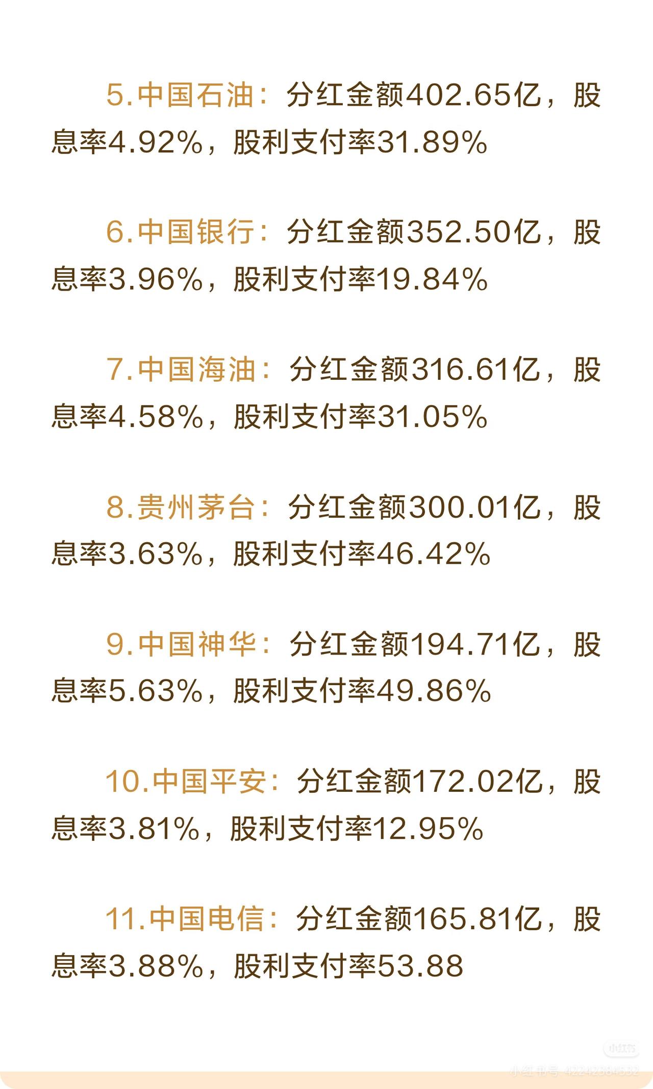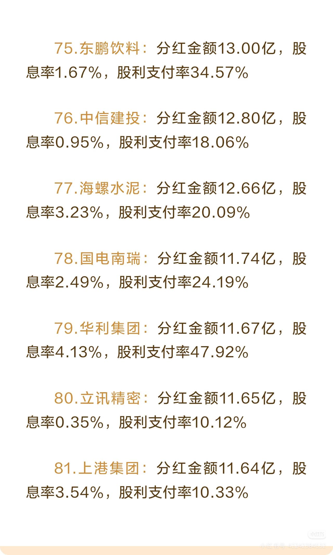 “真豪!A股分红最多的91公司 分红都在10亿以上” 前四名均为大型金融与通信央企,分红金额遥遥领先: - 中国移动,分红540.87亿元,股息率4.51%,股利支付率46.89%; - 工商银行,分红503.96亿元,股息率3.95%,股利支付率18.67%; - 建设银行,分红486.05亿元,股息率4.36%,股利支付率18.89%; - 农业银行,分红418.23亿元,股息率3.28%,股利支付率18.94%。 第5至11名包括石油、银行、能源、白酒等领域龙头: 中国石油402.65亿元(股息率4.92%、支付率31.89%),中国银行352.50亿元(股息率3.96%、支付率19.84%),中国海油316.61亿元(股息率4.58%、支付率31.05%),贵州茅台300.01亿元(股息率3.63%、支付率46.42%),中国神华194.71亿元(股息率5.63%、支付率49.86%),中国平安172.02亿元(股息率3.81%、支付率12.95%),中国电信165.81亿元(股息率3.88%、支付率53.88%)。 第12至18名涵盖多家银行、石化、酒类与航运龙头: 邮储银行147.72亿元(股息率4.04%、支付率19.29%),交通银行138.11亿元(股息率4.38%、支付率19.73%),兴业银行119.57亿元(股息率5.19%、支付率18.95%),中国石化106.62亿元(股息率4.93%、支付率35.56%),中信银行104.61亿元(股息率4.75%、支付率19.59%),五粮液100.07亿元(股息率5.08%、支付率46.52%),中远海控86.74亿元(股息率10.46%、支付率32.04%)。 第19至25名出现保险、制造、家电、养殖等板块: 中国人寿67.27亿元(股息率1.44%、支付率4.01%),工业富联65.51亿元(股息率1.09%、支付率29.13%),光大银行62.04亿元(股息率5.4%、支付率16.76%),民生银行59.54亿元(股息率4.94%、支付率20.86%),紫金矿业58.47亿元(股息率1.25%、支付率15.44%),格力电器55.85亿元(股息率7.32%、支付率26.02%),牧原股份50.02亿元(股息率2.83%、支付率33.85%)。 第26至32名涉及医疗、新能源、证券、银行与家电: 迈瑞医疗49.35亿元(股息率3.22%、支付率65.19%),平安银行45.80亿元(股息率5.3%、支付率11.95%),宁德时代45.68亿元(股息率1.47%、支付率9.32%),中信证券42.98亿元(股息率1.83%、支付率18.56%),上海银行42.63亿元(股息率5.09%、支付率23.58%),南京银行37.86亿元(股息率4.33%、支付率21.03%),美的集团37.74亿元(股息率4.35%、支付率9.96%)。 第33至39名覆盖安防、通信、保险、制造、食品饮料与城商行: 海康威视36.66亿元(股息率2.45%、支付率39.34%),中国联通34.77亿元(股息率3.09%、支付率39.63%),中国人保33.17亿元(股息率2.06%、支付率7.08%),中国中车31.57亿元(股息率3.1%、支付率31.68%),潍柴动力31.01亿元(股息率4.12%、支付率34.94%),伊利股份30.36亿元(股息率4.21%、支付率29.12%),杭州银行27.55亿元(股息率3.84%、支付率17.34%)。 第40至46名包括券商、制造、钢铁、家电、玻璃、银行与物流: 国泰海通26.27亿元(股息率1.75%、支付率11.9%),三一重工26.14亿元(股息率1.59%、支付率36.63%),宝钢股份25.65亿元(股息率2.94%、支付率32.23%),海尔智家24.34亿元(股息率3.43%、支付率14.01%),福耀玻璃23.49亿元(股息率2.93%、支付率33.25%),沪农商行23.24亿元(股息率4.66%、支付率22%),顺丰控股23.18亿元(股息率4.71%、支付率27.9%)。 第47至53名涉及食品、建材、能源、传媒、有色、保险与医药: 双汇发展22.52亿元(股息率5.25%、支付率56.89%),东方雨虹22.10亿元(股息率11.61%、支付率272.89%),中煤能源22.01亿元(股息率3.72%、支付率17.63%),分众传媒21.66亿元(股息率4.67%、支付率51.09%),中国铝业21.10亿元(股息率2.11%、支付率19.41%),新华保险20.90亿元(股息率3.75%、支付率6.36%),药明康德20.43亿元(股息率1.07%、支付率16.92%)。