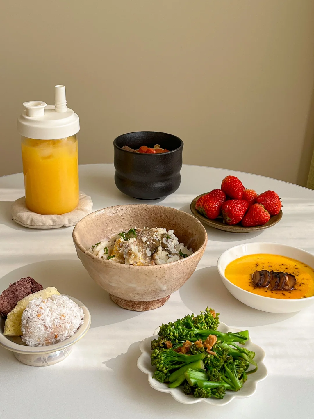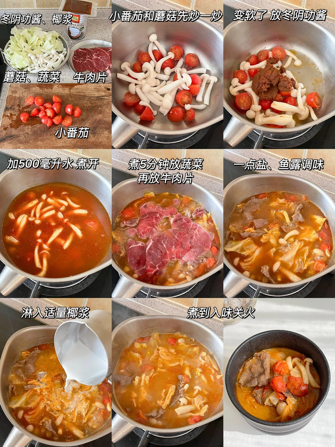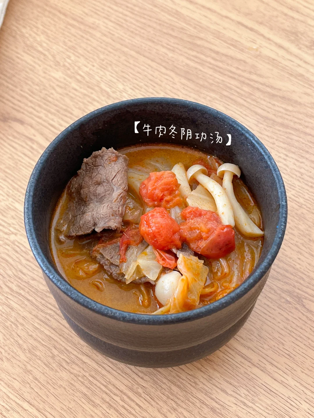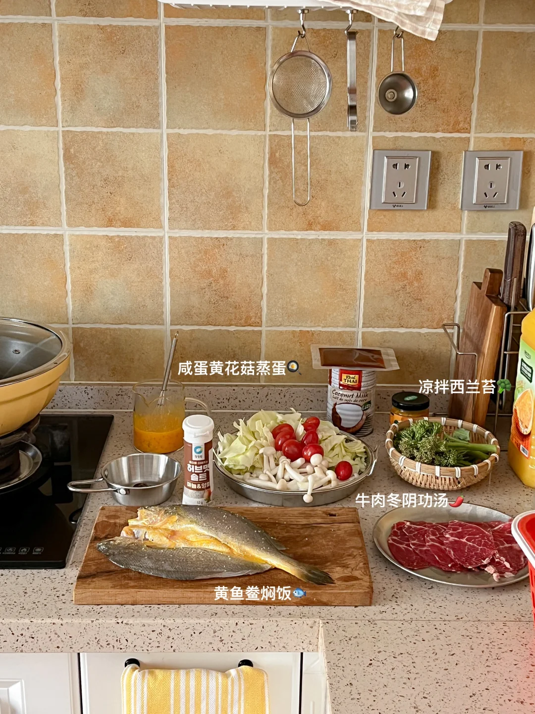 咸蛋黄花菇蒸蛋🍳 黄鱼鲞焖饭🍚 牛肉冬阴功汤🌶️ 凉拌西兰苔🥦 冰橙汁🧃三色年糕🍡 黄鱼鲞焖饭🍚 第一次做就爱上了!巨巨巨好吃 黄鱼又嫩又香又鲜 我平时真不爱吃鱼 主要是挑刺太麻烦了 这鱼刺很少 除了几条大刺 剩下拌在饭里都没吃出来 鱼本身有腌过 带咸香的底味 吃的时候淋一点蒸鱼豉油就足够了 牛肉冬阴功汤🌶️ 家庭简易版 有啥放啥系列 没有虾就放牛肉 小番茄、蘑菇、卷心菜 放了一整包冬阴功酱 酸爽!