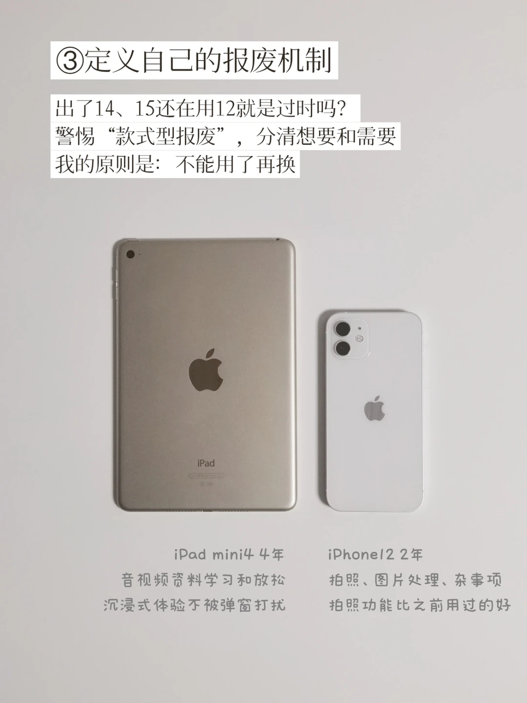出了14、15还在用12就是过时吗?《无节制消费的元凶》告诉我们要警惕“款式型报废”,分清想要和需要。对于电子产品,我的原则是不能用了再换。