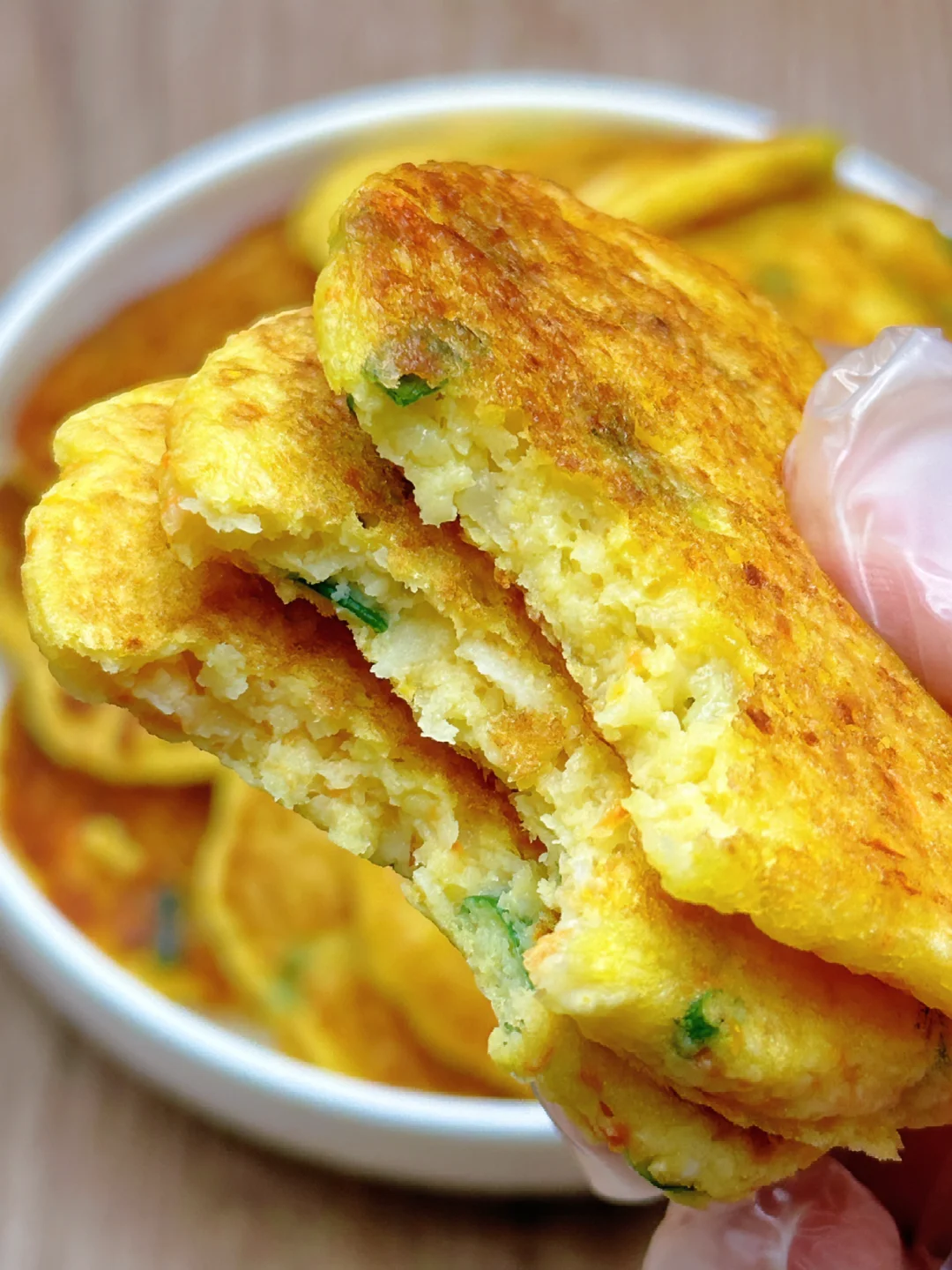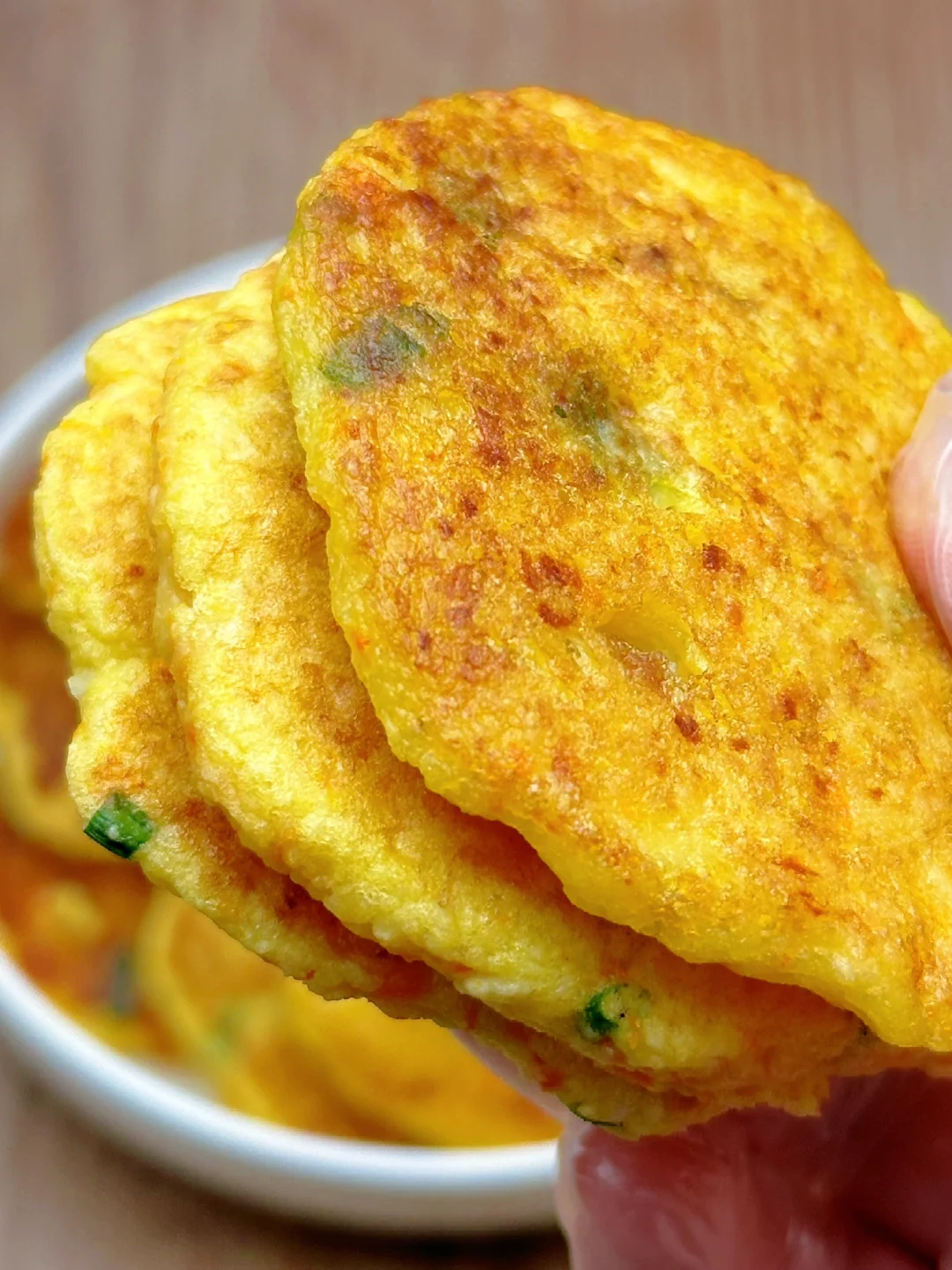 3️⃣平底锅不放油(如果锅没那么好可以放刷油)放入山药糊,煎至一面金黄后翻面,煎至两面金黄熟透即可(⚠️最小火,煎制第一面成型再翻面,煎制2分钟左右再翻面)简单的低卡低脂减脂早餐饼就做好了