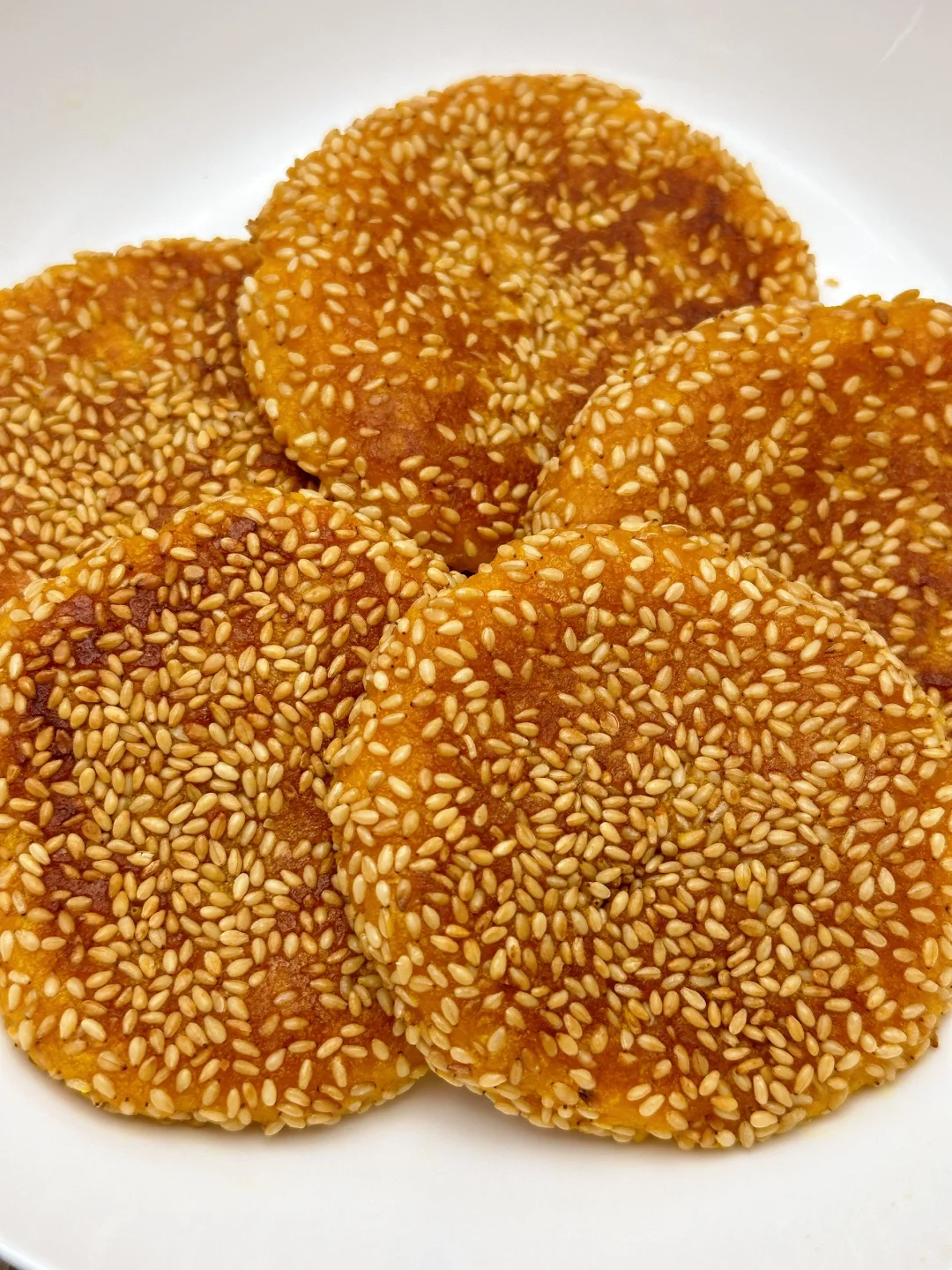 ②加50g糯米粉揉成团,分成小块揉圆,裹上白芝麻