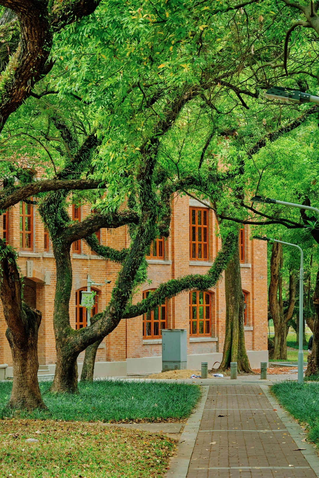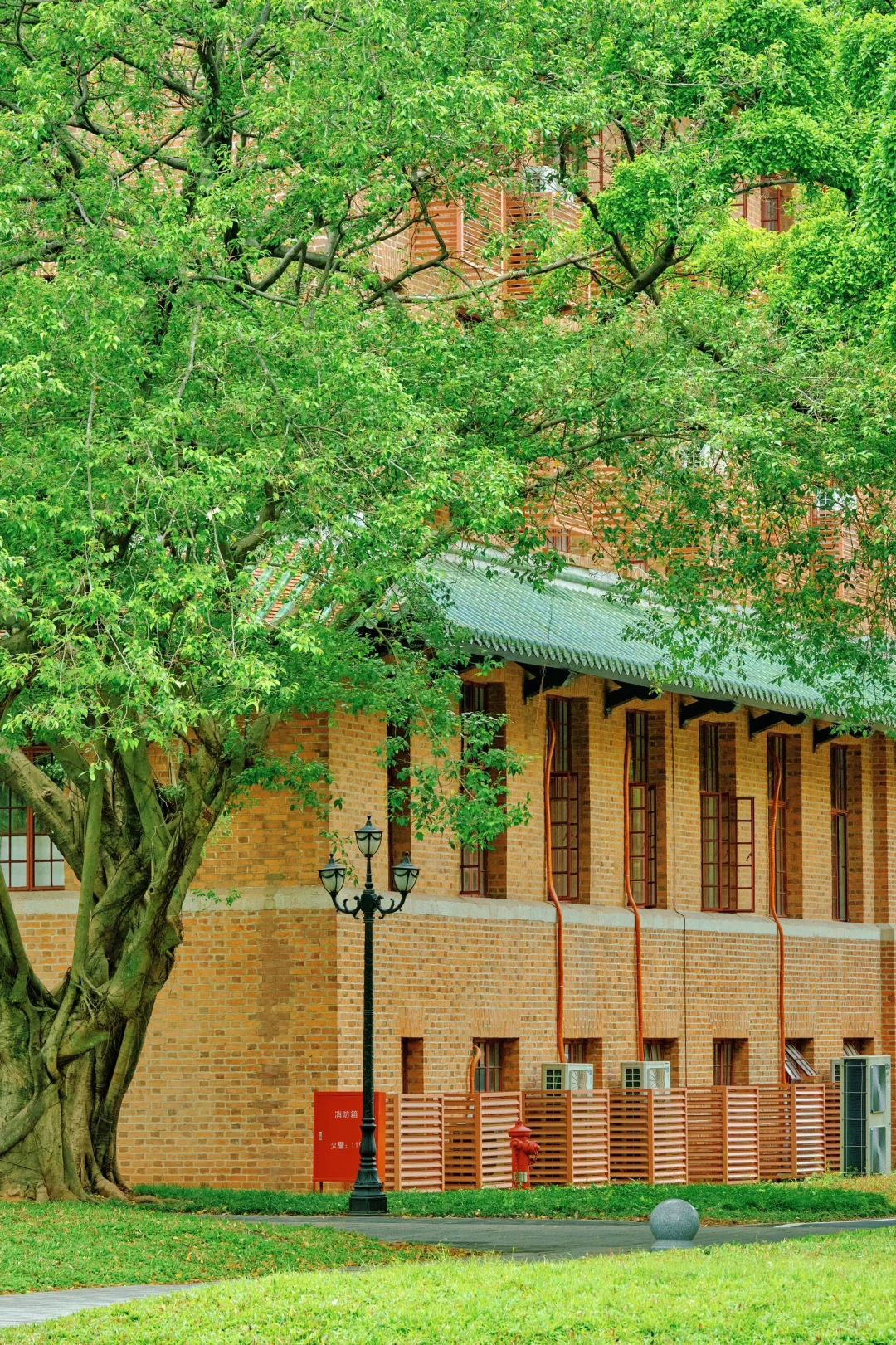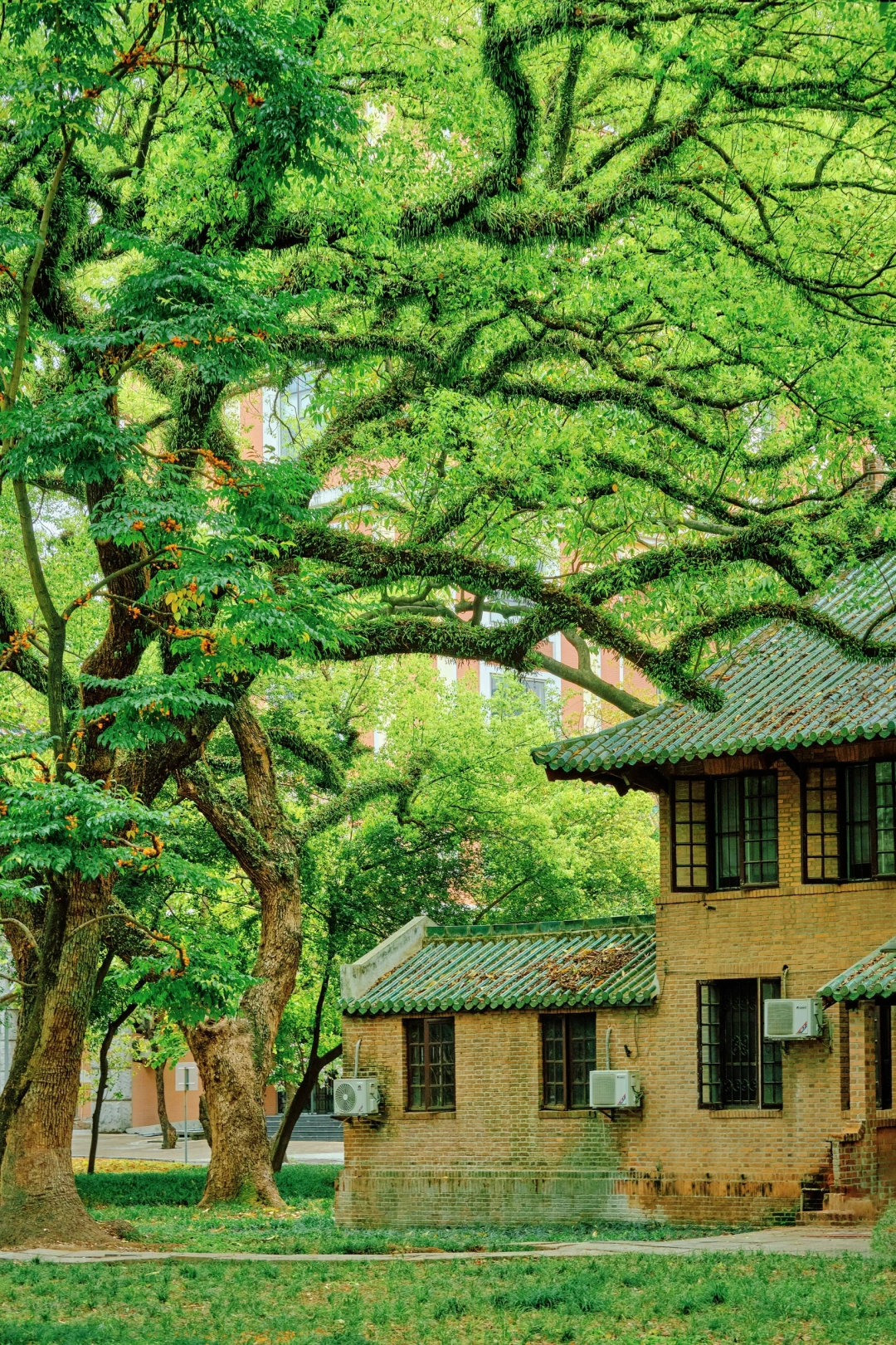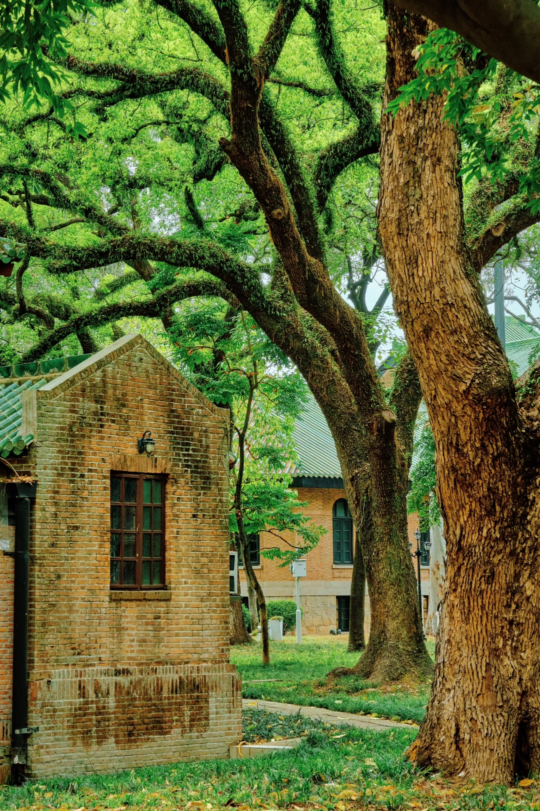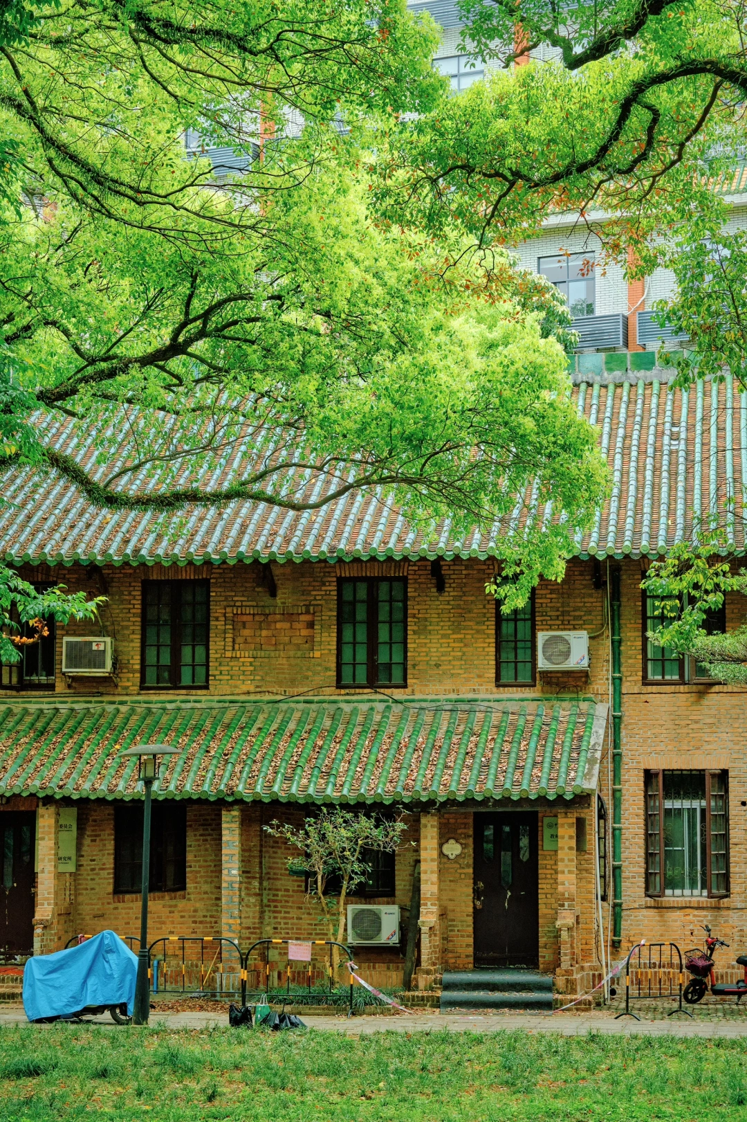 康乐园一座红砖建筑,门前古樟树龄超百年