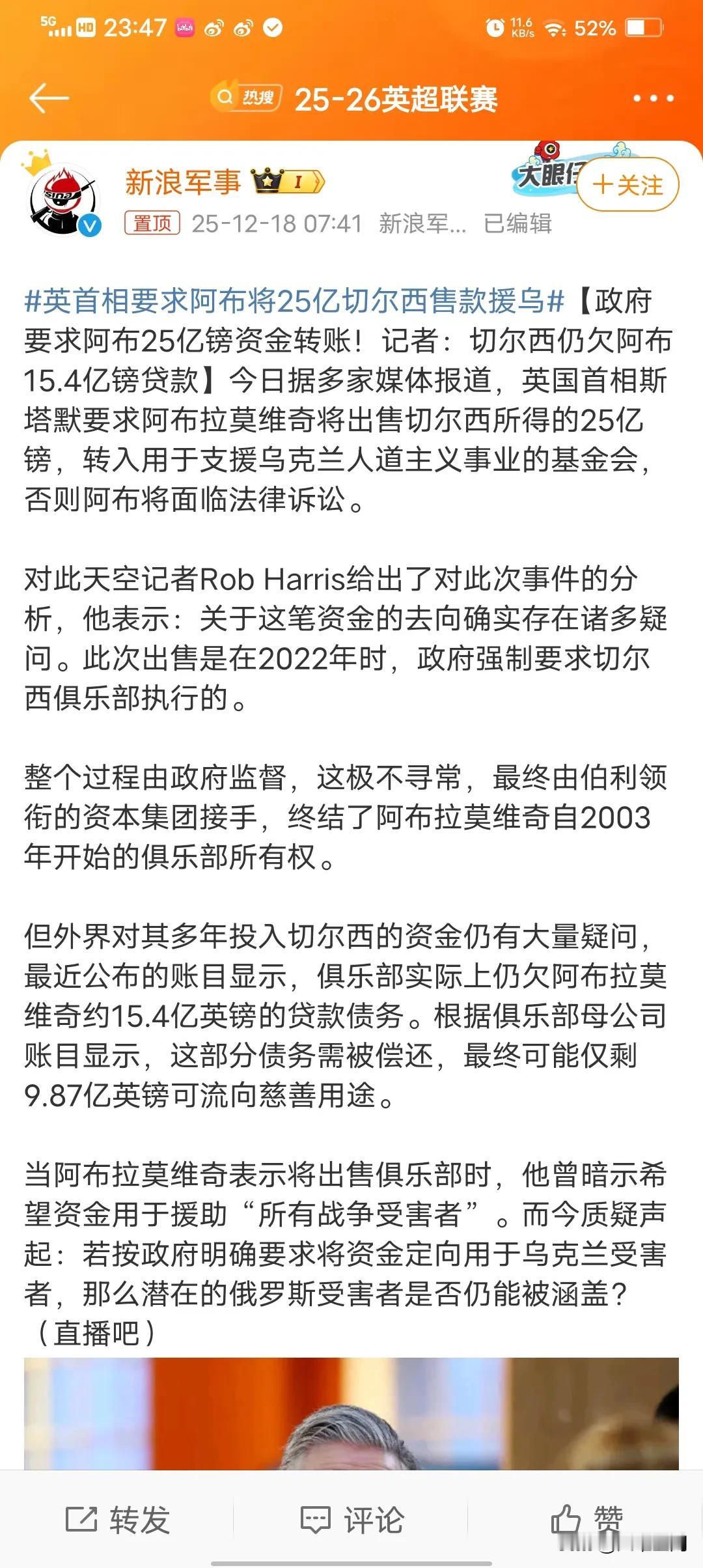 这就是有钱人当殖人的下场,英国要求俄罗斯富豪阿布,把出售的切尔西的25亿英镑转给乌克兰,要不然就要吃官司,这个阿布是俄罗斯的犹太人,在俄罗斯赚到上千亿财富,早在俄乌冲突发生前,这个人就已经离开俄罗斯,并加入了以色列籍,而且对英超的发展做出了很大贡献,在英超上投入了很多钱,到现在切尔西还欠着阿布15.4亿英镑的贷款呢,现在英国又要求他把出售切尔西的钱无偿给乌克兰,这笔钱现在还冻结着呢,阿布拿也拿不到,就是要逼阿布自己转给乌克兰,而不是英国是没收转给乌克兰,这样英国就不会违反私人财产神圣不可侵犯,英国人太虚伪了!这也是有钱人跑去当殖人的下场,西方一定是吃干抹净!