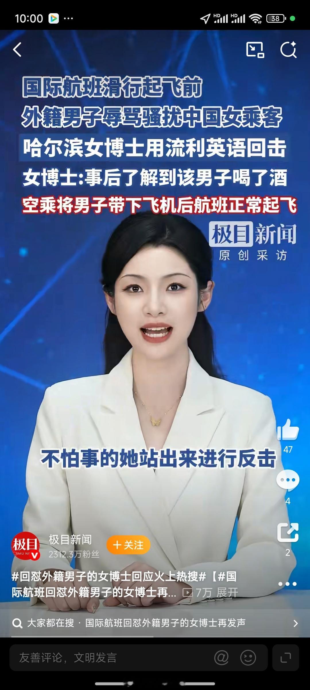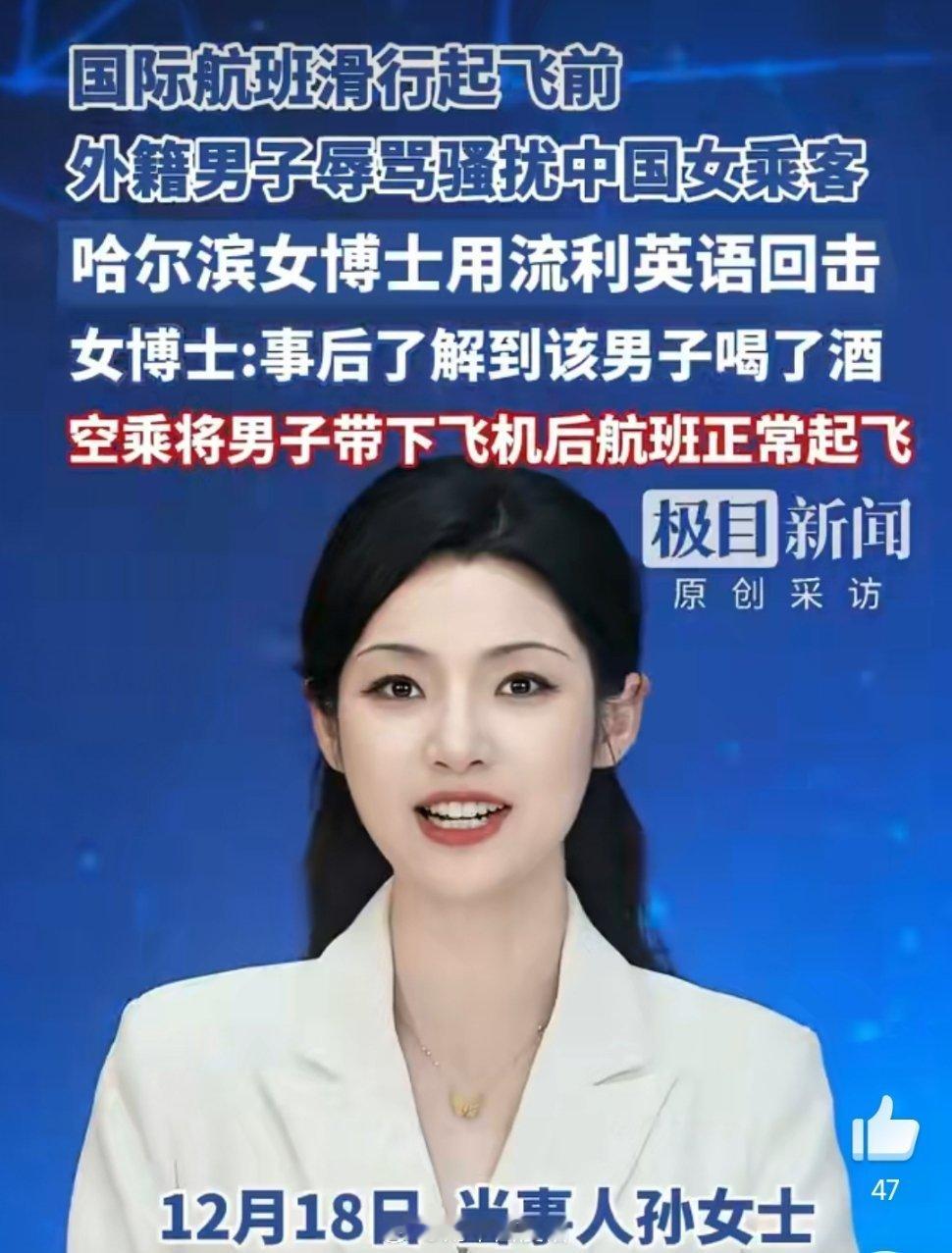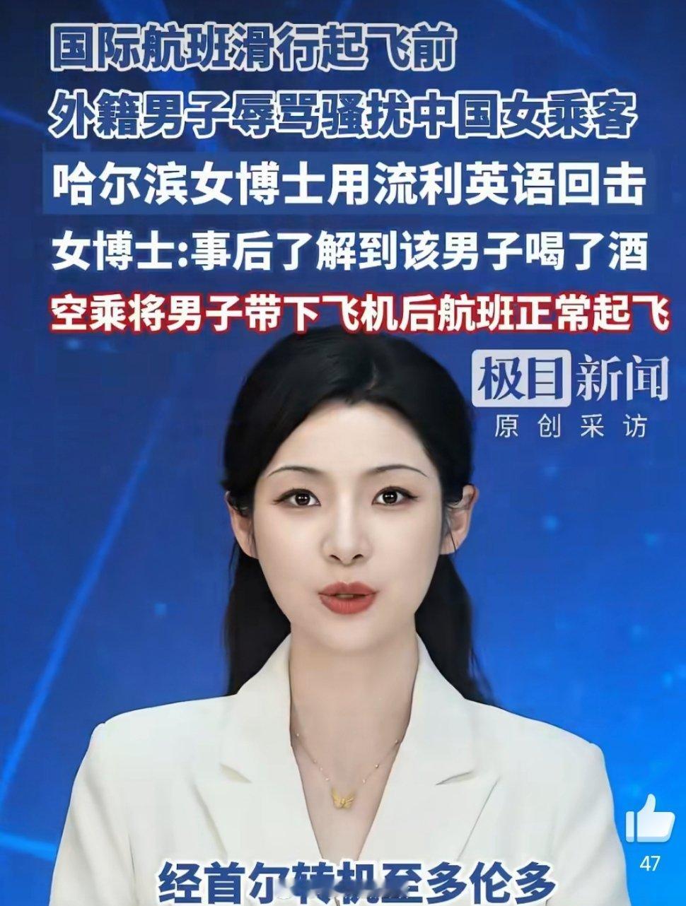 回怼外籍男子的女博士回应火上热搜国际航班上女博士硬核回怼辱骂同胞的外籍男子,之所以全网叫好,正因她守住了尊严与底线。面对酒后男子的歧视性辱骂,她没有隐忍退让,而是以流利英语据理力争,还提前录音固定证据,既震慑了嚣张气焰,又避免了冲突升级。机舱内的满堂掌声,是对“路见不平”的认可,更是对“国人尊严不容践踏”的集体共鸣。这种有理、有据、有节的维权,才是跨文化场景中最该有的姿态。
