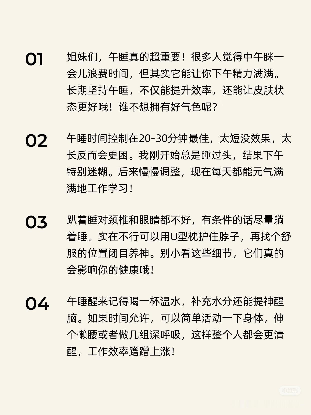 咱中老年朋友,中午到底该不该眯一觉?我身边有人说“中午不睡,下午崩溃”,也有人说“睡了更昏沉,还不如不睡”。 其实这事儿有讲究!不是睡越久越好,也不是所有人都适合睡。像我每天中午就眯20分钟,下午买菜、跳广场舞、带孙子,精神头都足足的。那些一睡一下午的,起来反而头晕脑胀,啥活儿都不想干。 说到底,午觉就是个“充电神器”,但得用对方法。你中午一般睡多久?有没有睡完更精神的小妙招?评论区聊聊!