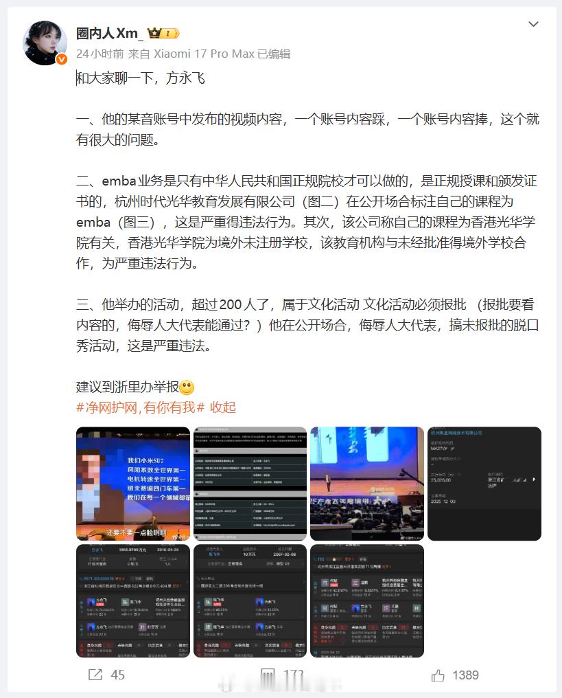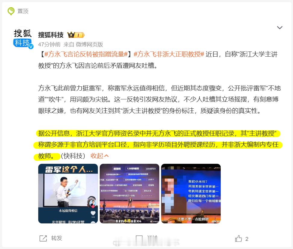 方永飞非浙大正职教授 有些群体认为方永飞“敢说真话”,到头来才发现他是一个江湖郎中?就挺幽默的。这场闹剧就跟之前那个山东村支书一个样:吃黑流量到头来只会被流量反噬!方永飞言论反转被指蹭流量