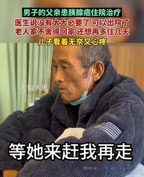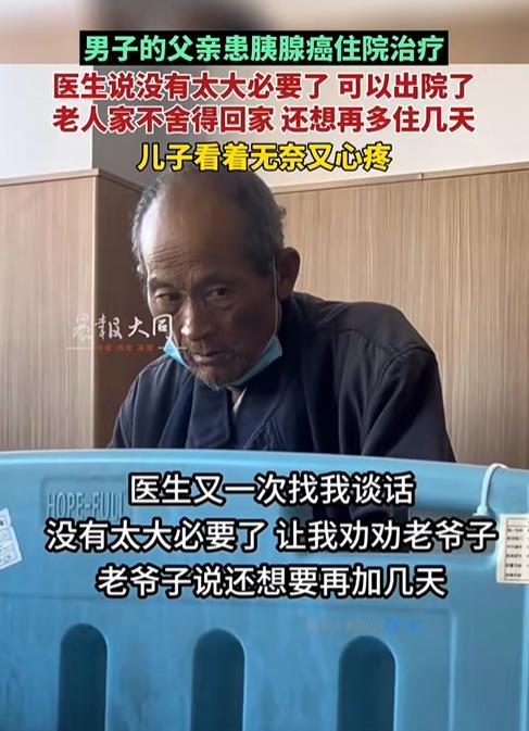 太揪心了!江苏,一名男子的父亲因胰腺癌住院治疗,医生告知病情已经没有太大必要继续住院治疗,建议回家静养。可老人家却紧紧抓着病床栏杆,眼神里全是不舍,低声念叨着“再住几天吧”。 儿子站在一旁,看着父亲瘦削的背影,心里五味杂陈! 刚刷到一个很早以前的视频,视频中,男子的父亲确诊胰腺癌已经住院多日了,随着病情的发展,治愈的希望也是越来越渺茫。医生便委婉建议到可以回家静养。 可老人一听就慌了,攥着床单不肯松手:等她来赶我再走,我这才来三四天! 旁边站立的儿子看着神情慌张的老父亲心里特别不是滋味。他知道,父亲不是不懂病情,而是害怕离开医院以后,就像断了这最后一棵稻草。在这里,最起码,疼的时候,还可以按个“铃”,有人能够“专业”的照顾他一下。 甚至说:没事儿的时候,看看那些忙碌的白大褂们,心理上 也是一种安慰! 儿子当然懂得医生的好意,毕竟,父亲年岁大了,再加上这病情,弄不好就是人财两空的境界。 可听着老父亲说:我这才来三四天,在住两天,就两天。在看看老父亲那无助的样子,实在是狠不下心去,儿子只好去办理了延期。 有网友说:我是一名护士,这种情况时有发生,有时候看到那些无助的眼神,心里真想大哭一场! 还有网友说:想住就住着,如果说没有治疗的价值了,那就每天吊点营养液,只要老爷子心里舒服就行! 说真的,谁都知道医院不是家,可一旦生命进入倒计时的时候,那24小时亮着的灯、穿梭的白大褂们,或许就是患者们最后的“安全感”。这里面,儿子无奈的选择,在其心中何尝不是一种挣扎。 生老病死,谁也不可避免,只希望未来在每个生命最后的路上,都能走的温暖一些! 信息来源:晨报大同《男子的父亲患胰腺癌住院治疗,医生说没有太大必要了可以出院了,老人家不舍得回家还想再多住几天!儿子看着无奈又心疼》2023.11.30