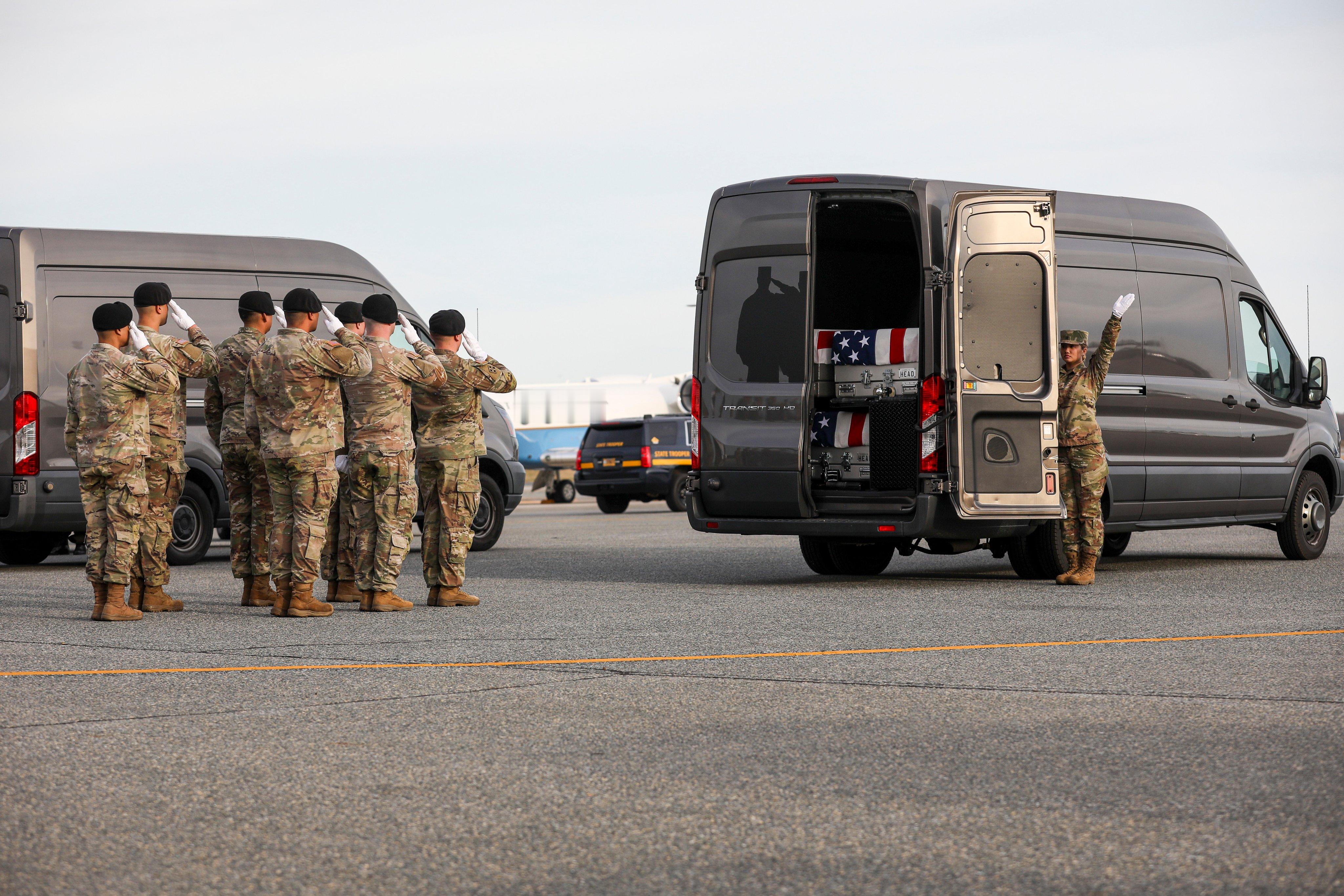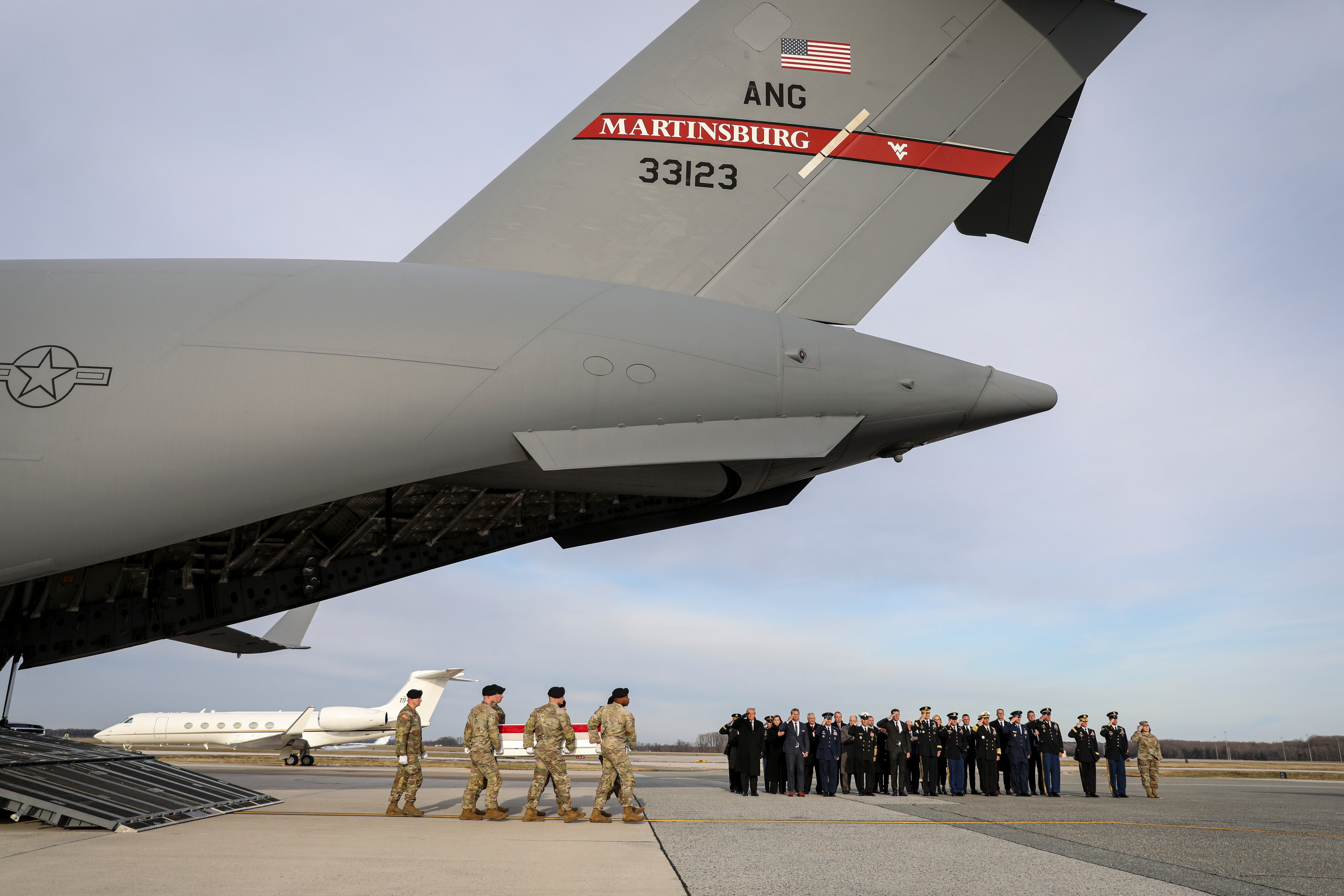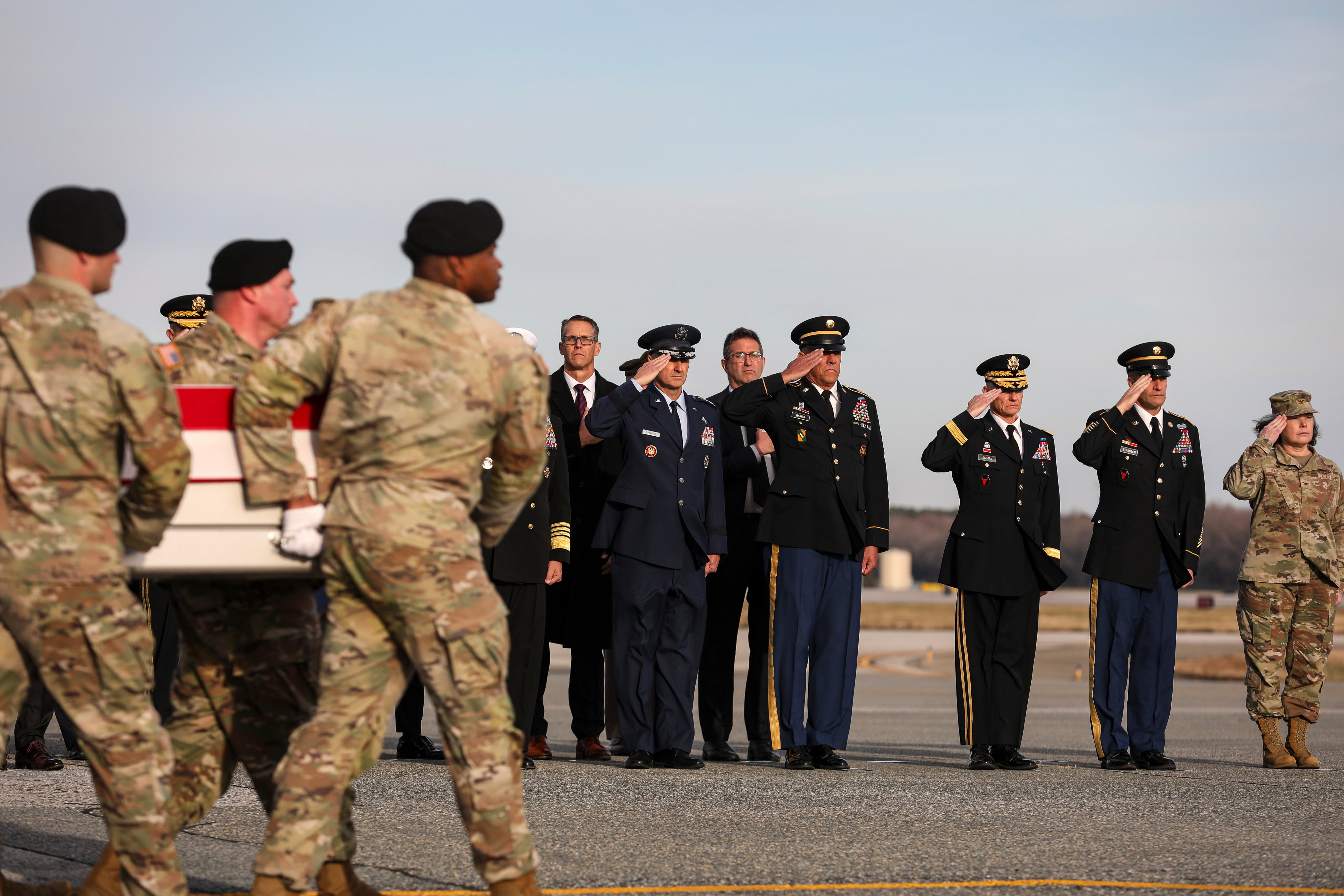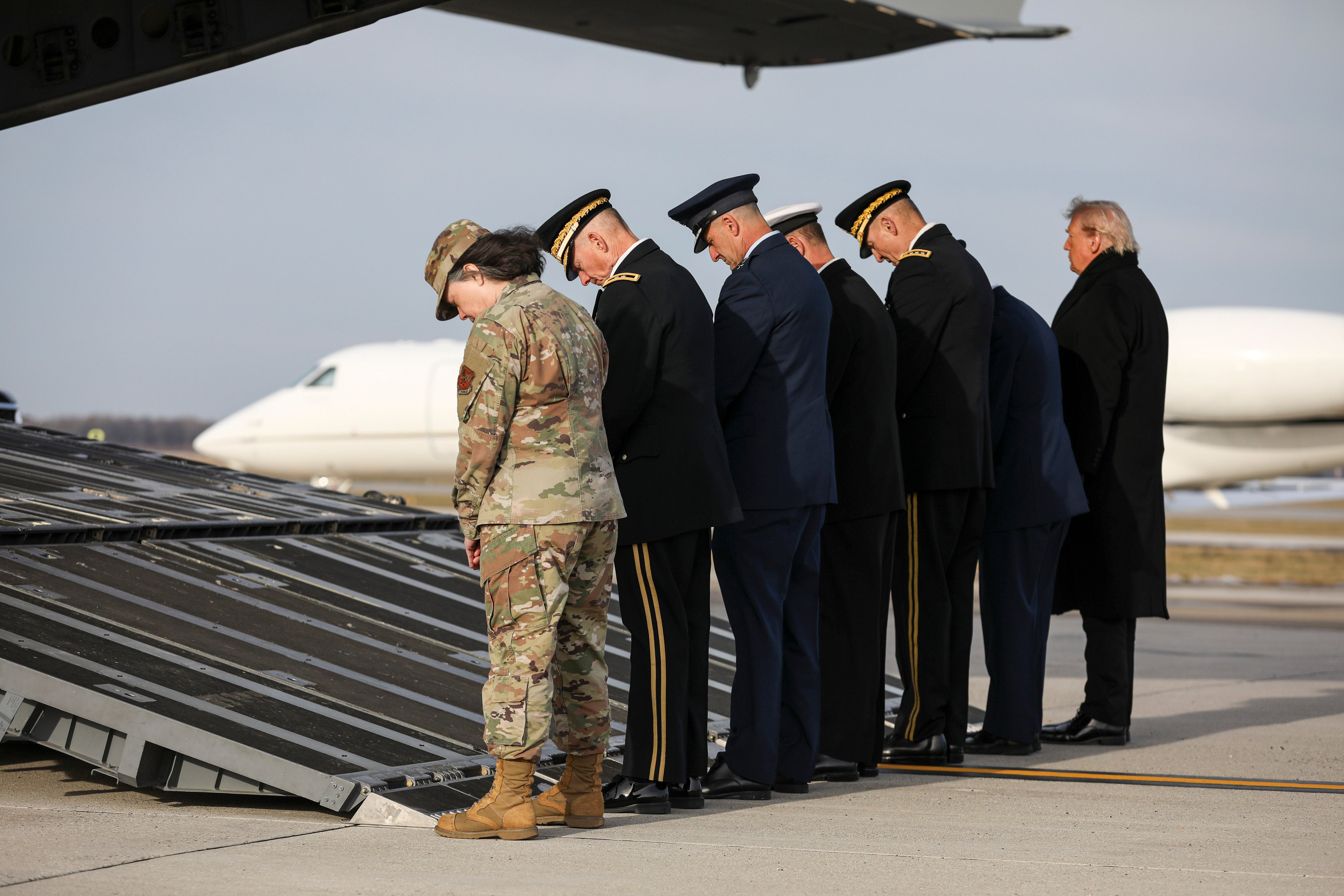 特朗普、国防部长Pete Hegseth和国民警卫队总司令Gen. Steven Nordhaus在在多佛空军基地迎接爱荷华州国民警卫队在叙利亚阵亡的两位士兵Sgt. William Howard, Sgt. Edgar Torres-Tovar 和一位陆军文职翻译Ayad Sakat遗体回国