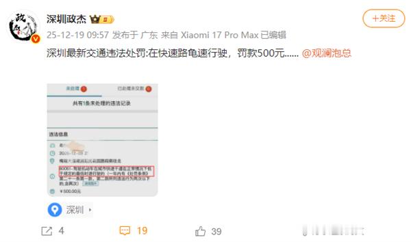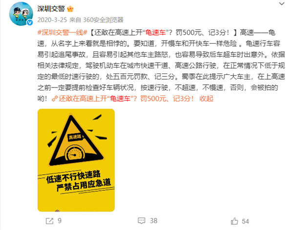 博主曝深圳治理龟速车:主干道低于限速罚款500元