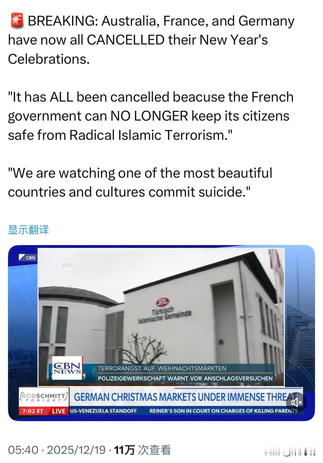 突发新闻:澳大利亚、法国和德国现已全部取消新年庆祝活动。 “所有活动都被取消了,因为法国政府已经无法保护其公民免受极端伊斯兰恐怖主义的侵害。”