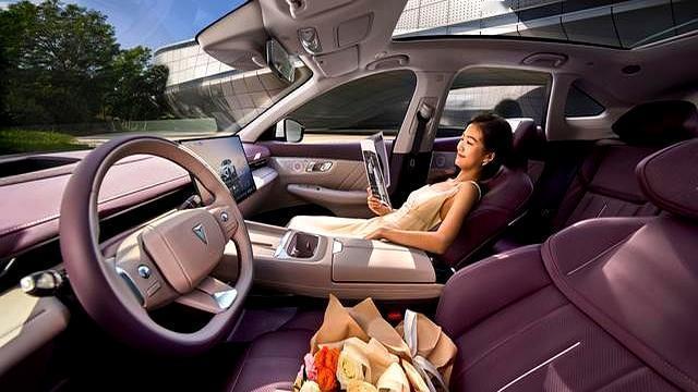 内饰设计以舒适实用为主。IP台板、门板上沿均使用了超纤绒感麂皮材质,触感柔软细腻。同时搭配64色氛围灯以及浮光律动音箱灯效,营造出高级感。值得一提的是,车内配备了15.6英寸2.5K“向日葵屏”与55英寸AR-HUD组合,即使在阳光直射下,屏幕内容仍清晰可见,操作便捷,新手也能快速上手。方向盘更换为滚轮式按键,换挡机构升级为电子怀挡。这一设计不仅让中央通道更整洁,还大幅增加了存储空间。座椅方面,前排双零重力座椅支持电动调节、按摩和腿托功能,配合120度平躺设计,可以有效缓解长途驾驶的疲劳感。而后排座椅靠背同样可调节,纯平地台设计则让中间乘客坐得更加舒适。即使是身高180cm的成年人坐在后排,膝盖与前排之间仍有两拳距离,毫无压抑感。