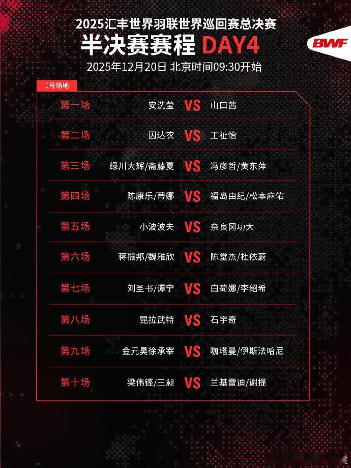 世界羽联年终总决赛半决赛赛程 国羽冲击6个决赛席位2025世界羽联年终总决赛半决赛今日打响,王祉怡、冯彦哲/黄东萍、蒋振邦/魏雅欣、刘圣书/谭宁、石宇奇、梁伟铿/王昶冲击决赛席位。【早场9:30】第一场:安洗莹vs山口茜第二场:王祉怡vs因达农 第三场:冯彦哲/黄东萍vs绿川大辉/斋藤夏 第四场:陈康乐/蒂娜vs福岛由纪/松本麻佑第五场:小波波夫vs奈良冈功大【晚场17:00】第六场:蒋振邦/魏雅欣vs陈堂杰/杜依蔚第七场:刘圣书/谭宁vs白荷娜/李绍希第八场:石宇奇vs昆拉武特 第九场:金元昊/徐承宰vs咖塔曼/伊斯法哈尼第十场:梁伟铿/王昶vs兰基雷迪/谢提看BWF总决赛上咪咕
