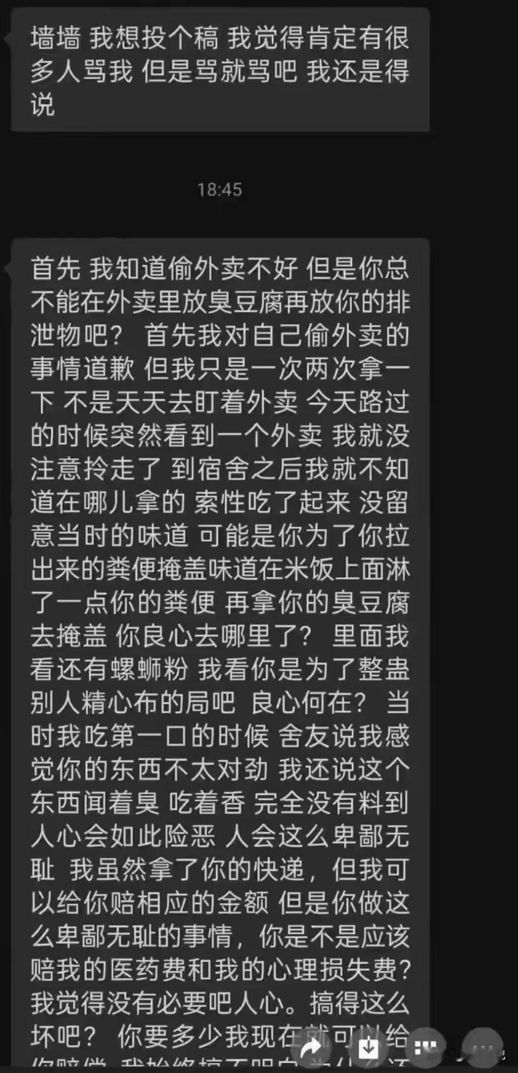 终于有人做出来了,大快人心啊! 对付经常偷外卖的,你有什么好办法吗?最狠的“米田共”被实操了。 这次遇到狠人了,估计一辈子都会对偷外卖有阴影,也算是一劳永逸了,先点赞。 由于经常丢外面,就点了个臭臭的螺丝粉,在地下埋伏“米田共”,让偷外卖者一辈子记住。 最终,偷者自爆,谴责做局者。 虽然我做不到,但是我支持,大家怎么看?