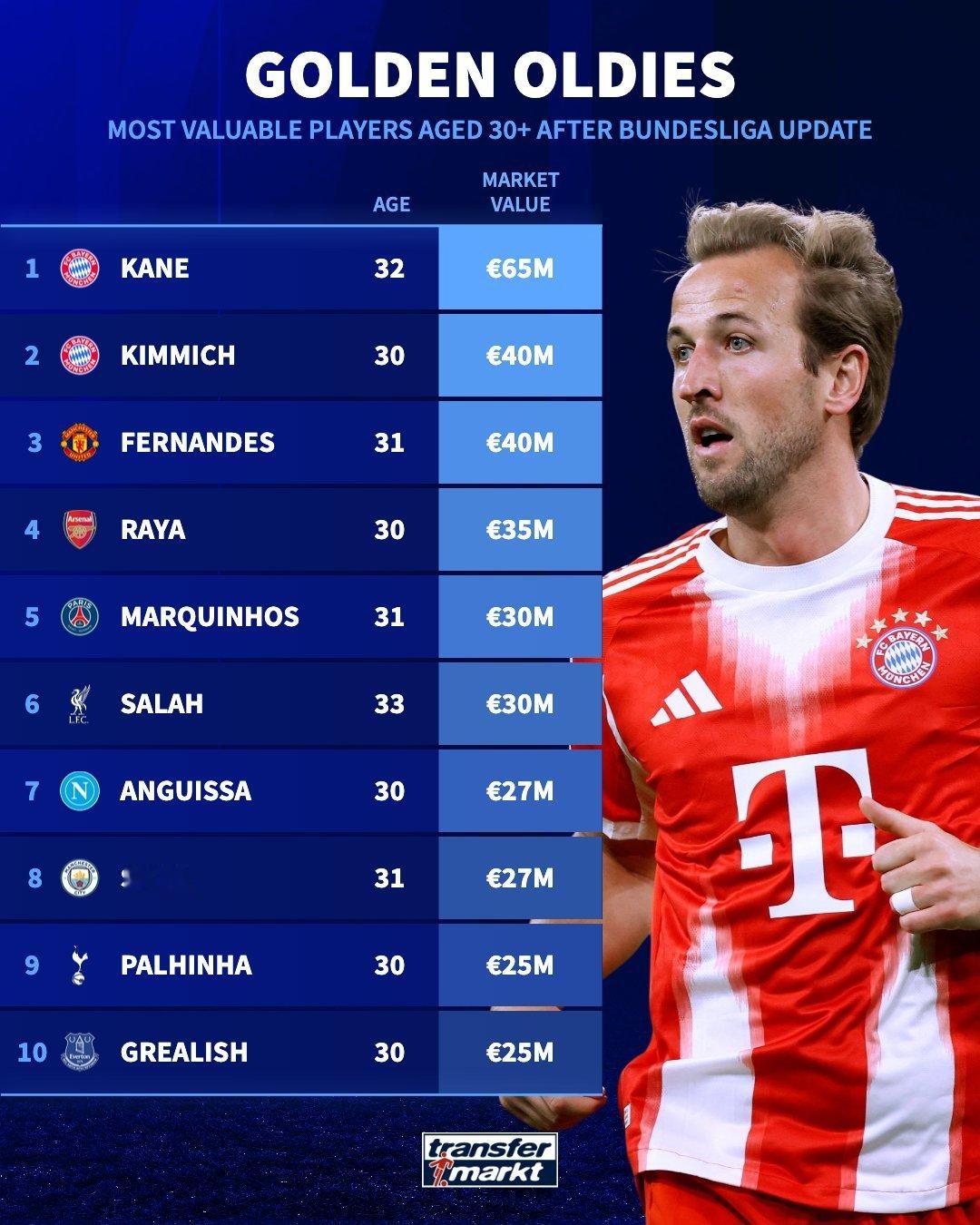 凯恩和鸡哥是30岁以上球员中身价最高的两名球员