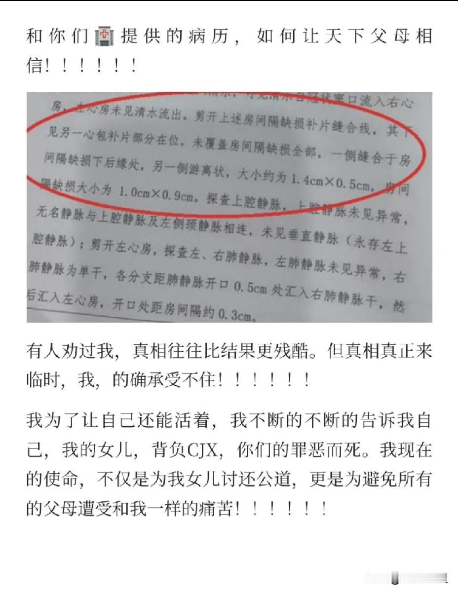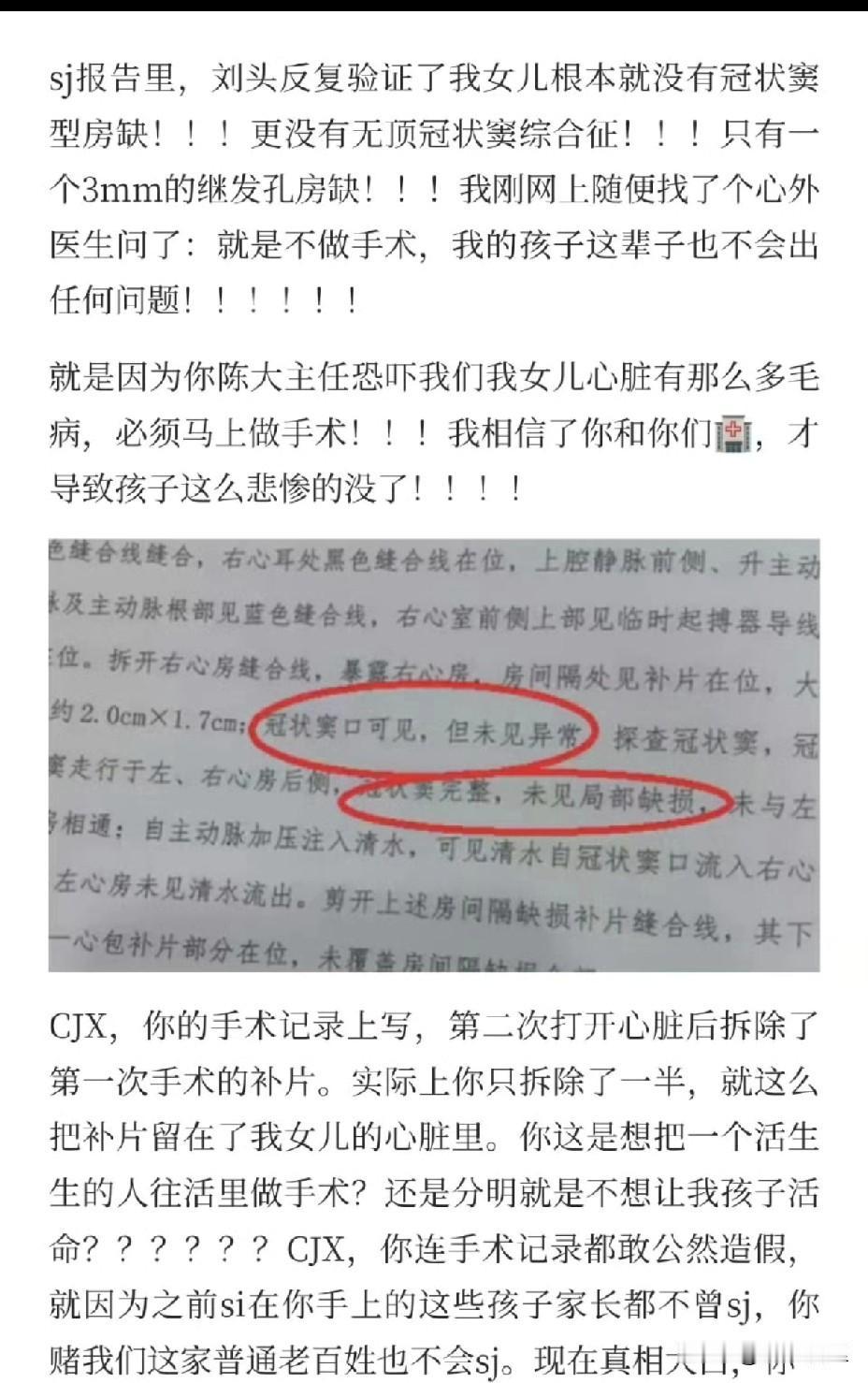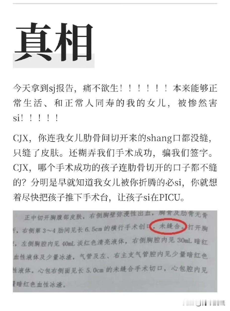小洛熙的事情的最新进展来了。 看了法医刘良的报告,气得手抖。孩子的“房间隔缺损”其实只有3毫米,多名心外科医生表示,不手术,孩子完全没有问题,可医生陈某却说要立刻手术,不手术会导致脑瘫,迫使家属签字。 更可怕的是,肋骨上的大口子没缝,心包上的口子没缝,连用来修补的“补片”都有一半留在了心脏里。这些检测结果的背后是一个小生命因为一连串低级错误而离开的真相。 从开始的夸大病情,到手术中的各种失误,再到后来隐瞒问题,每一步都错得离谱。医院的处理通报出来了,但再严重的处分也换不回这个可爱的宝宝了。
