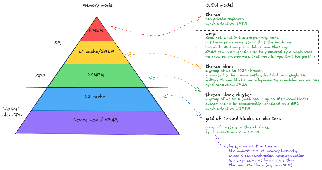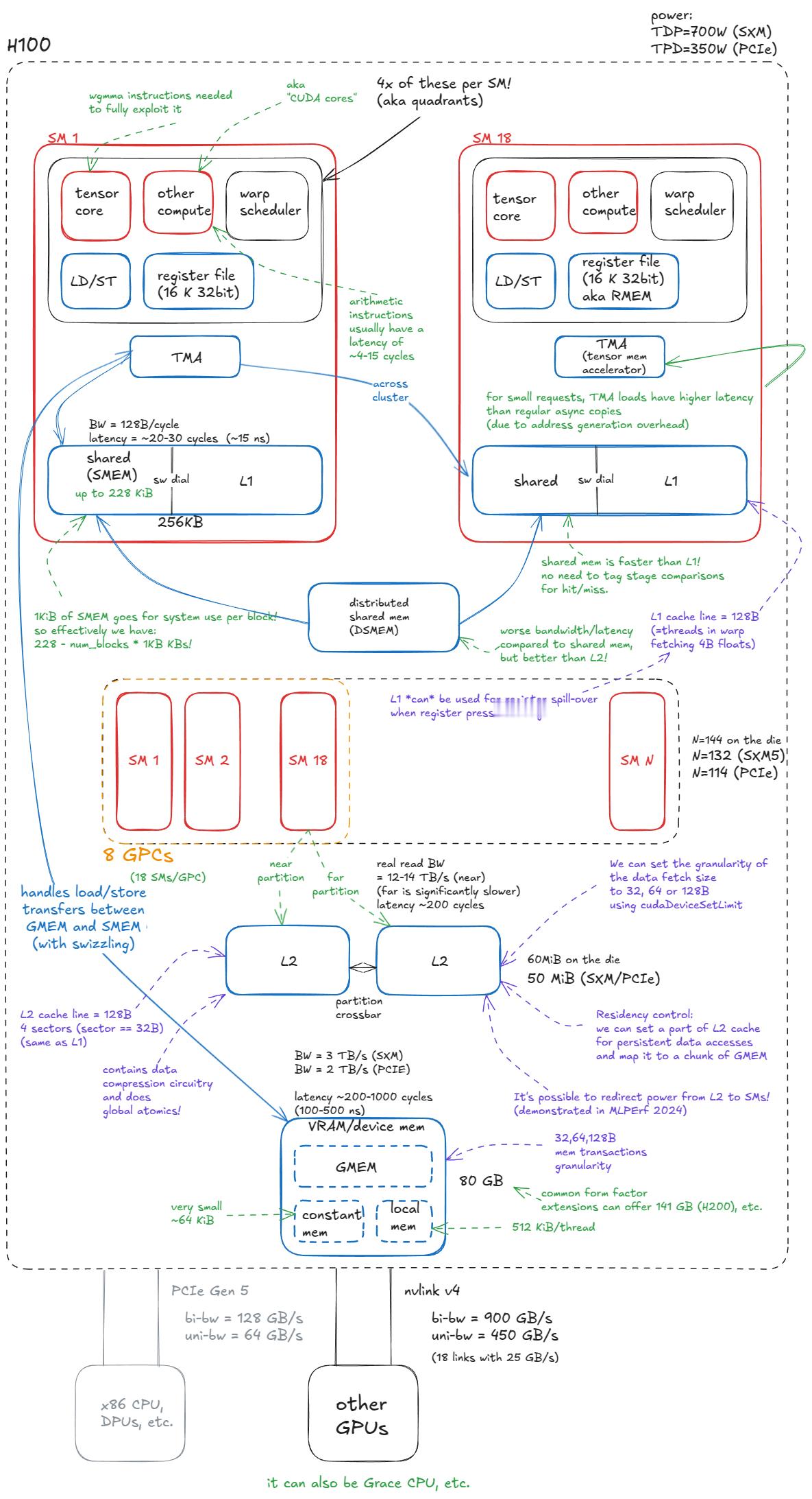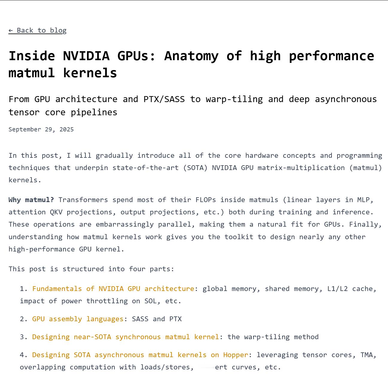 长篇博文: 深入 NVIDIA GPU:高性能矩阵乘法内核剖析www.aleksagordic.com/blog/matmul"在这篇文章中,我将逐步介绍支撑最先进(SOTA)NVIDIA GPU 矩阵乘法(matmul)内核的所有核心硬件概念和编程技术。为什么关注矩阵乘法? Transformer 模型在训练和推理过程中,其绝大部分浮点运算(FLOPs)都消耗在矩阵乘法上(例如 MLP 中的线性层、Attention 的 QKV 投影、输出投影等)。这些操作本质上是高度并行(embarrassingly parallel)的,因此与 GPU 天然契合。最后,理解矩阵乘法内核的工作原理,将为你提供设计几乎任何其他高性能 GPU 内核所需的工具包。本文分为四个部分:1️⃣NVIDIA GPU 架构基础: 全局内存、共享内存、L1/L2 缓存、功耗节流(power throttling)对光速极限(SOL)的影响等。2️⃣GPU 汇编语言: SASS 和 PTX。3️⃣设计接近 SOTA 的同步矩阵乘法内核: Warp 分块(warp-tiling)方法。4️⃣在 Hopper 架构上设计 SOTA 异步矩阵乘法内核: 利用 Tensor Cores、TMA(Tensor Memory Accelerator)、计算与加载/存储重叠、希尔伯特曲线(Hilbert curves)等。我的目标是让这篇文章自成一体:细节丰富足以独立成篇,同时足够精炼,避免写成一本教科书。"科技先锋官AI创造营