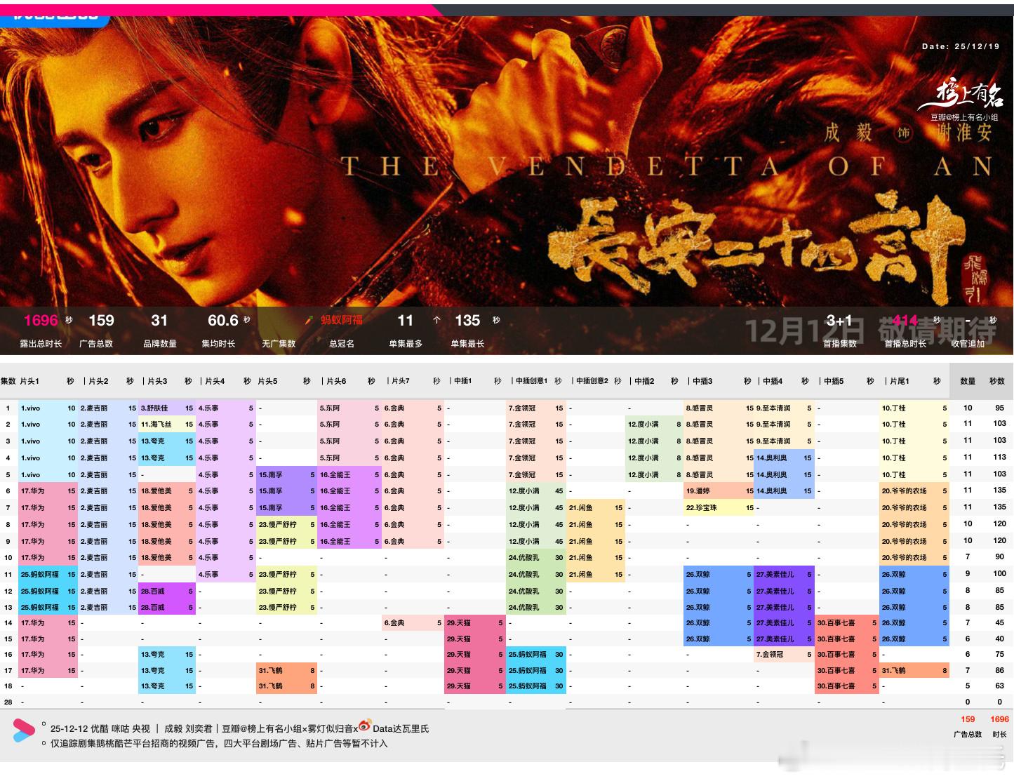 成毅长安二十四计横盘5天 昨晚(周五)优酷热度9670,依然是9600+,周六日热度能破万吗?招商最新单集5广63s总冠名:蚂蚁阿福31品牌,159广,总时长1696s酷云收视率集均1.1052%看了下出品公司,十几家,感觉分摊到每家也不会亏太多 全网热点共创计划