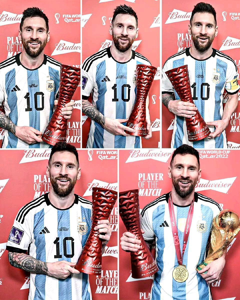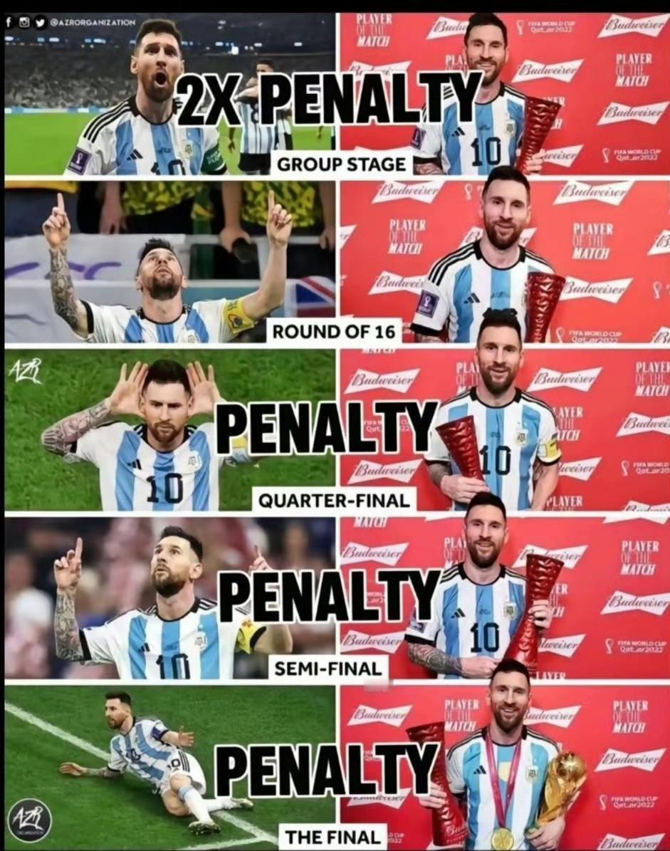 没有任何一个球员在一届世界杯上获得过五次点球。 也从未有任何球员在同一届世界杯中五次荣膺 “全场最佳”。 从21年夏天开始梅西的命真是硬到了极点,冠军拿到手软。 21年美洲杯对哥伦比亚大马丁横空出世; 22年世界杯小组赛首场就输给沙特,通过7场5点硬是捧得世界杯; 23年北美联赛杯两次进入点球大战; 24年美洲杯决赛伤退泪洒赛场。