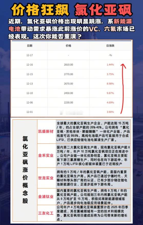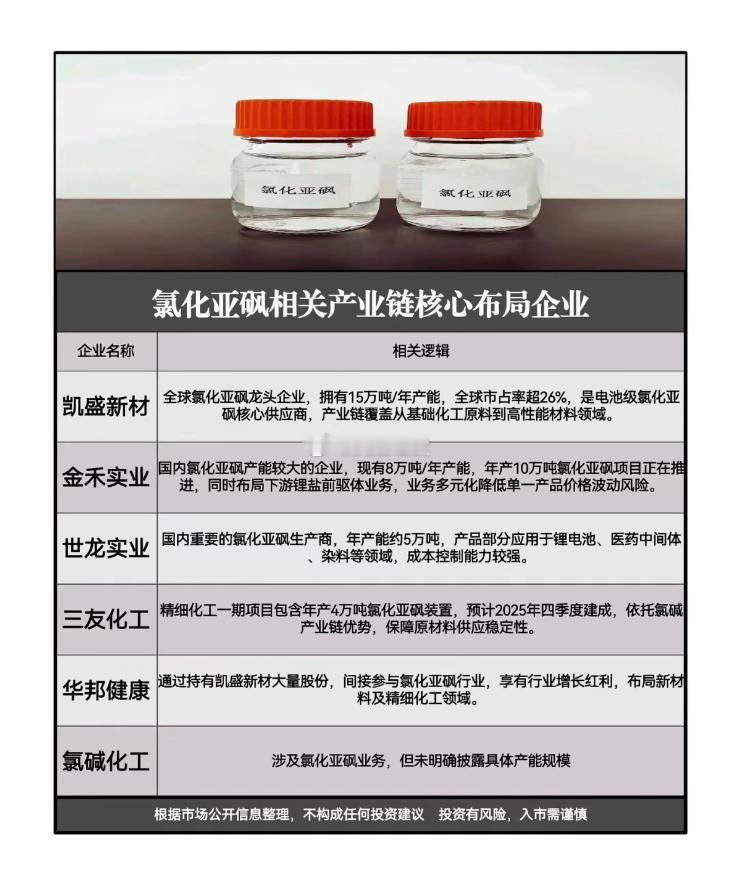 氯化亚砜价格持续上涨,相关产业链企业受益明显近期,锂电池电解液关键添加剂VC(碳酸亚乙烯酯)的核心原料——氯化亚砜价格快速上涨。受动力电池、储能行业需求拉动,VC作为提升电池循环寿命和安全性的重要添加剂,需求持续增长,进而推动氯化亚砜供需趋紧,价格进入上升通道。以下为相关产业链重点企业梳理:$凯盛新材 sz301069$ (隶属华邦健康)国内氯化亚砜主要生产企业,产能规模行业领先,并持续向VC等下游高附加值产品延伸,具备一体化布局优势。$天赐材料 sz002709$ 电解液行业龙头,具备VC产能及氯化亚砜配套能力,产业链协同效应显著,成本控制能力强。$新宙邦 sz300037$ 电解液及核心添加剂领域技术领先,持续推进原料供应链整合,受原材料价格上涨影响相对可控。$瑞联新材 sh688550$ 业务涵盖电解液功能材料及中间体,逐步延伸至新能源材料领域,受益于行业景气度提升。行业逻辑:氯化亚砜价格上涨主要受下游新能源需求拉动、环保限产及产能集中度较高等因素影响。未来随着电池性能要求提升,具备原料产能、技术优势及产业链协同能力的企业有望进一步巩固竞争力。注:以上内容基于公开信息整理,不构成投资建议。市场有风险,决策需谨慎。