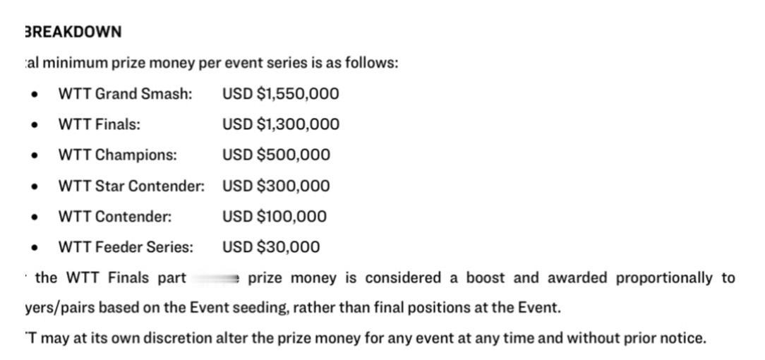 2026年赛季WTT各项比赛奖金数量底线公布。 大满贯赛不低于155W美金。 总决赛,2025年的是80W追加50W,2026年直接规定不低于130W美金。 冠军赛50W, 球星挑战赛30W, 常规挑战赛10W, 支线赛3W。