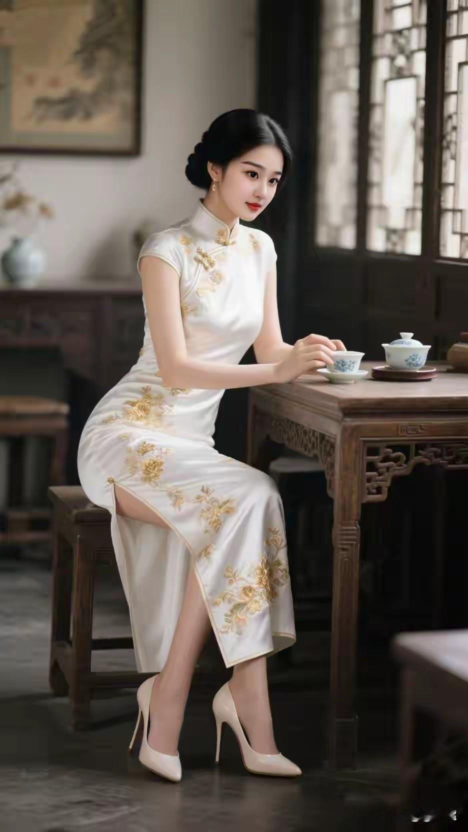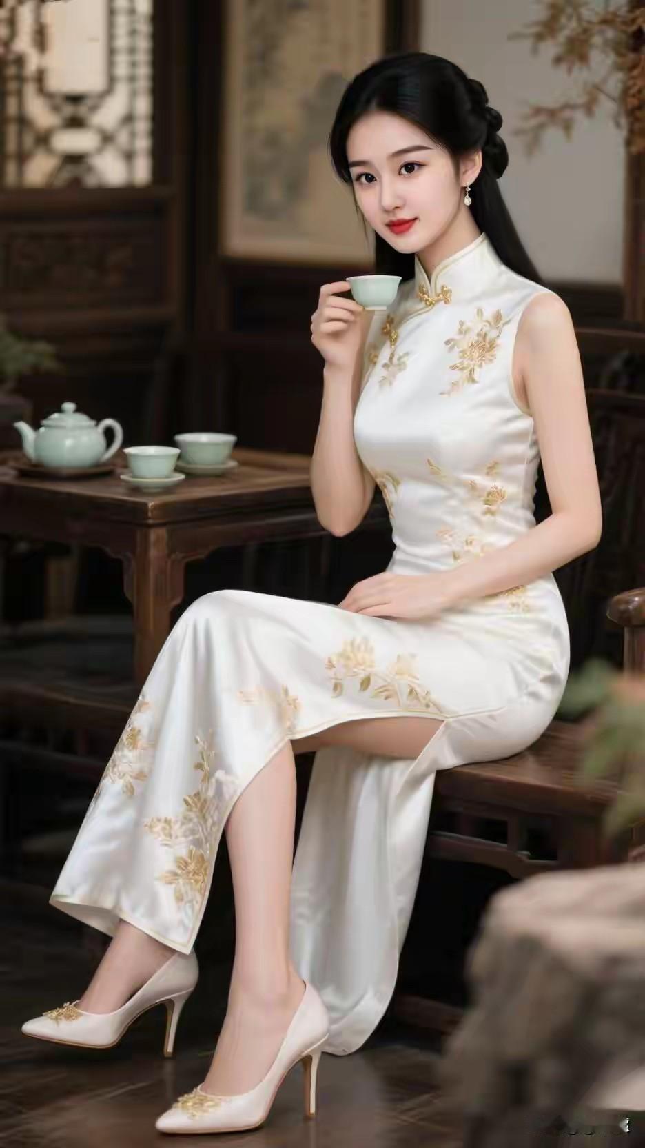 一袭白色旗袍, 酿尽东方温婉。 当象牙白,真丝旗袍 金绣枝莲,衣摆蜿蜒, 东方女子,优雅模样 旗袍韵致,女性温婉 一捧清茶,古雅茶舍 清新淡雅,缓缓漾开