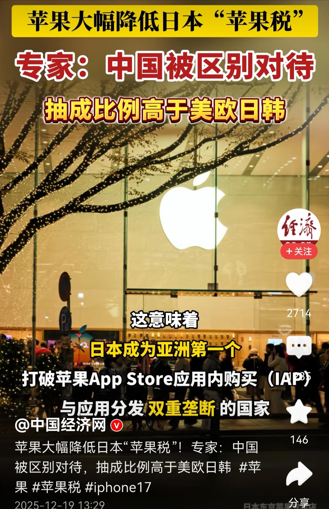 *苹果税在日本直接大降价!这对咱们中国老百姓来说,可是个实打实的信号!最近日本刚出的新规一落地,苹果立马就改了当地的“苹果税”规矩,反应快得让人意外,态度乖得不行,不少人都看愣了。   可能还有人不清楚“苹果税”到底啥意思,说白了就是用iPhone买会员、充游戏、打赏主播,苹果都要从里面抽一笔钱,以前普遍是30%,小团队能降到15%。   这钱不是真的税,就是苹果App Store的“过路费”,但对做App的人来说,可是实实在在少赚了不少。   为啥苹果对日本这么配合,还不是因为日本是苹果的“宝地”,公开数据显示苹果在日本的市场份额接近一半,几乎每两部手机里就有一部是iPhone,而且当地一款热门iPhone机型出货量同比涨了38%。   再加上日本的新规管得特别细,比如不能吓唬用户说第三方支付不安全,不能对用其他支付的开发者多收钱,苹果要是不配合,损失可就大了,对比之前面对其他地区的约束还上诉,这次是真不敢硬刚。   这次苹果在日本的调整是真给力,开发者现在有三种付钱方式可选:在App里用当地常用的支付工具,苹果抽10%-21%。   引导用户去官网付钱,抽10%-15%;要是直接从其他应用商店装App,苹果只收5%的技术费。   对比以前30%的抽成,相当于直接打了对折还多,比如一个小游戏团队一年赚1000万,以前要给苹果交300万,现在最多交210万,多出来的钱就能搞新功能,最后受益的还是用户。   这时候肯定有人想问,咱们国内咋还没这待遇,要知道在苹果全球前四大赚钱市场里,现在只有中国还维持着30%、15%的“高过路费”,还不让用第三方支付、不能从外面装App。   生活里常能碰到这种情况:同一款App的iOS会员价比安卓贵不少,不是开发者想涨价,是不涨价就没利润。   有记录可查,国内一款热门游戏在iOS端一年营收十几亿美元,光给苹果交的“过路费”就有好几亿美元。   之前还有开发者试着引导用户去官网充值,结果被苹果停了支付功能,最后只能作罢。   其实这不是巧合,现在全球都在管“苹果税”这事,不少国家早就让苹果开放更多支付方式、降低抽成了,有的降到10%,有的甚至允许零佣金。   日本这一波操作,等于又给全球趋势添了把火,而中国作为苹果第二大赚钱市场,没理由一直“特殊”下去。   而且中国市场已经有变化信号了:有消费者反映过苹果的问题,也有大公司和苹果谈妥,把部分产品的分成降到了15%,这可能就是个开始。   再看数据,苹果在国内的营收去年降了3.8%,今年前几周手机销量也跌了不少,而咱们本土的鸿蒙系统市场份额已经涨到18%,超过了iOS。   对苹果来说,要是还死守30%的抽成,开发者都没利润了,没人愿意做App,iPhone的吸引力也会打折扣。   可能有人觉得苹果降佣会亏大钱?其实这笔账很明白:2024年中国市场的“苹果税”总额大概64亿美元,占苹果总营收的比例也就1%左右。   就算降10%的抽成,苹果一年少赚的钱,对比它全年2.7万亿的总营收,根本不算啥。   但换来的好处却很大:国内近60万苹果开发者能减轻负担,说不定会有更多新App出来,要知道这几年国内活跃App数量跌了42%,高佣金也是重要原因。   对普通老百姓来说,要是苹果在中国也降佣,直接好处就是iOS端的会员、游戏充值可能会更便宜,不用再“买得起iPhone,用不起服务”。   第三方支付开放后,用微信、支付宝直接付钱也方便,不用绕来绕去。   而且苹果一降,国内其他手机的应用商店说不定也会跟着下调抽成,最后大家都受益。   当然,苹果在中国会不会跟进、啥时候跟进,还得看市场和各种约束的情况,但日本的例子已经说明,只要有明确的规矩,大公司也会妥协。   现在国内对大平台的规范越来越明确,苹果不可能无视这个趋势,毕竟中国不仅是卖手机的重镇,更是很多开发者的大本营,没了开发者支持,iPhone也会少很多吸引力。   日本苹果税降价不是孤立的事,而是高额“数字过路费”的时代要过去了。   对中国市场来说,信号很明确:公平竞争才是长久之道,大家觉得苹果啥时候会给国内也降税?评论区聊聊~