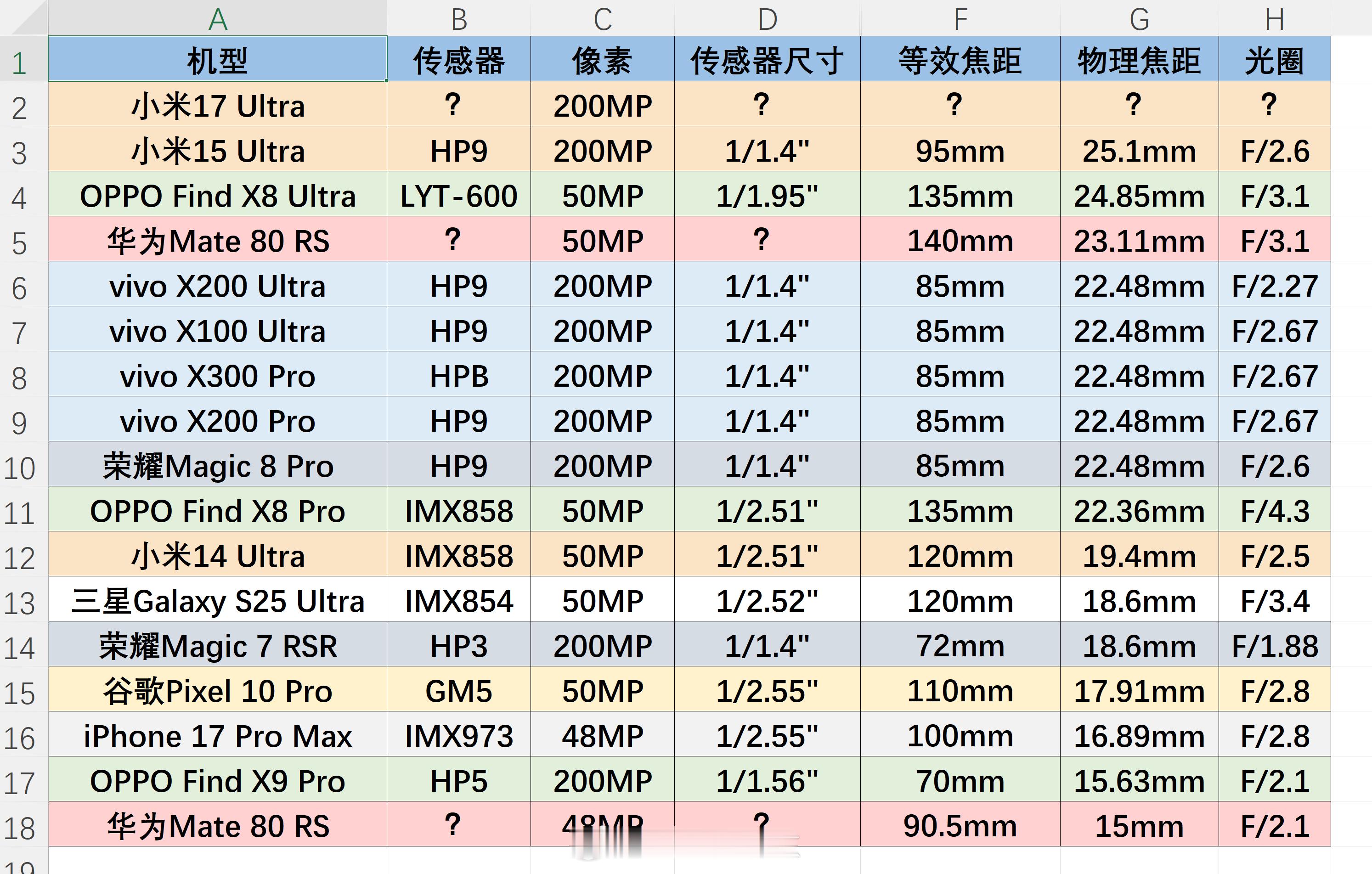 整理了下目前主流手机长焦的规格参数,如图,目前物理焦距最长的就是小米15 Ultra,你们猜接下来的小米17 Ultra 会不会再超越?
