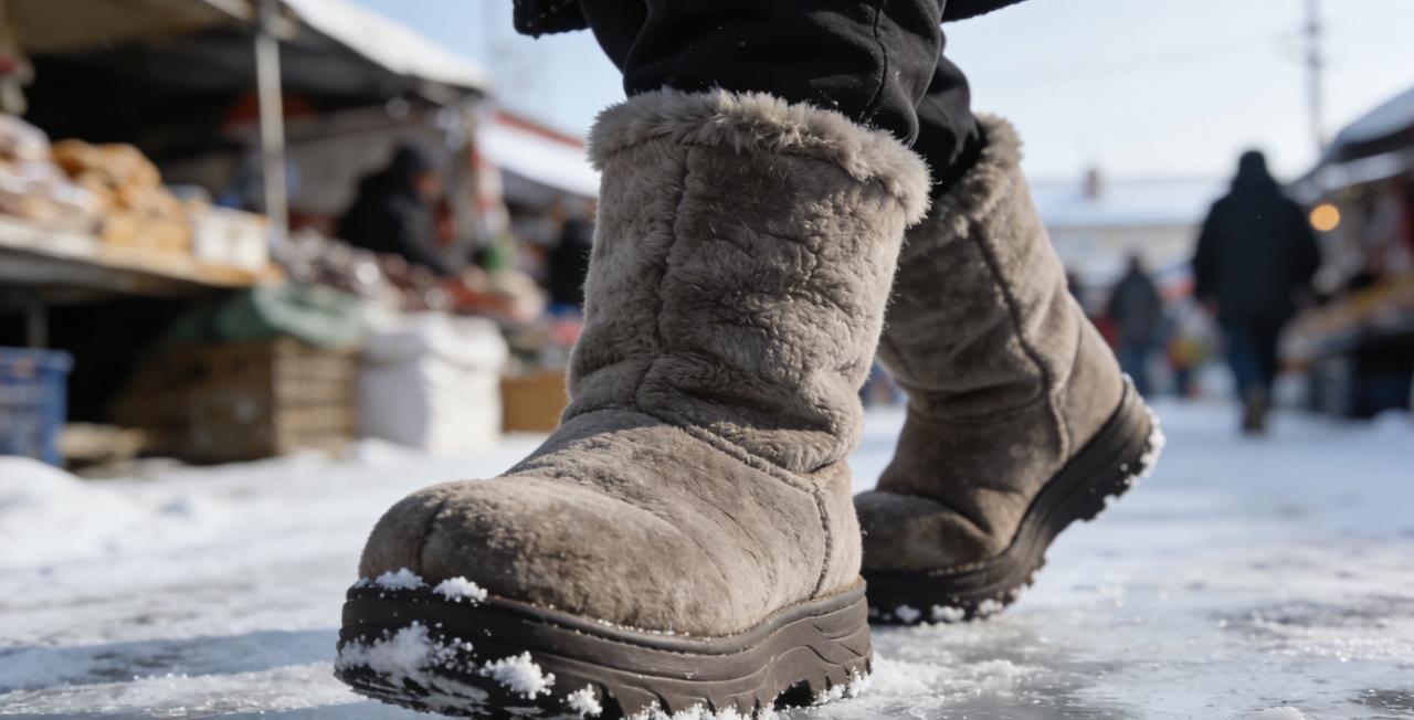 黑河早市的“巨鞋奇观” 寒意浸骨的黑河早市上,有一幕奇景总能勾住路人的目光——不少赶集人的脚上,都蹬着一双尺码夸张的大棉鞋,看着足有百码开外。 这些鞋子不是什么新潮款式,鞋面缝着厚实的绒布,鞋底厚得像块小木板,走起路来带着沉甸甸的踏实感。摊主说,这是当地人过冬的“标配”,黑河冬日气温动辄跌破零下三十度,唯有这般宽大厚实的棉鞋,才能把整只脚裹得严严实实,任凭寒风呼啸,脚底板依旧暖烘烘的。 来往的大爷大妈踩着大鞋,在摊铺间穿梭选购冻梨、粘豆包,笨重的鞋子没碍着他们的脚步,反倒成了早市上一道独属于北国的烟火风景。