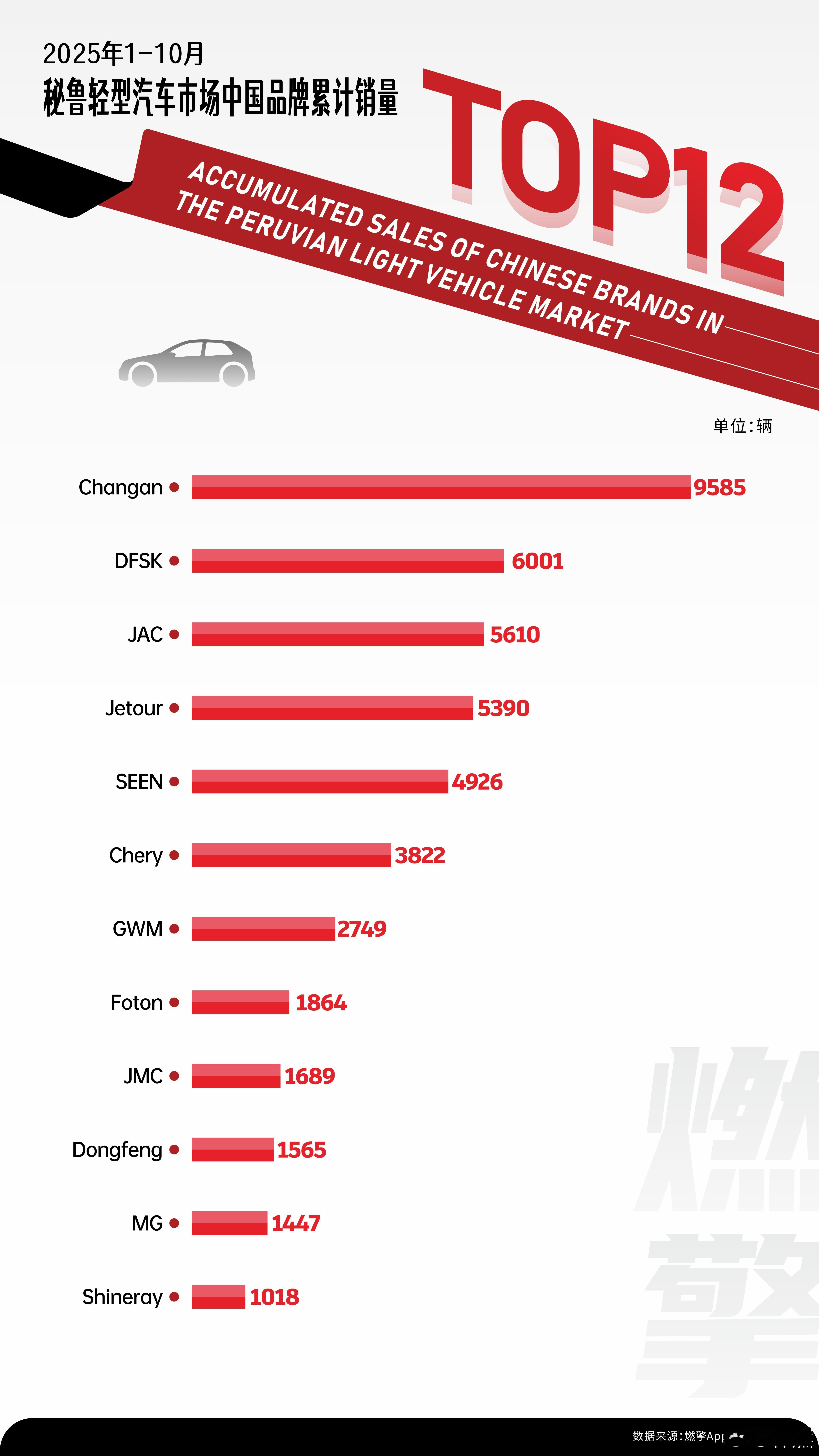 秘鲁轻型车市:中国品牌,乘商并重,长安第一2025年1-10月,中国汽车品牌在秘鲁轻型汽车市场展现出全面而深入的布局,形成了以长安为引领、多品牌协同发展的清晰格局。各品牌通过差异化的产品策略,精准覆盖了从家庭乘用到商业运输的多元场景,实现了对细分市场的深度渗透。长安以9585辆的累计销量显著领先,成为中国品牌在秘鲁市场的核心代表。其成功关键在于产品线与当地需求的高度契合:高性价比的SUV及经济型轿车,既能满足城市日常通勤,也适应了秘鲁部分乡村地区的路况特点。配合相对完善的本地化分销网络,长安确立了其在中国品牌阵营中的头部地位。多个中国品牌共同构建了完善的市场覆盖体系。在乘用车领域,DFSK(6001辆)、江淮(5610辆)、捷途(5390辆)等品牌,以经济实用的车型服务于普通家庭的出行刚需。与此同时,福田(1864辆)、JMC(1689辆)等品牌则专注于商用车领域,有效满足了当地日益增长的物流及货物运输需求。各品牌通过清晰的差异化定位,占据了不同的细分市场空间。例如,长安与捷途侧重于提供配置更丰富的中端车型;DFSK与江淮则聚焦于入门级经济型市场;奇瑞与长城汽车主要凭借SUV产品满足家庭对空间的需求;而福田、JMC等则深耕于专业的商用细分领域。总体而言,中国品牌在秘鲁市场已构建起“乘商并重”的完整产品矩阵。通过这种互补协同的差异化布局,各品牌不仅避免了同质化竞争,更共同推动了中国汽车整体在秘鲁市场影响力的持续深化与扩大。大v聊车