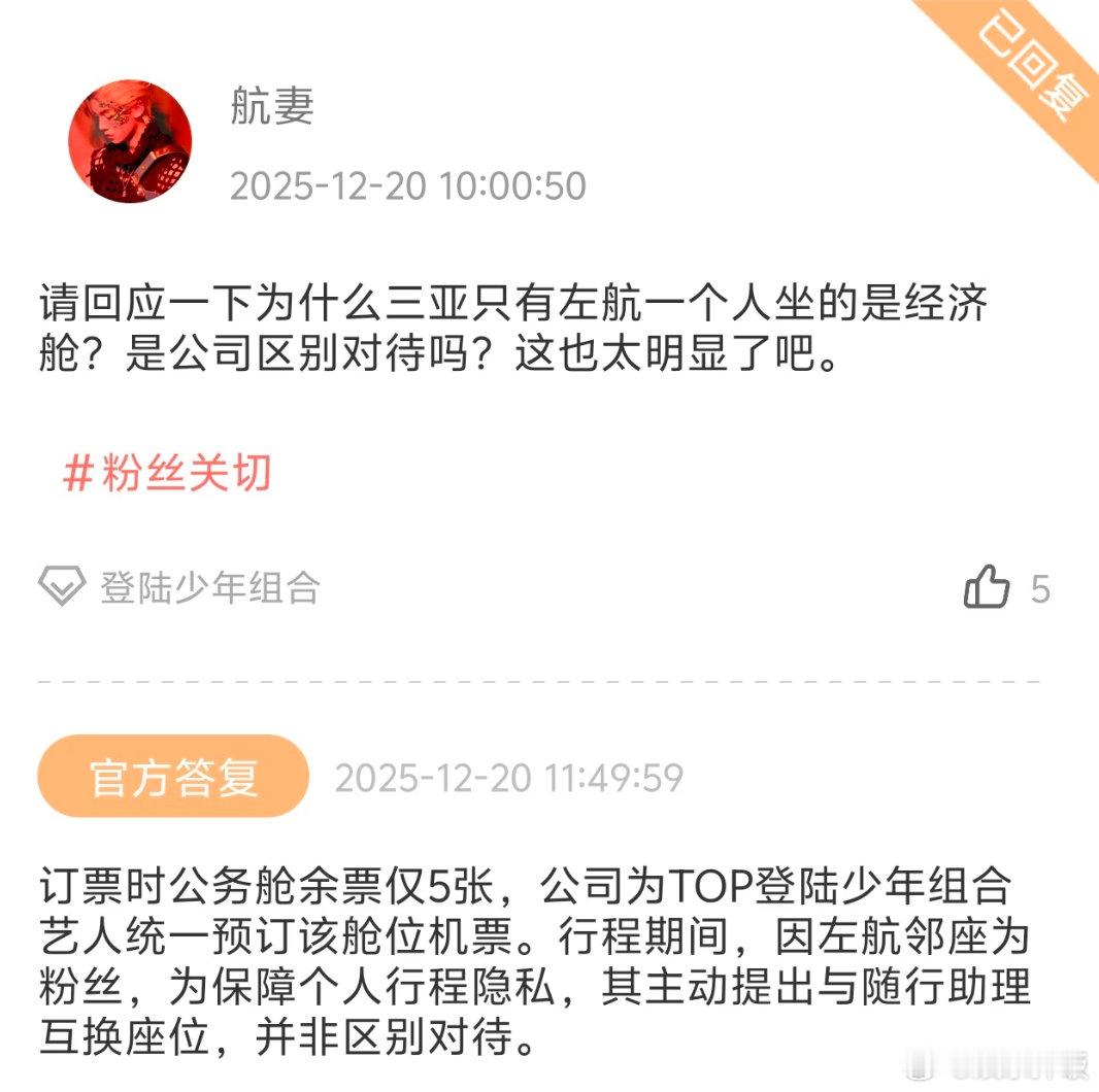 时代峰峻回应左航坐经济舱 时代峰峻回应了左航坐经济舱的事情,说本来订票的时候就在只剩了五张商务舱的票,因为左航的位置周围有私生所以左航主动提出要和在经济舱的工作人员换座位,听起来好像还挺合理的感觉是私生的问题啊,跟公司安排没什么太大的关系吧跨年热梗制造机左航坐经济舱