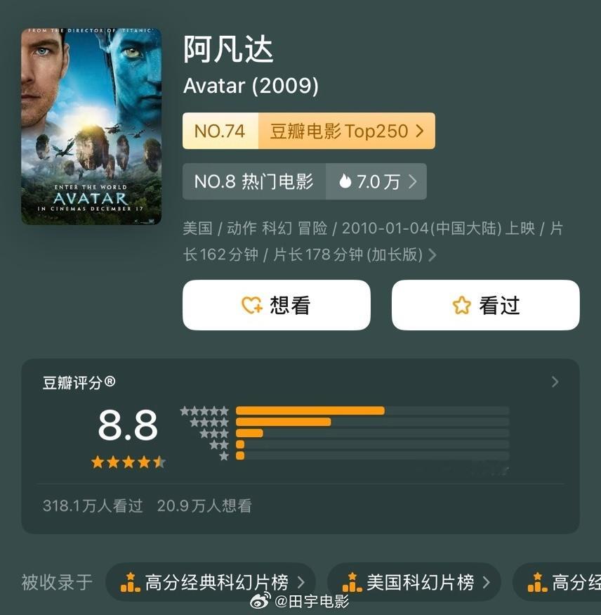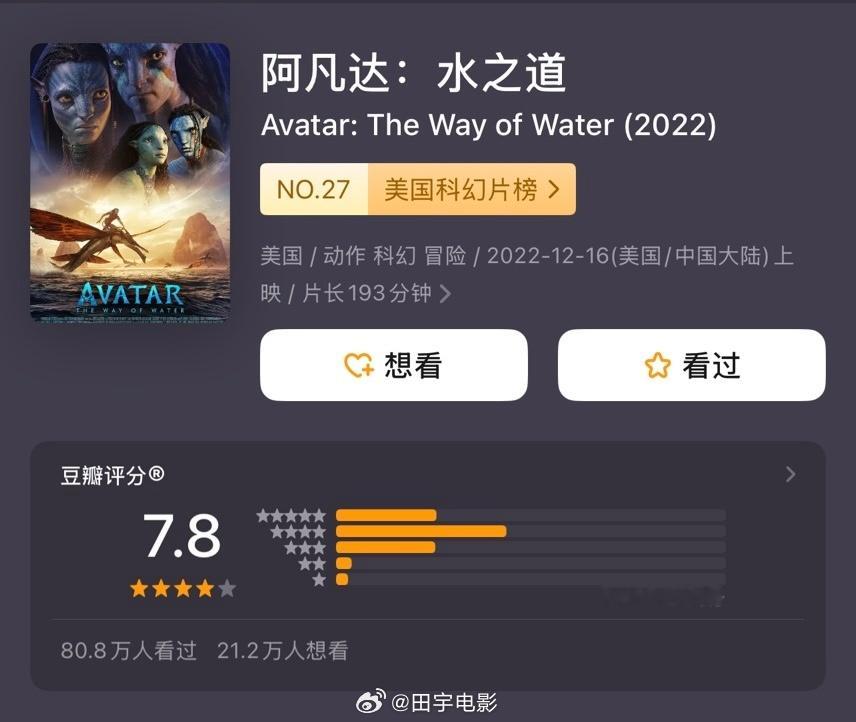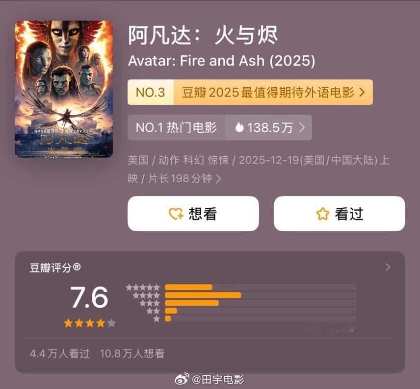 阿凡达3豆瓣分数7.6《阿凡达3》DB开分了,是三部里最低的,《阿凡达1》8.8、《阿凡达:水之道》7.8、《阿凡达3》7.6。它在我心目中是系列最佳,剧情一般,但人物关系的链接,片子的人文意义,是超过前两部的,抛开评分,电影院里看的人还是蛮多的,IMAX基本场场爆满。无论最终票房怎样,影迷看着爽就是成功,祝《阿凡达3》票房大卖,卡神大写的牛!跨年电影愿