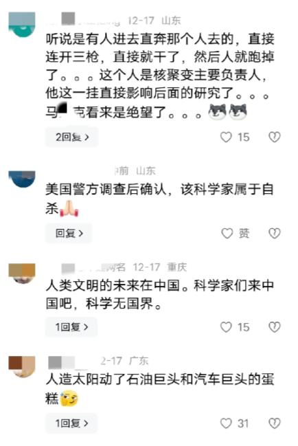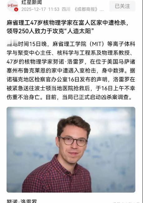美国的核聚变首席科学家被枪杀了,这个麻省理工大学的物理学家,带领一个几百人的科学家团队在攻克核聚变技术,俗称人造太阳,这个技术如果成功可以让人类获得无限廉价的能源,也是目前我们和美国竞争最激烈的科技项目。   美国核聚变领域这下是真的炸了锅,不是技术突破的喜报,而是惊天血案——麻省理工大学那位核聚变首席科学家,直接让人给枪杀了!   可能有人还没概念,这位可不是普通的科研人员,手里领着几百人的顶尖团队,干的是“人造太阳”的大事,说白了就是攻克核聚变技术。   这技术要是真成了,人类相当于拿到了无限廉价的能源,从此不用再为石油、天然气这些玩意儿发愁,电费可能便宜到让人不敢想,这可不是吹牛,全球业内都把这当成能源革命的终极方向。   更关键的是,现在中美在核聚变领域正拼得你死我活,这是最核心的科技竞争赛道之一,谁先突破谁就掌握了未来能源的话语权,这位科学家就是美国在这条赛道上的领头人,结果就这么不明不白地没了。   为啥说他的死大概率不是简单的刑事案件?核心就俩字:利益,天大的利益。核聚变技术一旦成功,第一个被掀桌子的就是老派的化石能源巨头,那些靠石油、煤炭、天然气发家的资本大佬,资产得蒸发一大半,几十年的垄断地位直接归零。   你以为这就完了?新派的新能源行业也得跟着倒霉,就是咱们平时听说的光伏发电、风能、太阳能这些。   可能有人觉得新能源不是清洁能源吗?咋还怕核聚变?道理很简单,新能源看似环保,但有天生的短板,光伏靠天吃饭,晚上没太阳就歇菜,风能得看风向,稳定性差还不算,成本也不低。   可核聚变不一样,一旦商业化,能源几乎零成本还能24小时稳定供应,到时候谁还会费劲巴力搞光伏、建风电场?那些铺了大片光伏板、投了巨资建风电站的老板,手里的资产不就成了一堆废铁?   这事儿有意思就有意思在时间点上,就在这位科学家被杀前不久,马圣才刚公开说核聚变是个圈套。   稍微了解点行情的都知道,马圣才是美国新能源圈的大佬,手里攥着大量光伏发电项目,说白了就是靠光伏吃饭的。   他这话里的猫腻谁都能看出来,哪是说核聚变是圈套,分明是怕核聚变成功了,自己的光伏产业彻底凉了。   他嘴里喊着“圈套”,心里想的全是自己的钱袋子,毕竟投入那么多真金白银建光伏电站,要是核聚变来了,这些投资就全打了水漂,换谁谁不急?   当时还有人觉得马圣才是危言耸听,为了自己的产业故意抹黑核聚变,结果没想到,他的话音刚落没几天,这边领头搞核聚变的科学家就被人枪杀了,这巧合得也太离谱了,离谱到让人根本没法往巧合上想。   咱们用脚指头想都能猜到,谁最想让这位科学家消失?无非就是那些被核聚变动了蛋糕的人。   老派化石能源巨头有的是钱,手眼通天,这些年为了维护自己的利益,干过的脏事还少吗?只要能保住垄断地位,花钱雇人搞点小动作根本不算事儿。   而马圣才代表的新能源派,同样有足够的动机,毕竟核聚变一成,他们的光伏产业就彻底没了活路,这可是关乎身家性命的利益之争。   这两拨人,随便哪一拨都有能力策划这样一场谋杀,毕竟除掉了领头的科学家,美国的核聚变项目至少得停滞好几年,甚至可能直接黄了,他们的利益就能暂时保住。   更让人觉得讽刺的是,这位科学家带领的团队,本来已经在核聚变领域取得了不少突破,距离真正的商业化应用越来越近,中美在这方面的竞争也到了白热化阶段。   咱们国家在核聚变领域也投入了大量精力,进展一点不比美国慢,本来是一场公平的科技竞赛,结果美国这边直接用这种下三滥的手段“釜底抽薪”。   这哪是科技竞争,分明是流氓行径,打不过就搞人身消灭,说出去都让人笑话。   可笑话归笑话,这事背后暴露的是美国资本利益集团的贪婪和霸道,只要谁敢动他们的奶酪,不管你是科学家还是企业家,都可能遭遇不测。   现在大家最关心的就是调查结果,但说句实在话,别对美国警察抱太大希望。   熟悉美国套路的都知道,只要涉及到资本巨头的利益,很多案件最后都会不了了之,要么找个替罪羊,要么就往“自杀”上靠。   之前美国就出过不少离谱的“自杀”案件,有的受害者后背中了好几枪,最后被警方认定为自杀,简直是把所有人当傻子。   这次的案件,涉及到这么大的利益纠葛,背后的势力肯定不会让真相曝光。   估计最后警方调查来调查去,还是会给出一个让人啼笑皆非的结果,说不定就是“死者系自杀,枪击为自己操作失误”,反正怎么离谱怎么来,只要能把这事儿压下去就行。