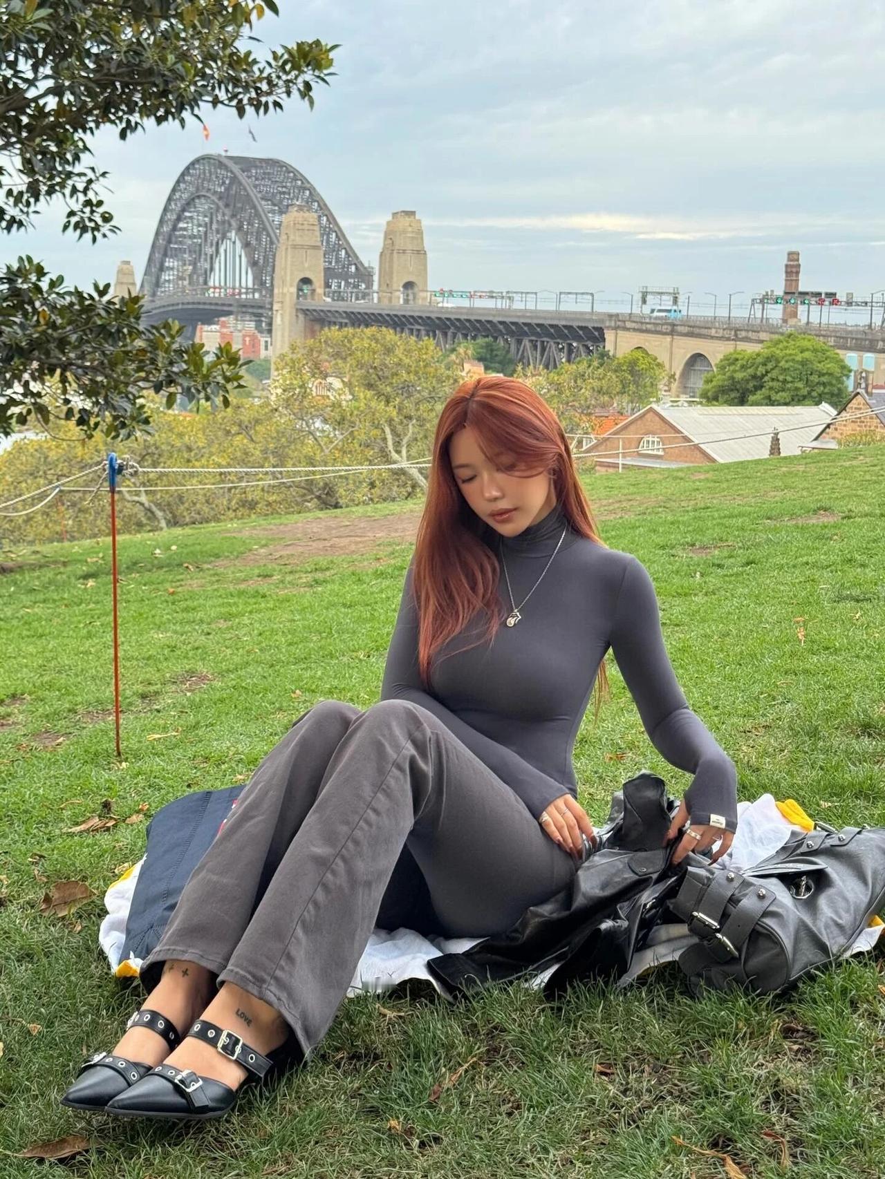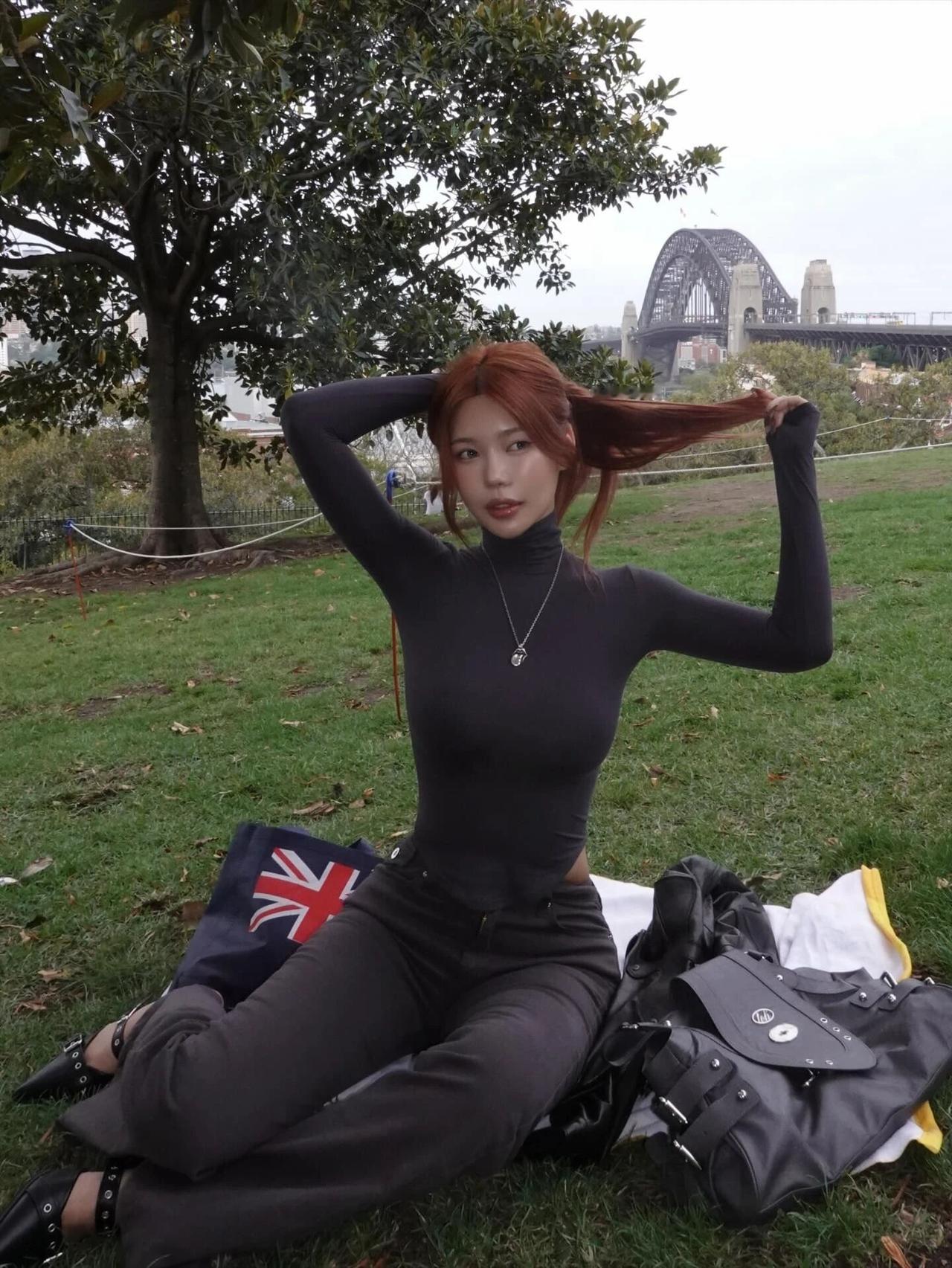 港湾大桥当背景板,草坪上的随性定格,红棕发色和全黑穿搭的适配度满分